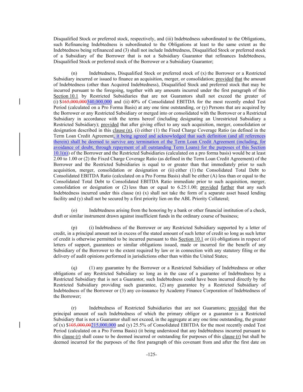 Disqualified Stock or preferred stock, respectively, and (iii) Indebtedness subordinated to the Obligations, such Refinancing Indebtedness is subordinated to the Obligations at least to the same extent as the Indebtedness being refinanced and (3) shall not include Indebtedness, Disqualified Stock or preferred stock of a Subsidiary of the Borrower that is not a Subsidiary Guarantor that refinances Indebtedness, Disqualified Stock or preferred stock of the Borrower or a Subsidiary Guarantor; (n) Indebtedness, Disqualified Stock or preferred stock of (x) the Borrower or a Restricted Subsidiary incurred or issued to finance an acquisition, merger, or consolidation; provided that the amount of Indebtedness (other than Acquired Indebtedness), Disqualified Stock and preferred stock that may be incurred pursuant to the foregoing, together with any amounts incurred under the first paragraph of this Section 10.1 by Restricted Subsidiaries that are not Guarantors shall not exceed the greater of (i) $165,000,000340,000,000 and (ii) 40% of Consolidated EBITDA for the most recently ended Test Period (calculated on a Pro Forma Basis) at any one time outstanding, or (y) Persons that are acquired by the Borrower or any Restricted Subsidiary or merged into or consolidated with the Borrower or a Restricted Subsidiary in accordance with the terms hereof (including designating an Unrestricted Subsidiary a Restricted Subsidiary); provided that after giving effect to any such acquisition, merger, consolidation or designation described in this clause (n), (i) either (1) the Fixed Charge Coverage Ratio (as defined in the Term Loan Credit Agreement, it being agreed and acknowledged that such definition (and all references therein) shall be deemed to survive any termination of the Term Loan Credit Agreement (including, for avoidance of doubt, through repayment of all outstanding Term Loans) for the purposes of this Section 10.1(n)) of the Borrower and the Restricted Subsidiaries (calculated on a pro forma basis) would be at least 2.00 to 1.00 or (2) the Fixed Charge Coverage Ratio (as defined in the Term Loan Credit Agreement) of the Borrower and the Restricted Subsidiaries is equal to or greater than that immediately prior to such acquisition, merger, consolidation or designation or (ii) either (1) the Consolidated Total Debt to Consolidated EBITDA Ratio (calculated on a Pro Forma Basis) shall be either (A) less than or equal to the Consolidated Total Debt to Consolidated EBITDA Ratio immediate prior to such acquisition, merger, consolidation or designation or (2) less than or equal to 6.25:1.00; provided further that any such Indebtedness incurred under this clause (n) (x) shall not take the form of a separate asset based lending facility and (y) shall not be secured by a first priority lien on the ABL Priority Collateral; (o) Indebtedness arising from the honoring by a bank or other financial institution of a check, draft or similar instrument drawn against insufficient funds in the ordinary course of business; (p) (i) Indebtedness of the Borrower or any Restricted Subsidiary supported by a letter of credit, in a principal amount not in excess of the stated amount of such letter of credit so long as such letter of credit is otherwise permitted to be incurred pursuant to this Section 10.1 or (ii) obligations in respect of letters of support, guarantees or similar obligations issued, made or incurred for the benefit of any Subsidiary of the Borrower to the extent required by law or in connection with any statutory filing or the delivery of audit opinions performed in jurisdictions other than within the United States; (q) (1) any guarantee by the Borrower or a Restricted Subsidiary of Indebtedness or other obligations of any Restricted Subsidiary so long as in the case of a guarantee of Indebtedness by a Restricted Subsidiary that is not a Guarantor, such Indebtedness could have been incurred directly by the Restricted Subsidiary providing such guarantee, (2) any guarantee by a Restricted Subsidiary of Indebtedness of the Borrower or (3) any co-issuance by Academy Finance Corporation of Indebtedness of the Borrower; (r) Indebtedness of Restricted Subsidiaries that are not Guarantors; provided that the principal amount of such Indebtedness of which the primary obligor or a guarantor is a Restricted Subsidiary that is not a Guarantor shall not exceed, in the aggregate at any one time outstanding, the greater of (x) $105,000,00215,000,000 and (y) 25.5% of Consolidated EBITDA for the most recently ended Test Period (calculated on a Pro Forma Basis) (it being understood that any Indebtedness incurred pursuant to this clause (r) shall cease to be deemed incurred or outstanding for purposes of this clause (r) but shall be deemed incurred for the purposes of the first paragraph of this covenant from and after the first date on -125-