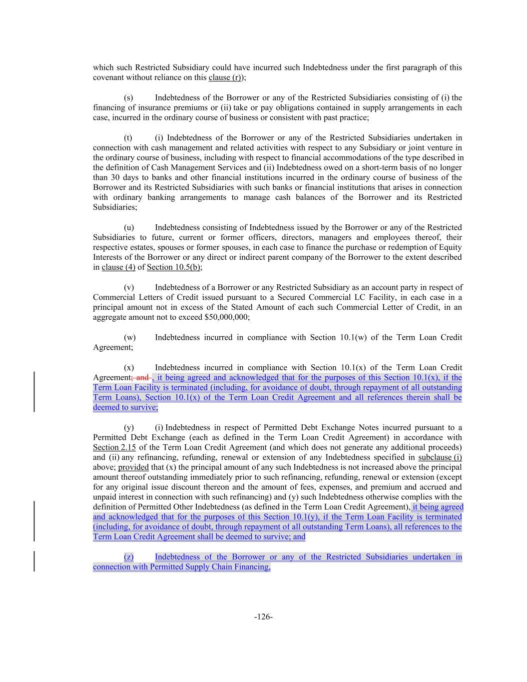 which such Restricted Subsidiary could have incurred such Indebtedness under the first paragraph of this covenant without reliance on this clause (r)); (s) Indebtedness of the Borrower or any of the Restricted Subsidiaries consisting of (i) the financing of insurance premiums or (ii) take or pay obligations contained in supply arrangements in each case, incurred in the ordinary course of business or consistent with past practice; (t) (i) Indebtedness of the Borrower or any of the Restricted Subsidiaries undertaken in connection with cash management and related activities with respect to any Subsidiary or joint venture in the ordinary course of business, including with respect to financial accommodations of the type described in the definition of Cash Management Services and (ii) Indebtedness owed on a short-term basis of no longer than 30 days to banks and other financial institutions incurred in the ordinary course of business of the Borrower and its Restricted Subsidiaries with such banks or financial institutions that arises in connection with ordinary banking arrangements to manage cash balances of the Borrower and its Restricted Subsidiaries; (u) Indebtedness consisting of Indebtedness issued by the Borrower or any of the Restricted Subsidiaries to future, current or former officers, directors, managers and employees thereof, their respective estates, spouses or former spouses, in each case to finance the purchase or redemption of Equity Interests of the Borrower or any direct or indirect parent company of the Borrower to the extent described in clause (4) of Section 10.5(b); (v) Indebtedness of a Borrower or any Restricted Subsidiary as an account party in respect of Commercial Letters of Credit issued pursuant to a Secured Commercial LC Facility, in each case in a principal amount not in excess of the Stated Amount of each such Commercial Letter of Credit, in an aggregate amount not to exceed $50,000,000; (w) Indebtedness incurred in compliance with Section 10.1(w) of the Term Loan Credit Agreement; (x) Indebtedness incurred in compliance with Section 10.1(x) of the Term Loan Credit Agreement; and , it being agreed and acknowledged that for the purposes of this Section 10.1(x), if the Term Loan Facility is terminated (including, for avoidance of doubt, through repayment of all outstanding Term Loans), Section 10.1(x) of the Term Loan Credit Agreement and all references therein shall be deemed to survive; (y) (i) Indebtedness in respect of Permitted Debt Exchange Notes incurred pursuant to a Permitted Debt Exchange (each as defined in the Term Loan Credit Agreement) in accordance with Section 2.15 of the Term Loan Credit Agreement (and which does not generate any additional proceeds) and (ii) any refinancing, refunding, renewal or extension of any Indebtedness specified in subclause (i) above; provided that (x) the principal amount of any such Indebtedness is not increased above the principal amount thereof outstanding immediately prior to such refinancing, refunding, renewal or extension (except for any original issue discount thereon and the amount of fees, expenses, and premium and accrued and unpaid interest in connection with such refinancing) and (y) such Indebtedness otherwise complies with the definition of Permitted Other Indebtedness (as defined in the Term Loan Credit Agreement), it being agreed and acknowledged that for the purposes of this Section 10.1(y), if the Term Loan Facility is terminated (including, for avoidance of doubt, through repayment of all outstanding Term Loans), all references to the Term Loan Credit Agreement shall be deemed to survive; and (z) Indebtedness of the Borrower or any of the Restricted Subsidiaries undertaken in connection with Permitted Supply Chain Financing, -126-