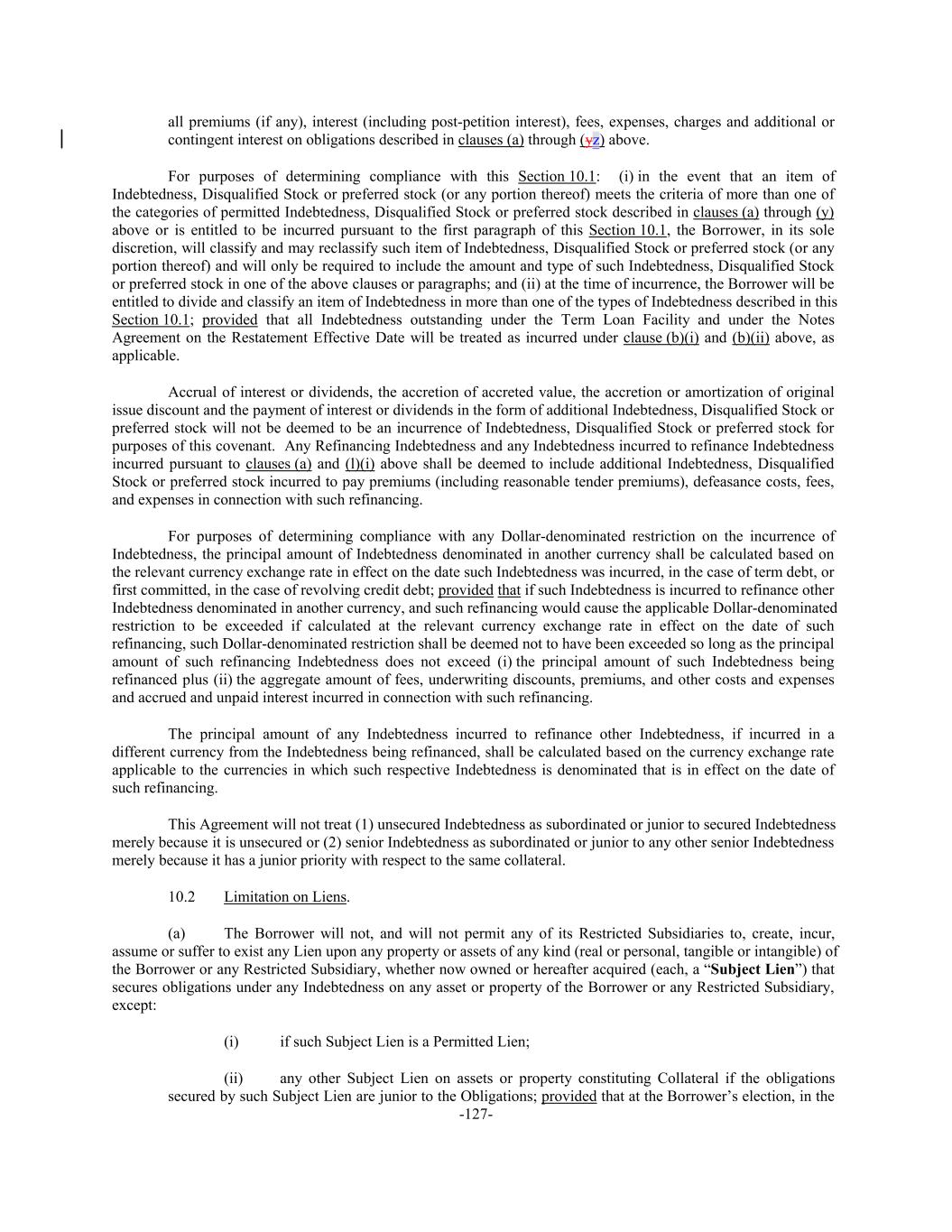 all premiums (if any), interest (including post-petition interest), fees, expenses, charges and additional or contingent interest on obligations described in clauses (a) through (yz) above. For purposes of determining compliance with this Section 10.1: (i) in the event that an item of Indebtedness, Disqualified Stock or preferred stock (or any portion thereof) meets the criteria of more than one of the categories of permitted Indebtedness, Disqualified Stock or preferred stock described in clauses (a) through (y) above or is entitled to be incurred pursuant to the first paragraph of this Section 10.1, the Borrower, in its sole discretion, will classify and may reclassify such item of Indebtedness, Disqualified Stock or preferred stock (or any portion thereof) and will only be required to include the amount and type of such Indebtedness, Disqualified Stock or preferred stock in one of the above clauses or paragraphs; and (ii) at the time of incurrence, the Borrower will be entitled to divide and classify an item of Indebtedness in more than one of the types of Indebtedness described in this Section 10.1; provided that all Indebtedness outstanding under the Term Loan Facility and under the Notes Agreement on the Restatement Effective Date will be treated as incurred under clause (b)(i) and (b)(ii) above, as applicable. Accrual of interest or dividends, the accretion of accreted value, the accretion or amortization of original issue discount and the payment of interest or dividends in the form of additional Indebtedness, Disqualified Stock or preferred stock will not be deemed to be an incurrence of Indebtedness, Disqualified Stock or preferred stock for purposes of this covenant. Any Refinancing Indebtedness and any Indebtedness incurred to refinance Indebtedness incurred pursuant to clauses (a) and (l)(i) above shall be deemed to include additional Indebtedness, Disqualified Stock or preferred stock incurred to pay premiums (including reasonable tender premiums), defeasance costs, fees, and expenses in connection with such refinancing. For purposes of determining compliance with any Dollar-denominated restriction on the incurrence of Indebtedness, the principal amount of Indebtedness denominated in another currency shall be calculated based on the relevant currency exchange rate in effect on the date such Indebtedness was incurred, in the case of term debt, or first committed, in the case of revolving credit debt; provided that if such Indebtedness is incurred to refinance other Indebtedness denominated in another currency, and such refinancing would cause the applicable Dollar-denominated restriction to be exceeded if calculated at the relevant currency exchange rate in effect on the date of such refinancing, such Dollar-denominated restriction shall be deemed not to have been exceeded so long as the principal amount of such refinancing Indebtedness does not exceed (i) the principal amount of such Indebtedness being refinanced plus (ii) the aggregate amount of fees, underwriting discounts, premiums, and other costs and expenses and accrued and unpaid interest incurred in connection with such refinancing. The principal amount of any Indebtedness incurred to refinance other Indebtedness, if incurred in a different currency from the Indebtedness being refinanced, shall be calculated based on the currency exchange rate applicable to the currencies in which such respective Indebtedness is denominated that is in effect on the date of such refinancing. This Agreement will not treat (1) unsecured Indebtedness as subordinated or junior to secured Indebtedness merely because it is unsecured or (2) senior Indebtedness as subordinated or junior to any other senior Indebtedness merely because it has a junior priority with respect to the same collateral. 10.2 Limitation on Liens. (a) The Borrower will not, and will not permit any of its Restricted Subsidiaries to, create, incur, assume or suffer to exist any Lien upon any property or assets of any kind (real or personal, tangible or intangible) of the Borrower or any Restricted Subsidiary, whether now owned or hereafter acquired (each, a “Subject Lien”) that secures obligations under any Indebtedness on any asset or property of the Borrower or any Restricted Subsidiary, except: (i) if such Subject Lien is a Permitted Lien; (ii) any other Subject Lien on assets or property constituting Collateral if the obligations secured by such Subject Lien are junior to the Obligations; provided that at the Borrower’s election, in the -127-