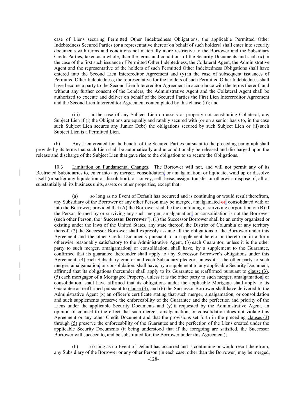case of Liens securing Permitted Other Indebtedness Obligations, the applicable Permitted Other Indebtedness Secured Parties (or a representative thereof on behalf of such holders) shall enter into security documents with terms and conditions not materially more restrictive to the Borrower and the Subsidiary Credit Parties, taken as a whole, than the terms and conditions of the Security Documents and shall (x) in the case of the first such issuance of Permitted Other Indebtedness, the Collateral Agent, the Administrative Agent and the representative of the holders of such Permitted Other Indebtedness Obligations shall have entered into the Second Lien Intercreditor Agreement and (y) in the case of subsequent issuances of Permitted Other Indebtedness, the representative for the holders of such Permitted Other Indebtedness shall have become a party to the Second Lien Intercreditor Agreement in accordance with the terms thereof; and without any further consent of the Lenders, the Administrative Agent and the Collateral Agent shall be authorized to execute and deliver on behalf of the Secured Parties the First Lien Intercreditor Agreement and the Second Lien Intercreditor Agreement contemplated by this clause (ii); and (iii) in the case of any Subject Lien on assets or property not constituting Collateral, any Subject Lien if (i) the Obligations are equally and ratably secured with (or on a senior basis to, in the case such Subject Lien secures any Junior Debt) the obligations secured by such Subject Lien or (ii) such Subject Lien is a Permitted Lien. (b) Any Lien created for the benefit of the Secured Parties pursuant to the preceding paragraph shall provide by its terms that such Lien shall be automatically and unconditionally be released and discharged upon the release and discharge of the Subject Lien that gave rise to the obligation to so secure the Obligations. 10.3 Limitation on Fundamental Changes. The Borrower will not, and will not permit any of its Restricted Subsidiaries to, enter into any merger, consolidation, or amalgamation, or liquidate, wind up or dissolve itself (or suffer any liquidation or dissolution), or convey, sell, lease, assign, transfer or otherwise dispose of, all or substantially all its business units, assets or other properties, except that: (a) so long as no Event of Default has occurred and is continuing or would result therefrom, any Subsidiary of the Borrower or any other Person may be merged, amalgamated or, consolidated with or into the Borrower; provided that (A) the Borrower shall be the continuing or surviving corporation or (B) if the Person formed by or surviving any such merger, amalgamation, or consolidation is not the Borrower (such other Person, the “Successor Borrower”), (1) the Successor Borrower shall be an entity organized or existing under the laws of the United States, any state thereof, the District of Columbia or any territory thereof, (2) the Successor Borrower shall expressly assume all the obligations of the Borrower under this Agreement and the other Credit Documents pursuant to a supplement hereto or thereto or in a form otherwise reasonably satisfactory to the Administrative Agent, (3) each Guarantor, unless it is the other party to such merger, amalgamation, or consolidation, shall have, by a supplement to the Guarantee, confirmed that its guarantee thereunder shall apply to any Successor Borrower’s obligations under this Agreement, (4) each Subsidiary grantor and each Subsidiary pledgor, unless it is the other party to such merger, amalgamation, or consolidation, shall have, by a supplement to any applicable Security Document, affirmed that its obligations thereunder shall apply to its Guarantee as reaffirmed pursuant to clause (3), (5) each mortgagor of a Mortgaged Property, unless it is the other party to such merger, amalgamation, or consolidation, shall have affirmed that its obligations under the applicable Mortgage shall apply to its Guarantee as reaffirmed pursuant to clause (3), and (6) the Successor Borrower shall have delivered to the Administrative Agent (x) an officer’s certificate stating that such merger, amalgamation, or consolidation and such supplements preserve the enforceability of the Guarantee and the perfection and priority of the Liens under the applicable Security Documents and (y) if requested by the Administrative Agent, an opinion of counsel to the effect that such merger, amalgamation, or consolidation does not violate this Agreement or any other Credit Document and that the provisions set forth in the preceding clauses (3) through (5) preserve the enforceability of the Guarantee and the perfection of the Liens created under the applicable Security Documents (it being understood that if the foregoing are satisfied, the Successor Borrower will succeed to, and be substituted for, the Borrower under this Agreement); (b) so long as no Event of Default has occurred and is continuing or would result therefrom, any Subsidiary of the Borrower or any other Person (in each case, other than the Borrower) may be merged, -128-