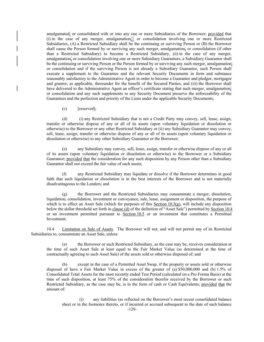 amalgamated, or consolidated with or into any one or more Subsidiaries of the Borrower; provided that (i) in the case of any merger, amalgamation, or consolidation involving one or more Restricted Subsidiaries, (A) a Restricted Subsidiary shall be the continuing or surviving Person or (B) the Borrower shall cause the Person formed by or surviving any such merger, amalgamation, or consolidation (if other than a Restricted Subsidiary) to become a Restricted Subsidiary, (ii) in the case of any merger, amalgamation, or consolidation involving one or more Subsidiary Guarantors, a Subsidiary Guarantor shall be the continuing or surviving Person or the Person formed by or surviving any such merger, amalgamation, or consolidation and if the surviving Person is not already a Subsidiary Guarantor, such Person shall execute a supplement to the Guarantee and the relevant Security Documents in form and substance reasonably satisfactory to the Administrative Agent in order to become a Guarantor and pledgor, mortgagor and grantor, as applicable, thereunder for the benefit of the Secured Parties, and (iii) the Borrower shall have delivered to the Administrative Agent an officer’s certificate stating that such merger, amalgamation, or consolidation and any such supplements to any Security Document preserve the enforceability of the Guarantees and the perfection and priority of the Liens under the applicable Security Documents; (c) [reserved]; (d) (i) any Restricted Subsidiary that is not a Credit Party may convey, sell, lease, assign, transfer or otherwise dispose of any or all of its assets (upon voluntary liquidation or dissolution or otherwise) to the Borrower or any other Restricted Subsidiary or (ii) any Subsidiary Guarantor may convey, sell, lease, assign, transfer or otherwise dispose of any or all of its assets (upon voluntary liquidation or dissolution or otherwise) to any other Subsidiary Guarantor or the Borrower; (e) any Subsidiary may convey, sell, lease, assign, transfer or otherwise dispose of any or all of its assets (upon voluntary liquidation or dissolution or otherwise) to the Borrower or a Subsidiary Guarantor; provided that the consideration for any such disposition by any Person other than a Subsidiary Guarantor shall not exceed the fair value of such assets; (f) any Restricted Subsidiary may liquidate or dissolve if the Borrower determines in good faith that such liquidation or dissolution is in the best interests of the Borrower and is not materially disadvantageous to the Lenders; and (g) the Borrower and the Restricted Subsidiaries may consummate a merger, dissolution, liquidation, consolidation, investment or conveyance, sale, lease, assignment or disposition, the purpose of which is to effect an Asset Sale (which for purposes of this Section 10.3(g), will include any disposition below the dollar threshold set forth in clause (d) of the definition of “Asset Sale”) permitted by Section 10.4 or an investment permitted pursuant to Section 10.5 or an investment that constitutes a Permitted Investment. 10.4 Limitation on Sale of Assets. The Borrower will not, and will not permit any of its Restricted Subsidiaries to, consummate an Asset Sale, unless: (a) the Borrower or such Restricted Subsidiary, as the case may be, receives consideration at the time of such Asset Sale at least equal to the Fair Market Value (as determined at the time of contractually agreeing to such Asset Sale) of the assets sold or otherwise disposed of; and (b) except in the case of a Permitted Asset Swap, if the property or assets sold or otherwise disposed of have a Fair Market Value in excess of the greater of (a) $50,000,000 and (b) 1.5% of Consolidated Total Assets for the most recently ended Test Period (calculated on a Pro Forma Basis) at the time of such disposition, at least 75% of the consideration therefor received by the Borrower or such Restricted Subsidiary, as the case may be, is in the form of cash or Cash Equivalents; provided that the amount of: (i) any liabilities (as reflected on the Borrower’s most recent consolidated balance sheet or in the footnotes thereto, or if incurred or accrued subsequent to the date of such balance -129-