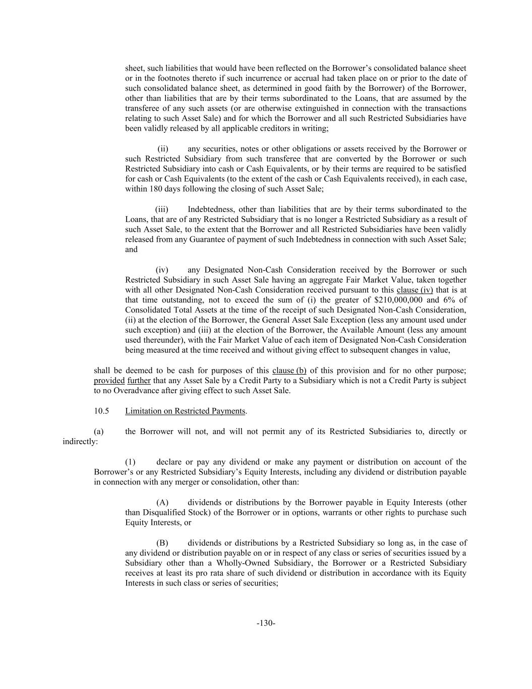 sheet, such liabilities that would have been reflected on the Borrower’s consolidated balance sheet or in the footnotes thereto if such incurrence or accrual had taken place on or prior to the date of such consolidated balance sheet, as determined in good faith by the Borrower) of the Borrower, other than liabilities that are by their terms subordinated to the Loans, that are assumed by the transferee of any such assets (or are otherwise extinguished in connection with the transactions relating to such Asset Sale) and for which the Borrower and all such Restricted Subsidiaries have been validly released by all applicable creditors in writing; (ii) any securities, notes or other obligations or assets received by the Borrower or such Restricted Subsidiary from such transferee that are converted by the Borrower or such Restricted Subsidiary into cash or Cash Equivalents, or by their terms are required to be satisfied for cash or Cash Equivalents (to the extent of the cash or Cash Equivalents received), in each case, within 180 days following the closing of such Asset Sale; (iii) Indebtedness, other than liabilities that are by their terms subordinated to the Loans, that are of any Restricted Subsidiary that is no longer a Restricted Subsidiary as a result of such Asset Sale, to the extent that the Borrower and all Restricted Subsidiaries have been validly released from any Guarantee of payment of such Indebtedness in connection with such Asset Sale; and (iv) any Designated Non-Cash Consideration received by the Borrower or such Restricted Subsidiary in such Asset Sale having an aggregate Fair Market Value, taken together with all other Designated Non-Cash Consideration received pursuant to this clause (iv) that is at that time outstanding, not to exceed the sum of (i) the greater of $210,000,000 and 6% of Consolidated Total Assets at the time of the receipt of such Designated Non-Cash Consideration, (ii) at the election of the Borrower, the General Asset Sale Exception (less any amount used under such exception) and (iii) at the election of the Borrower, the Available Amount (less any amount used thereunder), with the Fair Market Value of each item of Designated Non-Cash Consideration being measured at the time received and without giving effect to subsequent changes in value, shall be deemed to be cash for purposes of this clause (b) of this provision and for no other purpose; provided further that any Asset Sale by a Credit Party to a Subsidiary which is not a Credit Party is subject to no Overadvance after giving effect to such Asset Sale. 10.5 Limitation on Restricted Payments. (a) the Borrower will not, and will not permit any of its Restricted Subsidiaries to, directly or indirectly: (1) declare or pay any dividend or make any payment or distribution on account of the Borrower’s or any Restricted Subsidiary’s Equity Interests, including any dividend or distribution payable in connection with any merger or consolidation, other than: (A) dividends or distributions by the Borrower payable in Equity Interests (other than Disqualified Stock) of the Borrower or in options, warrants or other rights to purchase such Equity Interests, or (B) dividends or distributions by a Restricted Subsidiary so long as, in the case of any dividend or distribution payable on or in respect of any class or series of securities issued by a Subsidiary other than a Wholly-Owned Subsidiary, the Borrower or a Restricted Subsidiary receives at least its pro rata share of such dividend or distribution in accordance with its Equity Interests in such class or series of securities; -130-