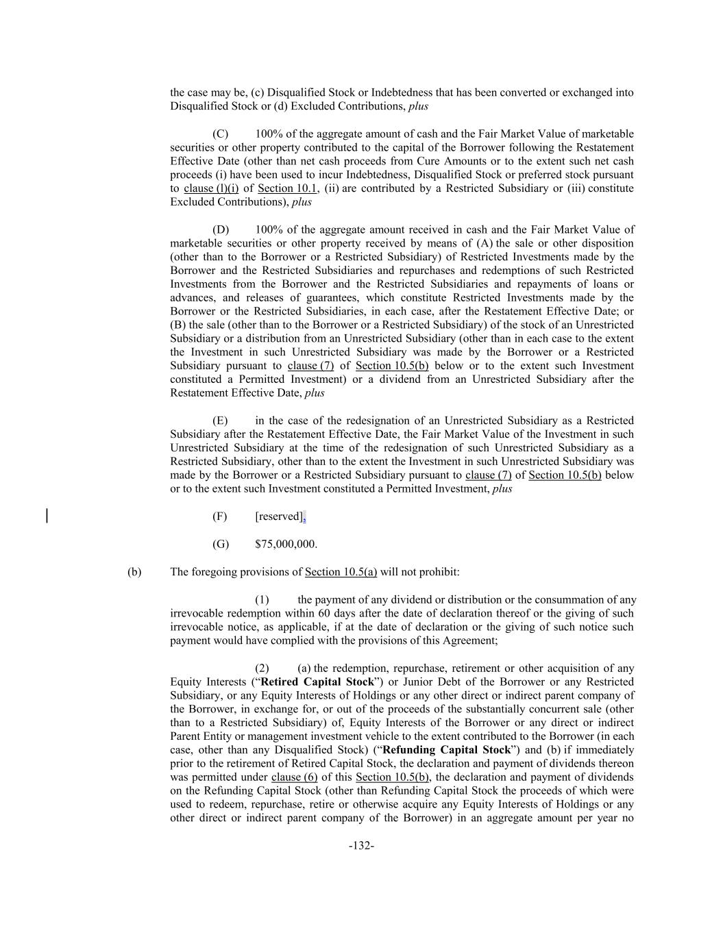 the case may be, (c) Disqualified Stock or Indebtedness that has been converted or exchanged into Disqualified Stock or (d) Excluded Contributions, plus (C) 100% of the aggregate amount of cash and the Fair Market Value of marketable securities or other property contributed to the capital of the Borrower following the Restatement Effective Date (other than net cash proceeds from Cure Amounts or to the extent such net cash proceeds (i) have been used to incur Indebtedness, Disqualified Stock or preferred stock pursuant to clause (l)(i) of Section 10.1, (ii) are contributed by a Restricted Subsidiary or (iii) constitute Excluded Contributions), plus (D) 100% of the aggregate amount received in cash and the Fair Market Value of marketable securities or other property received by means of (A) the sale or other disposition (other than to the Borrower or a Restricted Subsidiary) of Restricted Investments made by the Borrower and the Restricted Subsidiaries and repurchases and redemptions of such Restricted Investments from the Borrower and the Restricted Subsidiaries and repayments of loans or advances, and releases of guarantees, which constitute Restricted Investments made by the Borrower or the Restricted Subsidiaries, in each case, after the Restatement Effective Date; or (B) the sale (other than to the Borrower or a Restricted Subsidiary) of the stock of an Unrestricted Subsidiary or a distribution from an Unrestricted Subsidiary (other than in each case to the extent the Investment in such Unrestricted Subsidiary was made by the Borrower or a Restricted Subsidiary pursuant to clause (7) of Section 10.5(b) below or to the extent such Investment constituted a Permitted Investment) or a dividend from an Unrestricted Subsidiary after the Restatement Effective Date, plus (E) in the case of the redesignation of an Unrestricted Subsidiary as a Restricted Subsidiary after the Restatement Effective Date, the Fair Market Value of the Investment in such Unrestricted Subsidiary at the time of the redesignation of such Unrestricted Subsidiary as a Restricted Subsidiary, other than to the extent the Investment in such Unrestricted Subsidiary was made by the Borrower or a Restricted Subsidiary pursuant to clause (7) of Section 10.5(b) below or to the extent such Investment constituted a Permitted Investment, plus (F) [reserved], (G) $75,000,000. (b) The foregoing provisions of Section 10.5(a) will not prohibit: (1) the payment of any dividend or distribution or the consummation of any irrevocable redemption within 60 days after the date of declaration thereof or the giving of such irrevocable notice, as applicable, if at the date of declaration or the giving of such notice such payment would have complied with the provisions of this Agreement; (2) (a) the redemption, repurchase, retirement or other acquisition of any Equity Interests (“Retired Capital Stock”) or Junior Debt of the Borrower or any Restricted Subsidiary, or any Equity Interests of Holdings or any other direct or indirect parent company of the Borrower, in exchange for, or out of the proceeds of the substantially concurrent sale (other than to a Restricted Subsidiary) of, Equity Interests of the Borrower or any direct or indirect Parent Entity or management investment vehicle to the extent contributed to the Borrower (in each case, other than any Disqualified Stock) (“Refunding Capital Stock”) and (b) if immediately prior to the retirement of Retired Capital Stock, the declaration and payment of dividends thereon was permitted under clause (6) of this Section 10.5(b), the declaration and payment of dividends on the Refunding Capital Stock (other than Refunding Capital Stock the proceeds of which were used to redeem, repurchase, retire or otherwise acquire any Equity Interests of Holdings or any other direct or indirect parent company of the Borrower) in an aggregate amount per year no -132-