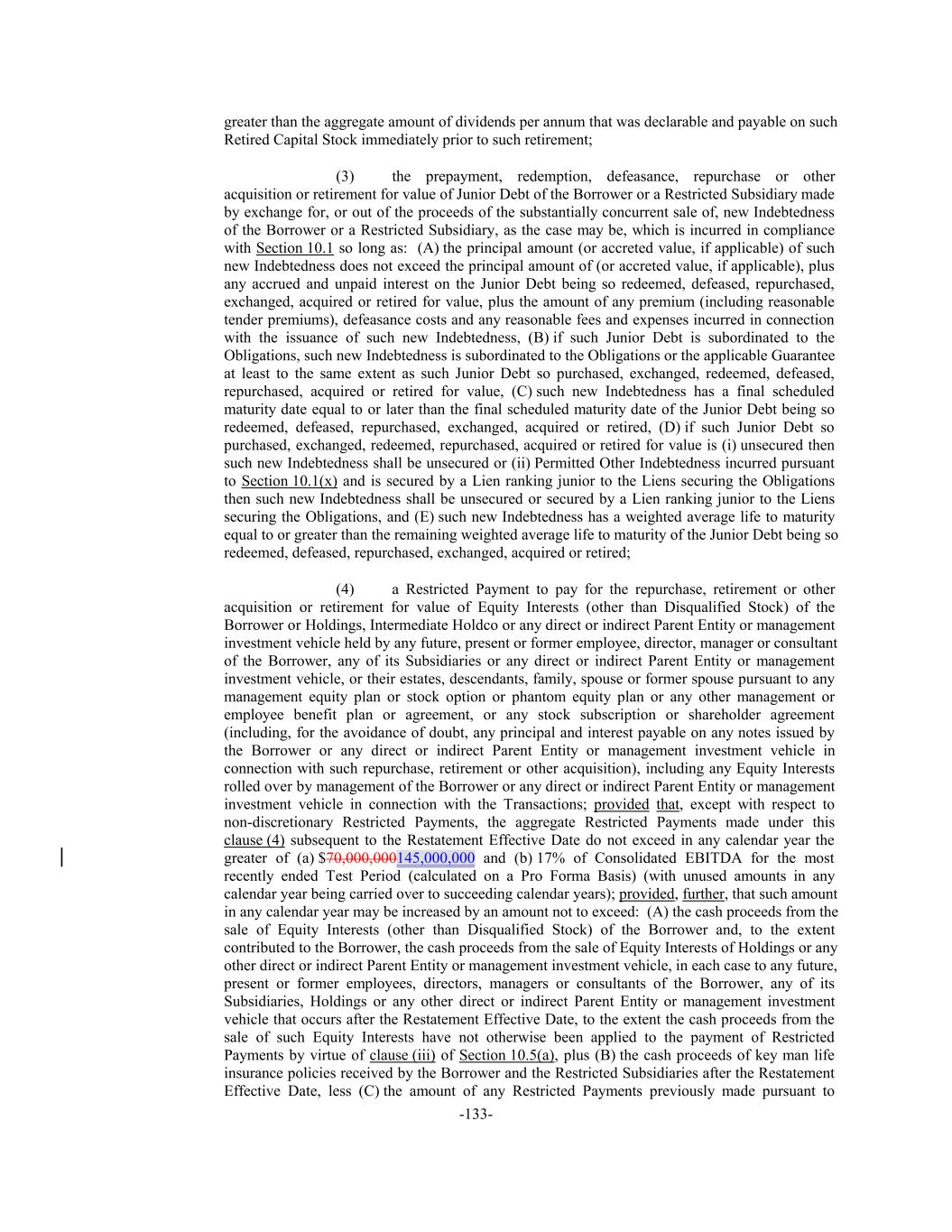 greater than the aggregate amount of dividends per annum that was declarable and payable on such Retired Capital Stock immediately prior to such retirement; (3) the prepayment, redemption, defeasance, repurchase or other acquisition or retirement for value of Junior Debt of the Borrower or a Restricted Subsidiary made by exchange for, or out of the proceeds of the substantially concurrent sale of, new Indebtedness of the Borrower or a Restricted Subsidiary, as the case may be, which is incurred in compliance with Section 10.1 so long as: (A) the principal amount (or accreted value, if applicable) of such new Indebtedness does not exceed the principal amount of (or accreted value, if applicable), plus any accrued and unpaid interest on the Junior Debt being so redeemed, defeased, repurchased, exchanged, acquired or retired for value, plus the amount of any premium (including reasonable tender premiums), defeasance costs and any reasonable fees and expenses incurred in connection with the issuance of such new Indebtedness, (B) if such Junior Debt is subordinated to the Obligations, such new Indebtedness is subordinated to the Obligations or the applicable Guarantee at least to the same extent as such Junior Debt so purchased, exchanged, redeemed, defeased, repurchased, acquired or retired for value, (C) such new Indebtedness has a final scheduled maturity date equal to or later than the final scheduled maturity date of the Junior Debt being so redeemed, defeased, repurchased, exchanged, acquired or retired, (D) if such Junior Debt so purchased, exchanged, redeemed, repurchased, acquired or retired for value is (i) unsecured then such new Indebtedness shall be unsecured or (ii) Permitted Other Indebtedness incurred pursuant to Section 10.1(x) and is secured by a Lien ranking junior to the Liens securing the Obligations then such new Indebtedness shall be unsecured or secured by a Lien ranking junior to the Liens securing the Obligations, and (E) such new Indebtedness has a weighted average life to maturity equal to or greater than the remaining weighted average life to maturity of the Junior Debt being so redeemed, defeased, repurchased, exchanged, acquired or retired; (4) a Restricted Payment to pay for the repurchase, retirement or other acquisition or retirement for value of Equity Interests (other than Disqualified Stock) of the Borrower or Holdings, Intermediate Holdco or any direct or indirect Parent Entity or management investment vehicle held by any future, present or former employee, director, manager or consultant of the Borrower, any of its Subsidiaries or any direct or indirect Parent Entity or management investment vehicle, or their estates, descendants, family, spouse or former spouse pursuant to any management equity plan or stock option or phantom equity plan or any other management or employee benefit plan or agreement, or any stock subscription or shareholder agreement (including, for the avoidance of doubt, any principal and interest payable on any notes issued by the Borrower or any direct or indirect Parent Entity or management investment vehicle in connection with such repurchase, retirement or other acquisition), including any Equity Interests rolled over by management of the Borrower or any direct or indirect Parent Entity or management investment vehicle in connection with the Transactions; provided that, except with respect to non-discretionary Restricted Payments, the aggregate Restricted Payments made under this clause (4) subsequent to the Restatement Effective Date do not exceed in any calendar year the greater of (a) $70,000,000145,000,000 and (b) 17% of Consolidated EBITDA for the most recently ended Test Period (calculated on a Pro Forma Basis) (with unused amounts in any calendar year being carried over to succeeding calendar years); provided, further, that such amount in any calendar year may be increased by an amount not to exceed: (A) the cash proceeds from the sale of Equity Interests (other than Disqualified Stock) of the Borrower and, to the extent contributed to the Borrower, the cash proceeds from the sale of Equity Interests of Holdings or any other direct or indirect Parent Entity or management investment vehicle, in each case to any future, present or former employees, directors, managers or consultants of the Borrower, any of its Subsidiaries, Holdings or any other direct or indirect Parent Entity or management investment vehicle that occurs after the Restatement Effective Date, to the extent the cash proceeds from the sale of such Equity Interests have not otherwise been applied to the payment of Restricted Payments by virtue of clause (iii) of Section 10.5(a), plus (B) the cash proceeds of key man life insurance policies received by the Borrower and the Restricted Subsidiaries after the Restatement Effective Date, less (C) the amount of any Restricted Payments previously made pursuant to -133-