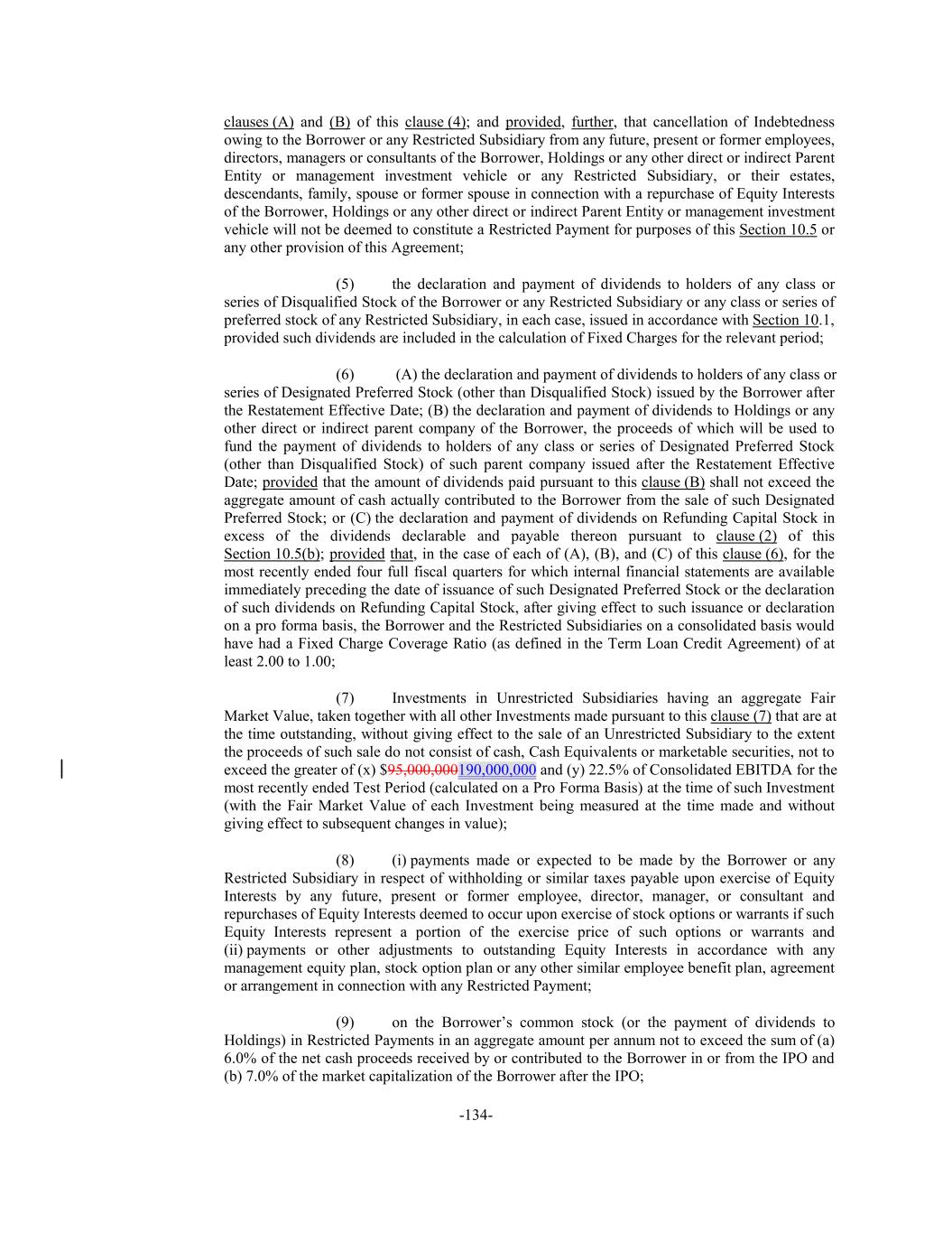 clauses (A) and (B) of this clause (4); and provided, further, that cancellation of Indebtedness owing to the Borrower or any Restricted Subsidiary from any future, present or former employees, directors, managers or consultants of the Borrower, Holdings or any other direct or indirect Parent Entity or management investment vehicle or any Restricted Subsidiary, or their estates, descendants, family, spouse or former spouse in connection with a repurchase of Equity Interests of the Borrower, Holdings or any other direct or indirect Parent Entity or management investment vehicle will not be deemed to constitute a Restricted Payment for purposes of this Section 10.5 or any other provision of this Agreement; (5) the declaration and payment of dividends to holders of any class or series of Disqualified Stock of the Borrower or any Restricted Subsidiary or any class or series of preferred stock of any Restricted Subsidiary, in each case, issued in accordance with Section 10.1, provided such dividends are included in the calculation of Fixed Charges for the relevant period; (6) (A) the declaration and payment of dividends to holders of any class or series of Designated Preferred Stock (other than Disqualified Stock) issued by the Borrower after the Restatement Effective Date; (B) the declaration and payment of dividends to Holdings or any other direct or indirect parent company of the Borrower, the proceeds of which will be used to fund the payment of dividends to holders of any class or series of Designated Preferred Stock (other than Disqualified Stock) of such parent company issued after the Restatement Effective Date; provided that the amount of dividends paid pursuant to this clause (B) shall not exceed the aggregate amount of cash actually contributed to the Borrower from the sale of such Designated Preferred Stock; or (C) the declaration and payment of dividends on Refunding Capital Stock in excess of the dividends declarable and payable thereon pursuant to clause (2) of this Section 10.5(b); provided that, in the case of each of (A), (B), and (C) of this clause (6), for the most recently ended four full fiscal quarters for which internal financial statements are available immediately preceding the date of issuance of such Designated Preferred Stock or the declaration of such dividends on Refunding Capital Stock, after giving effect to such issuance or declaration on a pro forma basis, the Borrower and the Restricted Subsidiaries on a consolidated basis would have had a Fixed Charge Coverage Ratio (as defined in the Term Loan Credit Agreement) of at least 2.00 to 1.00; (7) Investments in Unrestricted Subsidiaries having an aggregate Fair Market Value, taken together with all other Investments made pursuant to this clause (7) that are at the time outstanding, without giving effect to the sale of an Unrestricted Subsidiary to the extent the proceeds of such sale do not consist of cash, Cash Equivalents or marketable securities, not to exceed the greater of (x) $95,000,000190,000,000 and (y) 22.5% of Consolidated EBITDA for the most recently ended Test Period (calculated on a Pro Forma Basis) at the time of such Investment (with the Fair Market Value of each Investment being measured at the time made and without giving effect to subsequent changes in value); (8) (i) payments made or expected to be made by the Borrower or any Restricted Subsidiary in respect of withholding or similar taxes payable upon exercise of Equity Interests by any future, present or former employee, director, manager, or consultant and repurchases of Equity Interests deemed to occur upon exercise of stock options or warrants if such Equity Interests represent a portion of the exercise price of such options or warrants and (ii) payments or other adjustments to outstanding Equity Interests in accordance with any management equity plan, stock option plan or any other similar employee benefit plan, agreement or arrangement in connection with any Restricted Payment; (9) on the Borrower’s common stock (or the payment of dividends to Holdings) in Restricted Payments in an aggregate amount per annum not to exceed the sum of (a) 6.0% of the net cash proceeds received by or contributed to the Borrower in or from the IPO and (b) 7.0% of the market capitalization of the Borrower after the IPO; -134-