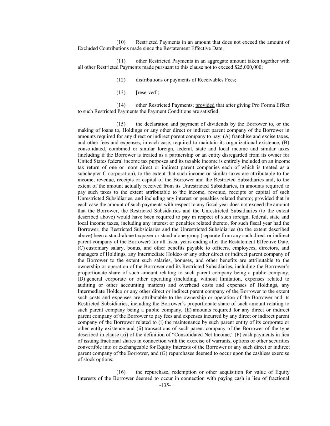 (10) Restricted Payments in an amount that does not exceed the amount of Excluded Contributions made since the Restatement Effective Date; (11) other Restricted Payments in an aggregate amount taken together with all other Restricted Payments made pursuant to this clause not to exceed $25,000,000; (12) distributions or payments of Receivables Fees; (13) [reserved]; (14) other Restricted Payments; provided that after giving Pro Forma Effect to such Restricted Payments the Payment Conditions are satisfied; (15) the declaration and payment of dividends by the Borrower to, or the making of loans to, Holdings or any other direct or indirect parent company of the Borrower in amounts required for any direct or indirect parent company to pay: (A) franchise and excise taxes, and other fees and expenses, in each case, required to maintain its organizational existence, (B) consolidated, combined or similar foreign, federal, state and local income and similar taxes (including if the Borrower is treated as a partnership or an entity disregarded from its owner for United States federal income tax purposes and its taxable income is entirely included on an income tax return of one or more direct or indirect parent companies each of which is treated as a subchapter C corporation), to the extent that such income or similar taxes are attributable to the income, revenue, receipts or capital of the Borrower and the Restricted Subsidiaries and, to the extent of the amount actually received from its Unrestricted Subsidiaries, in amounts required to pay such taxes to the extent attributable to the income, revenue, receipts or capital of such Unrestricted Subsidiaries, and including any interest or penalties related thereto; provided that in each case the amount of such payments with respect to any fiscal year does not exceed the amount that the Borrower, the Restricted Subsidiaries and the Unrestricted Subsidiaries (to the extent described above) would have been required to pay in respect of such foreign, federal, state and local income taxes, including any interest or penalties related thereto, for such fiscal year had the Borrower, the Restricted Subsidiaries and the Unrestricted Subsidiaries (to the extent described above) been a stand-alone taxpayer or stand-alone group (separate from any such direct or indirect parent company of the Borrower) for all fiscal years ending after the Restatement Effective Date, (C) customary salary, bonus, and other benefits payable to officers, employees, directors, and managers of Holdings, any Intermediate Holdco or any other direct or indirect parent company of the Borrower to the extent such salaries, bonuses, and other benefits are attributable to the ownership or operation of the Borrower and its Restricted Subsidiaries, including the Borrower’s proportionate share of such amount relating to such parent company being a public company, (D) general corporate or other operating (including, without limitation, expenses related to auditing or other accounting matters) and overhead costs and expenses of Holdings, any Intermediate Holdco or any other direct or indirect parent company of the Borrower to the extent such costs and expenses are attributable to the ownership or operation of the Borrower and its Restricted Subsidiaries, including the Borrower’s proportionate share of such amount relating to such parent company being a public company, (E) amounts required for any direct or indirect parent company of the Borrower to pay fees and expenses incurred by any direct or indirect parent company of the Borrower related to (i) the maintenance by such parent entity of its corporate or other entity existence and (ii) transactions of such parent company of the Borrower of the type described in clause (xi) of the definition of “Consolidated Net Income,” (F) cash payments in lieu of issuing fractional shares in connection with the exercise of warrants, options or other securities convertible into or exchangeable for Equity Interests of the Borrower or any such direct or indirect parent company of the Borrower, and (G) repurchases deemed to occur upon the cashless exercise of stock options; (16) the repurchase, redemption or other acquisition for value of Equity Interests of the Borrower deemed to occur in connection with paying cash in lieu of fractional -135-