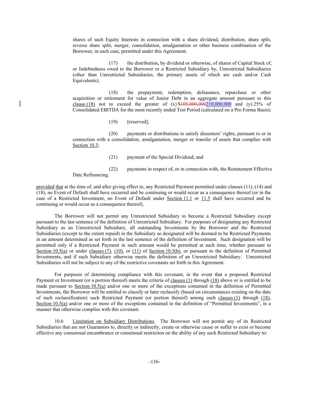 shares of such Equity Interests in connection with a share dividend, distribution, share split, reverse share split, merger, consolidation, amalgamation or other business combination of the Borrower, in each case, permitted under this Agreement; (17) the distribution, by dividend or otherwise, of shares of Capital Stock of, or Indebtedness owed to the Borrower or a Restricted Subsidiary by, Unrestricted Subsidiaries (other than Unrestricted Subsidiaries, the primary assets of which are cash and/or Cash Equivalents); (18) the prepayment, redemption, defeasance, repurchase or other acquisition or retirement for value of Junior Debt in an aggregate amount pursuant to this clause (18) not to exceed the greater of (x) $105,000,000210,000,000 and (y) 25% of Consolidated EBITDA for the most recently ended Test Period (calculated on a Pro Forma Basis); (19) [reserved]; (20) payments or distributions to satisfy dissenters’ rights, pursuant to or in connection with a consolidation, amalgamation, merger or transfer of assets that complies with Section 10.3; (21) payment of the Special Dividend; and (22) payments in respect of, or in connection with, the Restatement Effective Date Refinancing. provided that at the time of, and after giving effect to, any Restricted Payment permitted under clauses (11), (14) and (18), no Event of Default shall have occurred and be continuing or would occur as a consequence thereof (or in the case of a Restricted Investment, no Event of Default under Section 11.1 or 11.5 shall have occurred and be continuing or would occur as a consequence thereof). The Borrower will not permit any Unrestricted Subsidiary to become a Restricted Subsidiary except pursuant to the last sentence of the definition of Unrestricted Subsidiary. For purposes of designating any Restricted Subsidiary as an Unrestricted Subsidiary, all outstanding Investments by the Borrower and the Restricted Subsidiaries (except to the extent repaid) in the Subsidiary so designated will be deemed to be Restricted Payments in an amount determined as set forth in the last sentence of the definition of Investment. Such designation will be permitted only if a Restricted Payment in such amount would be permitted at such time, whether pursuant to Section 10.5(a) or under clauses (7), (10), or (11) of Section 10.5(b), or pursuant to the definition of Permitted Investments, and if such Subsidiary otherwise meets the definition of an Unrestricted Subsidiary. Unrestricted Subsidiaries will not be subject to any of the restrictive covenants set forth in this Agreement. For purposes of determining compliance with this covenant, in the event that a proposed Restricted Payment or Investment (or a portion thereof) meets the criteria of clauses (1) through (18) above or is entitled to be made pursuant to Section 10.5(a) and/or one or more of the exceptions contained in the definition of Permitted Investments, the Borrower will be entitled to classify or later reclassify (based on circumstances existing on the date of such reclassification) such Restricted Payment (or portion thereof) among such clauses (1) through (18), Section 10.5(a) and/or one or more of the exceptions contained in the definition of “Permitted Investments”, in a manner that otherwise complies with this covenant. 10.6 Limitation on Subsidiary Distributions. The Borrower will not permit any of its Restricted Subsidiaries that are not Guarantors to, directly or indirectly, create or otherwise cause or suffer to exist or become effective any consensual encumbrance or consensual restriction on the ability of any such Restricted Subsidiary to: -136-