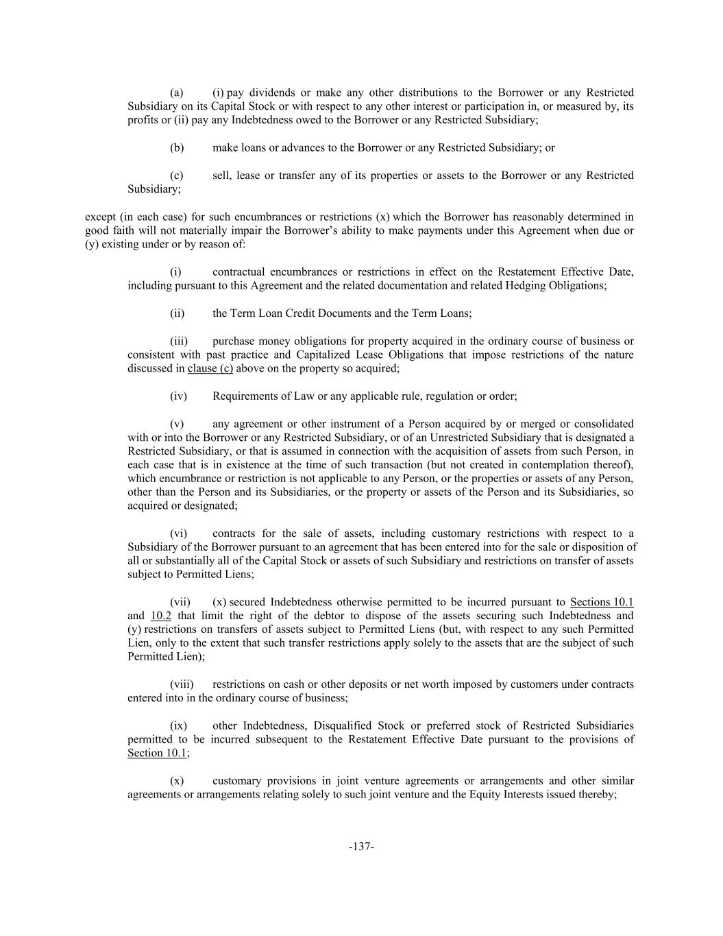 (a) (i) pay dividends or make any other distributions to the Borrower or any Restricted Subsidiary on its Capital Stock or with respect to any other interest or participation in, or measured by, its profits or (ii) pay any Indebtedness owed to the Borrower or any Restricted Subsidiary; (b) make loans or advances to the Borrower or any Restricted Subsidiary; or (c) sell, lease or transfer any of its properties or assets to the Borrower or any Restricted Subsidiary; except (in each case) for such encumbrances or restrictions (x) which the Borrower has reasonably determined in good faith will not materially impair the Borrower’s ability to make payments under this Agreement when due or (y) existing under or by reason of: (i) contractual encumbrances or restrictions in effect on the Restatement Effective Date, including pursuant to this Agreement and the related documentation and related Hedging Obligations; (ii) the Term Loan Credit Documents and the Term Loans; (iii) purchase money obligations for property acquired in the ordinary course of business or consistent with past practice and Capitalized Lease Obligations that impose restrictions of the nature discussed in clause (c) above on the property so acquired; (iv) Requirements of Law or any applicable rule, regulation or order; (v) any agreement or other instrument of a Person acquired by or merged or consolidated with or into the Borrower or any Restricted Subsidiary, or of an Unrestricted Subsidiary that is designated a Restricted Subsidiary, or that is assumed in connection with the acquisition of assets from such Person, in each case that is in existence at the time of such transaction (but not created in contemplation thereof), which encumbrance or restriction is not applicable to any Person, or the properties or assets of any Person, other than the Person and its Subsidiaries, or the property or assets of the Person and its Subsidiaries, so acquired or designated; (vi) contracts for the sale of assets, including customary restrictions with respect to a Subsidiary of the Borrower pursuant to an agreement that has been entered into for the sale or disposition of all or substantially all of the Capital Stock or assets of such Subsidiary and restrictions on transfer of assets subject to Permitted Liens; (vii) (x) secured Indebtedness otherwise permitted to be incurred pursuant to Sections 10.1 and 10.2 that limit the right of the debtor to dispose of the assets securing such Indebtedness and (y) restrictions on transfers of assets subject to Permitted Liens (but, with respect to any such Permitted Lien, only to the extent that such transfer restrictions apply solely to the assets that are the subject of such Permitted Lien); (viii) restrictions on cash or other deposits or net worth imposed by customers under contracts entered into in the ordinary course of business; (ix) other Indebtedness, Disqualified Stock or preferred stock of Restricted Subsidiaries permitted to be incurred subsequent to the Restatement Effective Date pursuant to the provisions of Section 10.1; (x) customary provisions in joint venture agreements or arrangements and other similar agreements or arrangements relating solely to such joint venture and the Equity Interests issued thereby; -137-