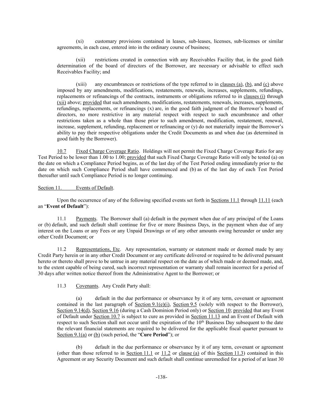 (xi) customary provisions contained in leases, sub-leases, licenses, sub-licenses or similar agreements, in each case, entered into in the ordinary course of business; (xii) restrictions created in connection with any Receivables Facility that, in the good faith determination of the board of directors of the Borrower, are necessary or advisable to effect such Receivables Facility; and (xiii) any encumbrances or restrictions of the type referred to in clauses (a), (b), and (c) above imposed by any amendments, modifications, restatements, renewals, increases, supplements, refundings, replacements or refinancings of the contracts, instruments or obligations referred to in clauses (i) through (xii) above; provided that such amendments, modifications, restatements, renewals, increases, supplements, refundings, replacements, or refinancings (x) are, in the good faith judgment of the Borrower’s board of directors, no more restrictive in any material respect with respect to such encumbrance and other restrictions taken as a whole than those prior to such amendment, modification, restatement, renewal, increase, supplement, refunding, replacement or refinancing or (y) do not materially impair the Borrower’s ability to pay their respective obligations under the Credit Documents as and when due (as determined in good faith by the Borrower). 10.7 Fixed Charge Coverage Ratio. Holdings will not permit the Fixed Charge Coverage Ratio for any Test Period to be lower than 1.00 to 1.00; provided that such Fixed Charge Coverage Ratio will only be tested (a) on the date on which a Compliance Period begins, as of the last day of the Test Period ending immediately prior to the date on which such Compliance Period shall have commenced and (b) as of the last day of each Test Period thereafter until such Compliance Period is no longer continuing. Section 11. Events of Default. Upon the occurrence of any of the following specified events set forth in Sections 11.1 through 11.11 (each an “Event of Default”): 11.1 Payments. The Borrower shall (a) default in the payment when due of any principal of the Loans or (b) default, and such default shall continue for five or more Business Days, in the payment when due of any interest on the Loans or any Fees or any Unpaid Drawings or of any other amounts owing hereunder or under any other Credit Document; or 11.2 Representations, Etc. Any representation, warranty or statement made or deemed made by any Credit Party herein or in any other Credit Document or any certificate delivered or required to be delivered pursuant hereto or thereto shall prove to be untrue in any material respect on the date as of which made or deemed made, and, to the extent capable of being cured, such incorrect representation or warranty shall remain incorrect for a period of 30 days after written notice thereof from the Administrative Agent to the Borrower; or 11.3 Covenants. Any Credit Party shall: (a) default in the due performance or observance by it of any term, covenant or agreement contained in the last paragraph of Section 9.1(e)(i), Section 9.5 (solely with respect to the Borrower), Section 9.14(d), Section 9.16 (during a Cash Dominion Period only) or Section 10; provided that any Event of Default under Section 10.7 is subject to cure as provided in Section 11.13 and an Event of Default with respect to such Section shall not occur until the expiration of the 10th Business Day subsequent to the date the relevant financial statements are required to be delivered for the applicable fiscal quarter pursuant to Section 9.1(a) or (b) (such period, the “Cure Period”); or (b) default in the due performance or observance by it of any term, covenant or agreement (other than those referred to in Section 11.1 or 11.2 or clause (a) of this Section 11.3) contained in this Agreement or any Security Document and such default shall continue unremedied for a period of at least 30 -138-