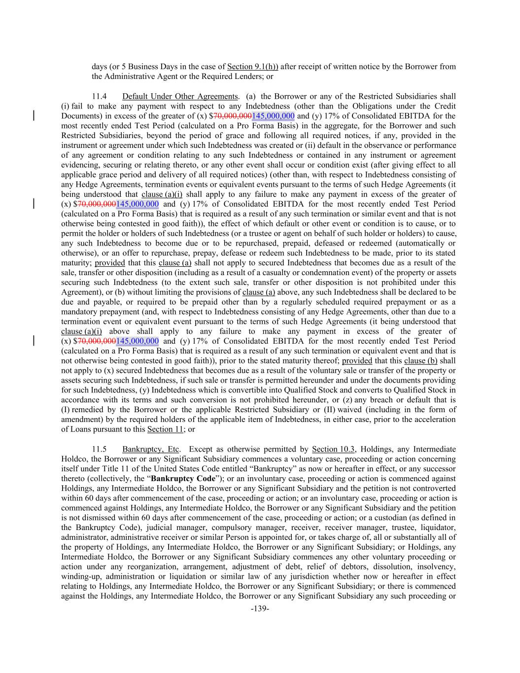 days (or 5 Business Days in the case of Section 9.1(h)) after receipt of written notice by the Borrower from the Administrative Agent or the Required Lenders; or 11.4 Default Under Other Agreements. (a) the Borrower or any of the Restricted Subsidiaries shall (i) fail to make any payment with respect to any Indebtedness (other than the Obligations under the Credit Documents) in excess of the greater of (x) $70,000,000145,000,000 and (y) 17% of Consolidated EBITDA for the most recently ended Test Period (calculated on a Pro Forma Basis) in the aggregate, for the Borrower and such Restricted Subsidiaries, beyond the period of grace and following all required notices, if any, provided in the instrument or agreement under which such Indebtedness was created or (ii) default in the observance or performance of any agreement or condition relating to any such Indebtedness or contained in any instrument or agreement evidencing, securing or relating thereto, or any other event shall occur or condition exist (after giving effect to all applicable grace period and delivery of all required notices) (other than, with respect to Indebtedness consisting of any Hedge Agreements, termination events or equivalent events pursuant to the terms of such Hedge Agreements (it being understood that clause (a)(i) shall apply to any failure to make any payment in excess of the greater of (x) $70,000,000145,000,000 and (y) 17% of Consolidated EBITDA for the most recently ended Test Period (calculated on a Pro Forma Basis) that is required as a result of any such termination or similar event and that is not otherwise being contested in good faith)), the effect of which default or other event or condition is to cause, or to permit the holder or holders of such Indebtedness (or a trustee or agent on behalf of such holder or holders) to cause, any such Indebtedness to become due or to be repurchased, prepaid, defeased or redeemed (automatically or otherwise), or an offer to repurchase, prepay, defease or redeem such Indebtedness to be made, prior to its stated maturity; provided that this clause (a) shall not apply to secured Indebtedness that becomes due as a result of the sale, transfer or other disposition (including as a result of a casualty or condemnation event) of the property or assets securing such Indebtedness (to the extent such sale, transfer or other disposition is not prohibited under this Agreement), or (b) without limiting the provisions of clause (a) above, any such Indebtedness shall be declared to be due and payable, or required to be prepaid other than by a regularly scheduled required prepayment or as a mandatory prepayment (and, with respect to Indebtedness consisting of any Hedge Agreements, other than due to a termination event or equivalent event pursuant to the terms of such Hedge Agreements (it being understood that clause (a)(i) above shall apply to any failure to make any payment in excess of the greater of (x) $70,000,000145,000,000 and (y) 17% of Consolidated EBITDA for the most recently ended Test Period (calculated on a Pro Forma Basis) that is required as a result of any such termination or equivalent event and that is not otherwise being contested in good faith)), prior to the stated maturity thereof; provided that this clause (b) shall not apply to (x) secured Indebtedness that becomes due as a result of the voluntary sale or transfer of the property or assets securing such Indebtedness, if such sale or transfer is permitted hereunder and under the documents providing for such Indebtedness, (y) Indebtedness which is convertible into Qualified Stock and converts to Qualified Stock in accordance with its terms and such conversion is not prohibited hereunder, or (z) any breach or default that is (I) remedied by the Borrower or the applicable Restricted Subsidiary or (II) waived (including in the form of amendment) by the required holders of the applicable item of Indebtedness, in either case, prior to the acceleration of Loans pursuant to this Section 11; or 11.5 Bankruptcy, Etc. Except as otherwise permitted by Section 10.3, Holdings, any Intermediate Holdco, the Borrower or any Significant Subsidiary commences a voluntary case, proceeding or action concerning itself under Title 11 of the United States Code entitled “Bankruptcy” as now or hereafter in effect, or any successor thereto (collectively, the “Bankruptcy Code”); or an involuntary case, proceeding or action is commenced against Holdings, any Intermediate Holdco, the Borrower or any Significant Subsidiary and the petition is not controverted within 60 days after commencement of the case, proceeding or action; or an involuntary case, proceeding or action is commenced against Holdings, any Intermediate Holdco, the Borrower or any Significant Subsidiary and the petition is not dismissed within 60 days after commencement of the case, proceeding or action; or a custodian (as defined in the Bankruptcy Code), judicial manager, compulsory manager, receiver, receiver manager, trustee, liquidator, administrator, administrative receiver or similar Person is appointed for, or takes charge of, all or substantially all of the property of Holdings, any Intermediate Holdco, the Borrower or any Significant Subsidiary; or Holdings, any Intermediate Holdco, the Borrower or any Significant Subsidiary commences any other voluntary proceeding or action under any reorganization, arrangement, adjustment of debt, relief of debtors, dissolution, insolvency, winding-up, administration or liquidation or similar law of any jurisdiction whether now or hereafter in effect relating to Holdings, any Intermediate Holdco, the Borrower or any Significant Subsidiary; or there is commenced against the Holdings, any Intermediate Holdco, the Borrower or any Significant Subsidiary any such proceeding or -139-