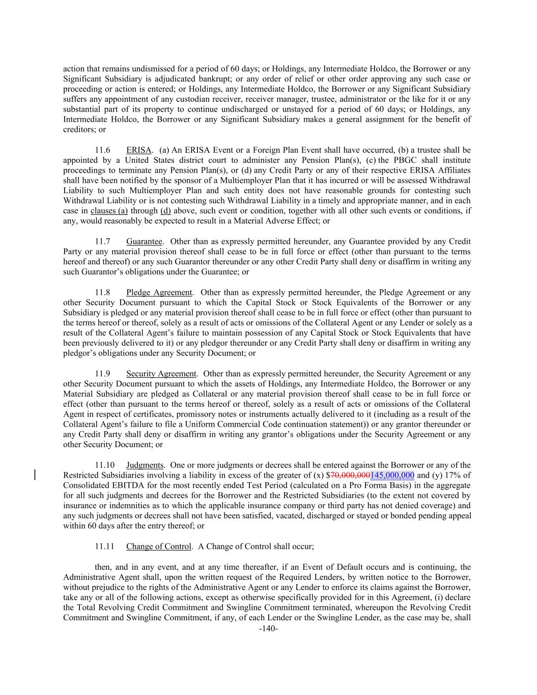 action that remains undismissed for a period of 60 days; or Holdings, any Intermediate Holdco, the Borrower or any Significant Subsidiary is adjudicated bankrupt; or any order of relief or other order approving any such case or proceeding or action is entered; or Holdings, any Intermediate Holdco, the Borrower or any Significant Subsidiary suffers any appointment of any custodian receiver, receiver manager, trustee, administrator or the like for it or any substantial part of its property to continue undischarged or unstayed for a period of 60 days; or Holdings, any Intermediate Holdco, the Borrower or any Significant Subsidiary makes a general assignment for the benefit of creditors; or 11.6 ERISA. (a) An ERISA Event or a Foreign Plan Event shall have occurred, (b) a trustee shall be appointed by a United States district court to administer any Pension Plan(s), (c) the PBGC shall institute proceedings to terminate any Pension Plan(s), or (d) any Credit Party or any of their respective ERISA Affiliates shall have been notified by the sponsor of a Multiemployer Plan that it has incurred or will be assessed Withdrawal Liability to such Multiemployer Plan and such entity does not have reasonable grounds for contesting such Withdrawal Liability or is not contesting such Withdrawal Liability in a timely and appropriate manner, and in each case in clauses (a) through (d) above, such event or condition, together with all other such events or conditions, if any, would reasonably be expected to result in a Material Adverse Effect; or 11.7 Guarantee. Other than as expressly permitted hereunder, any Guarantee provided by any Credit Party or any material provision thereof shall cease to be in full force or effect (other than pursuant to the terms hereof and thereof) or any such Guarantor thereunder or any other Credit Party shall deny or disaffirm in writing any such Guarantor’s obligations under the Guarantee; or 11.8 Pledge Agreement. Other than as expressly permitted hereunder, the Pledge Agreement or any other Security Document pursuant to which the Capital Stock or Stock Equivalents of the Borrower or any Subsidiary is pledged or any material provision thereof shall cease to be in full force or effect (other than pursuant to the terms hereof or thereof, solely as a result of acts or omissions of the Collateral Agent or any Lender or solely as a result of the Collateral Agent’s failure to maintain possession of any Capital Stock or Stock Equivalents that have been previously delivered to it) or any pledgor thereunder or any Credit Party shall deny or disaffirm in writing any pledgor’s obligations under any Security Document; or 11.9 Security Agreement. Other than as expressly permitted hereunder, the Security Agreement or any other Security Document pursuant to which the assets of Holdings, any Intermediate Holdco, the Borrower or any Material Subsidiary are pledged as Collateral or any material provision thereof shall cease to be in full force or effect (other than pursuant to the terms hereof or thereof, solely as a result of acts or omissions of the Collateral Agent in respect of certificates, promissory notes or instruments actually delivered to it (including as a result of the Collateral Agent’s failure to file a Uniform Commercial Code continuation statement)) or any grantor thereunder or any Credit Party shall deny or disaffirm in writing any grantor’s obligations under the Security Agreement or any other Security Document; or 11.10 Judgments. One or more judgments or decrees shall be entered against the Borrower or any of the Restricted Subsidiaries involving a liability in excess of the greater of (x) $70,000,000145,000,000 and (y) 17% of Consolidated EBITDA for the most recently ended Test Period (calculated on a Pro Forma Basis) in the aggregate for all such judgments and decrees for the Borrower and the Restricted Subsidiaries (to the extent not covered by insurance or indemnities as to which the applicable insurance company or third party has not denied coverage) and any such judgments or decrees shall not have been satisfied, vacated, discharged or stayed or bonded pending appeal within 60 days after the entry thereof; or 11.11 Change of Control. A Change of Control shall occur; then, and in any event, and at any time thereafter, if an Event of Default occurs and is continuing, the Administrative Agent shall, upon the written request of the Required Lenders, by written notice to the Borrower, without prejudice to the rights of the Administrative Agent or any Lender to enforce its claims against the Borrower, take any or all of the following actions, except as otherwise specifically provided for in this Agreement, (i) declare the Total Revolving Credit Commitment and Swingline Commitment terminated, whereupon the Revolving Credit Commitment and Swingline Commitment, if any, of each Lender or the Swingline Lender, as the case may be, shall -140-