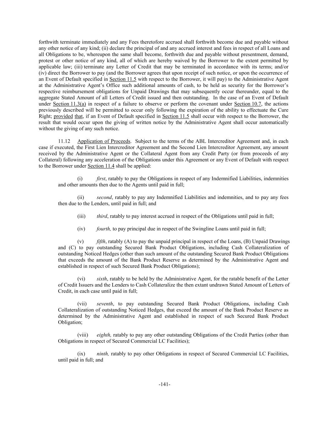 forthwith terminate immediately and any Fees theretofore accrued shall forthwith become due and payable without any other notice of any kind; (ii) declare the principal of and any accrued interest and fees in respect of all Loans and all Obligations to be, whereupon the same shall become, forthwith due and payable without presentment, demand, protest or other notice of any kind, all of which are hereby waived by the Borrower to the extent permitted by applicable law; (iii) terminate any Letter of Credit that may be terminated in accordance with its terms; and/or (iv) direct the Borrower to pay (and the Borrower agrees that upon receipt of such notice, or upon the occurrence of an Event of Default specified in Section 11.5 with respect to the Borrower, it will pay) to the Administrative Agent at the Administrative Agent’s Office such additional amounts of cash, to be held as security for the Borrower’s respective reimbursement obligations for Unpaid Drawings that may subsequently occur thereunder, equal to the aggregate Stated Amount of all Letters of Credit issued and then outstanding. In the case of an Event of Default under Section 11.3(a) in respect of a failure to observe or perform the covenant under Section 10.7, the actions previously described will be permitted to occur only following the expiration of the ability to effectuate the Cure Right; provided that, if an Event of Default specified in Section 11.5 shall occur with respect to the Borrower, the result that would occur upon the giving of written notice by the Administrative Agent shall occur automatically without the giving of any such notice. 11.12 Application of Proceeds. Subject to the terms of the ABL Intercreditor Agreement and, in each case if executed, the First Lien Intercreditor Agreement and the Second Lien Intercreditor Agreement, any amount received by the Administrative Agent or the Collateral Agent from any Credit Party (or from proceeds of any Collateral) following any acceleration of the Obligations under this Agreement or any Event of Default with respect to the Borrower under Section 11.4 shall be applied: (i) first, ratably to pay the Obligations in respect of any Indemnified Liabilities, indemnities and other amounts then due to the Agents until paid in full; (ii) second, ratably to pay any Indemnified Liabilities and indemnities, and to pay any fees then due to the Lenders, until paid in full; and (iii) third, ratably to pay interest accrued in respect of the Obligations until paid in full; (iv) fourth, to pay principal due in respect of the Swingline Loans until paid in full; (v) fifth, ratably (A) to pay the unpaid principal in respect of the Loans, (B) Unpaid Drawings and (C) to pay outstanding Secured Bank Product Obligations, including Cash Collateralization of outstanding Noticed Hedges (other than such amount of the outstanding Secured Bank Product Obligations that exceeds the amount of the Bank Product Reserve as determined by the Administrative Agent and established in respect of such Secured Bank Product Obligations); (vi) sixth, ratably to be held by the Administrative Agent, for the ratable benefit of the Letter of Credit Issuers and the Lenders to Cash Collateralize the then extant undrawn Stated Amount of Letters of Credit, in each case until paid in full; (vii) seventh, to pay outstanding Secured Bank Product Obligations, including Cash Collateralization of outstanding Noticed Hedges, that exceed the amount of the Bank Product Reserve as determined by the Administrative Agent and established in respect of such Secured Bank Product Obligation; (viii) eighth, ratably to pay any other outstanding Obligations of the Credit Parties (other than Obligations in respect of Secured Commercial LC Facilities); (ix) ninth, ratably to pay other Obligations in respect of Secured Commercial LC Facilities, until paid in full; and -141-