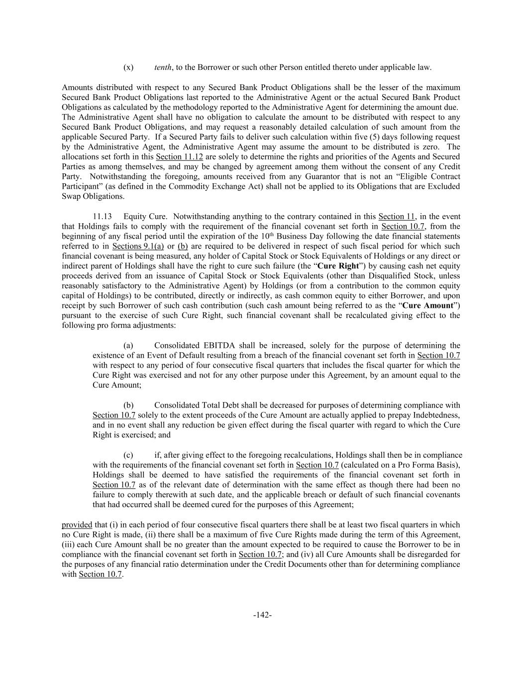 (x) tenth, to the Borrower or such other Person entitled thereto under applicable law. Amounts distributed with respect to any Secured Bank Product Obligations shall be the lesser of the maximum Secured Bank Product Obligations last reported to the Administrative Agent or the actual Secured Bank Product Obligations as calculated by the methodology reported to the Administrative Agent for determining the amount due. The Administrative Agent shall have no obligation to calculate the amount to be distributed with respect to any Secured Bank Product Obligations, and may request a reasonably detailed calculation of such amount from the applicable Secured Party. If a Secured Party fails to deliver such calculation within five (5) days following request by the Administrative Agent, the Administrative Agent may assume the amount to be distributed is zero. The allocations set forth in this Section 11.12 are solely to determine the rights and priorities of the Agents and Secured Parties as among themselves, and may be changed by agreement among them without the consent of any Credit Party. Notwithstanding the foregoing, amounts received from any Guarantor that is not an “Eligible Contract Participant” (as defined in the Commodity Exchange Act) shall not be applied to its Obligations that are Excluded Swap Obligations. 11.13 Equity Cure. Notwithstanding anything to the contrary contained in this Section 11, in the event that Holdings fails to comply with the requirement of the financial covenant set forth in Section 10.7, from the beginning of any fiscal period until the expiration of the 10th Business Day following the date financial statements referred to in Sections 9.1(a) or (b) are required to be delivered in respect of such fiscal period for which such financial covenant is being measured, any holder of Capital Stock or Stock Equivalents of Holdings or any direct or indirect parent of Holdings shall have the right to cure such failure (the “Cure Right”) by causing cash net equity proceeds derived from an issuance of Capital Stock or Stock Equivalents (other than Disqualified Stock, unless reasonably satisfactory to the Administrative Agent) by Holdings (or from a contribution to the common equity capital of Holdings) to be contributed, directly or indirectly, as cash common equity to either Borrower, and upon receipt by such Borrower of such cash contribution (such cash amount being referred to as the “Cure Amount”) pursuant to the exercise of such Cure Right, such financial covenant shall be recalculated giving effect to the following pro forma adjustments: (a) Consolidated EBITDA shall be increased, solely for the purpose of determining the existence of an Event of Default resulting from a breach of the financial covenant set forth in Section 10.7 with respect to any period of four consecutive fiscal quarters that includes the fiscal quarter for which the Cure Right was exercised and not for any other purpose under this Agreement, by an amount equal to the Cure Amount; (b) Consolidated Total Debt shall be decreased for purposes of determining compliance with Section 10.7 solely to the extent proceeds of the Cure Amount are actually applied to prepay Indebtedness, and in no event shall any reduction be given effect during the fiscal quarter with regard to which the Cure Right is exercised; and (c) if, after giving effect to the foregoing recalculations, Holdings shall then be in compliance with the requirements of the financial covenant set forth in Section 10.7 (calculated on a Pro Forma Basis), Holdings shall be deemed to have satisfied the requirements of the financial covenant set forth in Section 10.7 as of the relevant date of determination with the same effect as though there had been no failure to comply therewith at such date, and the applicable breach or default of such financial covenants that had occurred shall be deemed cured for the purposes of this Agreement; provided that (i) in each period of four consecutive fiscal quarters there shall be at least two fiscal quarters in which no Cure Right is made, (ii) there shall be a maximum of five Cure Rights made during the term of this Agreement, (iii) each Cure Amount shall be no greater than the amount expected to be required to cause the Borrower to be in compliance with the financial covenant set forth in Section 10.7; and (iv) all Cure Amounts shall be disregarded for the purposes of any financial ratio determination under the Credit Documents other than for determining compliance with Section 10.7. -142-