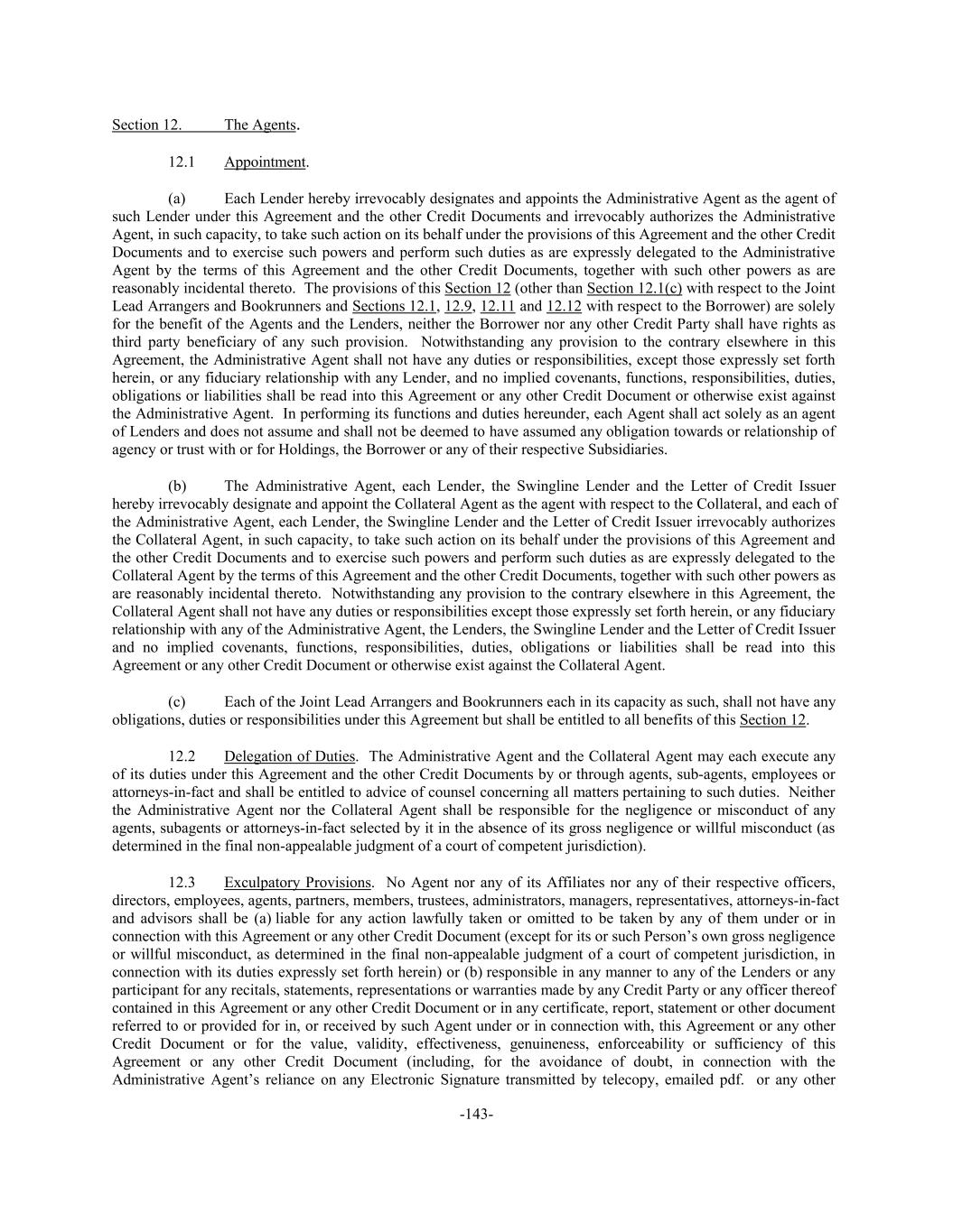 Section 12. The Agents. 12.1 Appointment. (a) Each Lender hereby irrevocably designates and appoints the Administrative Agent as the agent of such Lender under this Agreement and the other Credit Documents and irrevocably authorizes the Administrative Agent, in such capacity, to take such action on its behalf under the provisions of this Agreement and the other Credit Documents and to exercise such powers and perform such duties as are expressly delegated to the Administrative Agent by the terms of this Agreement and the other Credit Documents, together with such other powers as are reasonably incidental thereto. The provisions of this Section 12 (other than Section 12.1(c) with respect to the Joint Lead Arrangers and Bookrunners and Sections 12.1, 12.9, 12.11 and 12.12 with respect to the Borrower) are solely for the benefit of the Agents and the Lenders, neither the Borrower nor any other Credit Party shall have rights as third party beneficiary of any such provision. Notwithstanding any provision to the contrary elsewhere in this Agreement, the Administrative Agent shall not have any duties or responsibilities, except those expressly set forth herein, or any fiduciary relationship with any Lender, and no implied covenants, functions, responsibilities, duties, obligations or liabilities shall be read into this Agreement or any other Credit Document or otherwise exist against the Administrative Agent. In performing its functions and duties hereunder, each Agent shall act solely as an agent of Lenders and does not assume and shall not be deemed to have assumed any obligation towards or relationship of agency or trust with or for Holdings, the Borrower or any of their respective Subsidiaries. (b) The Administrative Agent, each Lender, the Swingline Lender and the Letter of Credit Issuer hereby irrevocably designate and appoint the Collateral Agent as the agent with respect to the Collateral, and each of the Administrative Agent, each Lender, the Swingline Lender and the Letter of Credit Issuer irrevocably authorizes the Collateral Agent, in such capacity, to take such action on its behalf under the provisions of this Agreement and the other Credit Documents and to exercise such powers and perform such duties as are expressly delegated to the Collateral Agent by the terms of this Agreement and the other Credit Documents, together with such other powers as are reasonably incidental thereto. Notwithstanding any provision to the contrary elsewhere in this Agreement, the Collateral Agent shall not have any duties or responsibilities except those expressly set forth herein, or any fiduciary relationship with any of the Administrative Agent, the Lenders, the Swingline Lender and the Letter of Credit Issuer and no implied covenants, functions, responsibilities, duties, obligations or liabilities shall be read into this Agreement or any other Credit Document or otherwise exist against the Collateral Agent. (c) Each of the Joint Lead Arrangers and Bookrunners each in its capacity as such, shall not have any obligations, duties or responsibilities under this Agreement but shall be entitled to all benefits of this Section 12. 12.2 Delegation of Duties. The Administrative Agent and the Collateral Agent may each execute any of its duties under this Agreement and the other Credit Documents by or through agents, sub-agents, employees or attorneys-in-fact and shall be entitled to advice of counsel concerning all matters pertaining to such duties. Neither the Administrative Agent nor the Collateral Agent shall be responsible for the negligence or misconduct of any agents, subagents or attorneys-in-fact selected by it in the absence of its gross negligence or willful misconduct (as determined in the final non-appealable judgment of a court of competent jurisdiction). 12.3 Exculpatory Provisions. No Agent nor any of its Affiliates nor any of their respective officers, directors, employees, agents, partners, members, trustees, administrators, managers, representatives, attorneys-in-fact and advisors shall be (a) liable for any action lawfully taken or omitted to be taken by any of them under or in connection with this Agreement or any other Credit Document (except for its or such Person’s own gross negligence or willful misconduct, as determined in the final non-appealable judgment of a court of competent jurisdiction, in connection with its duties expressly set forth herein) or (b) responsible in any manner to any of the Lenders or any participant for any recitals, statements, representations or warranties made by any Credit Party or any officer thereof contained in this Agreement or any other Credit Document or in any certificate, report, statement or other document referred to or provided for in, or received by such Agent under or in connection with, this Agreement or any other Credit Document or for the value, validity, effectiveness, genuineness, enforceability or sufficiency of this Agreement or any other Credit Document (including, for the avoidance of doubt, in connection with the Administrative Agent’s reliance on any Electronic Signature transmitted by telecopy, emailed pdf. or any other -143-