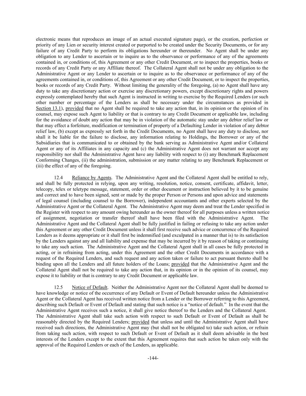 electronic means that reproduces an image of an actual executed signature page), or the creation, perfection or priority of any Lien or security interest created or purported to be created under the Security Documents, or for any failure of any Credit Party to perform its obligations hereunder or thereunder. No Agent shall be under any obligation to any Lender to ascertain or to inquire as to the observance or performance of any of the agreements contained in, or conditions of, this Agreement or any other Credit Document, or to inspect the properties, books or records of any Credit Party or any Affiliate thereof. The Collateral Agent shall not be under any obligation to the Administrative Agent or any Lender to ascertain or to inquire as to the observance or performance of any of the agreements contained in, or conditions of, this Agreement or any other Credit Document, or to inspect the properties, books or records of any Credit Party. Without limiting the generality of the foregoing, (a) no Agent shall have any duty to take any discretionary action or exercise any discretionary powers, except discretionary rights and powers expressly contemplated hereby that such Agent is instructed in writing to exercise by the Required Lenders (or such other number or percentage of the Lenders as shall be necessary under the circumstances as provided in Section 13.1), provided that no Agent shall be required to take any action that, in its opinion or the opinion of its counsel, may expose such Agent to liability or that is contrary to any Credit Document or applicable law, including for the avoidance of doubt any action that may be in violation of the automatic stay under any debtor relief law or that may effect a forfeiture, modification or termination of property of a Defaulting Lender in violation of any debtor relief law, (b) except as expressly set forth in the Credit Documents, no Agent shall have any duty to disclose, nor shall it be liable for the failure to disclose, any information relating to Holdings, the Borrower or any of the Subsidiaries that is communicated to or obtained by the bank serving as Administrative Agent and/or Collateral Agent or any of its Affiliates in any capacity and (c) the Administrative Agent does not warrant nor accept any responsibility nor shall the Administrative Agent have any liability with respect to (i) any Benchmark Replacement Conforming Changes, (ii) the administration, submission or any matter relating to any Benchmark Replacement or (iii) the effect of any of the foregoing. 12.4 Reliance by Agents. The Administrative Agent and the Collateral Agent shall be entitled to rely, and shall be fully protected in relying, upon any writing, resolution, notice, consent, certificate, affidavit, letter, telecopy, telex or teletype message, statement, order or other document or instruction believed by it to be genuine and correct and to have been signed, sent or made by the proper Person or Persons and upon advice and statements of legal counsel (including counsel to the Borrower), independent accountants and other experts selected by the Administrative Agent or the Collateral Agent. The Administrative Agent may deem and treat the Lender specified in the Register with respect to any amount owing hereunder as the owner thereof for all purposes unless a written notice of assignment, negotiation or transfer thereof shall have been filed with the Administrative Agent. The Administrative Agent and the Collateral Agent shall be fully justified in failing or refusing to take any action under this Agreement or any other Credit Document unless it shall first receive such advice or concurrence of the Required Lenders as it deems appropriate or it shall first be indemnified (and exculpated in a manner that is) to its satisfaction by the Lenders against any and all liability and expense that may be incurred by it by reason of taking or continuing to take any such action. The Administrative Agent and the Collateral Agent shall in all cases be fully protected in acting, or in refraining from acting, under this Agreement and the other Credit Documents in accordance with a request of the Required Lenders, and such request and any action taken or failure to act pursuant thereto shall be binding upon all the Lenders and all future holders of the Loans; provided that the Administrative Agent and the Collateral Agent shall not be required to take any action that, in its opinion or in the opinion of its counsel, may expose it to liability or that is contrary to any Credit Document or applicable law. 12.5 Notice of Default. Neither the Administrative Agent nor the Collateral Agent shall be deemed to have knowledge or notice of the occurrence of any Default or Event of Default hereunder unless the Administrative Agent or the Collateral Agent has received written notice from a Lender or the Borrower referring to this Agreement, describing such Default or Event of Default and stating that such notice is a “notice of default.” In the event that the Administrative Agent receives such a notice, it shall give notice thereof to the Lenders and the Collateral Agent. The Administrative Agent shall take such action with respect to such Default or Event of Default as shall be reasonably directed by the Required Lenders; provided that unless and until the Administrative Agent shall have received such directions, the Administrative Agent may (but shall not be obligated to) take such action, or refrain from taking such action, with respect to such Default or Event of Default as it shall deem advisable in the best interests of the Lenders except to the extent that this Agreement requires that such action be taken only with the approval of the Required Lenders or each of the Lenders, as applicable. -144-