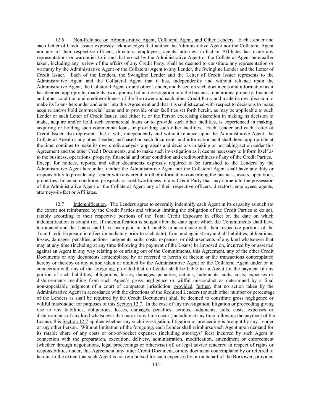 12.6 Non-Reliance on Administrative Agent, Collateral Agent, and Other Lenders. Each Lender and each Letter of Credit Issuer expressly acknowledges that neither the Administrative Agent nor the Collateral Agent nor any of their respective officers, directors, employees, agents, attorneys-in-fact or Affiliates has made any representations or warranties to it and that no act by the Administrative Agent or the Collateral Agent hereinafter taken, including any review of the affairs of any Credit Party, shall be deemed to constitute any representation or warranty by the Administrative Agent or the Collateral Agent to any Lender, the Swingline Lender and the Letter of Credit Issuer. Each of the Lenders, the Swingline Lender and the Letter of Credit Issuer represents to the Administrative Agent and the Collateral Agent that it has, independently and without reliance upon the Administrative Agent, the Collateral Agent or any other Lender, and based on such documents and information as it has deemed appropriate, made its own appraisal of an investigation into the business, operations, property, financial and other condition and creditworthiness of the Borrower and each other Credit Party and made its own decision to make its Loans hereunder and enter into this Agreement and that it is sophisticated with respect to decisions to make, acquire and/or hold commercial loans and to provide other facilities set forth herein, as may be applicable to such Lender or such Letter of Credit Issuer, and either it, or the Person exercising discretion in making its decision to make, acquire and/or hold such commercial loans or to provide such other facilities, is experienced in making, acquiring or holding such commercial loans or providing such other facilities. Each Lender and each Letter of Credit Issuer also represents that it will, independently and without reliance upon the Administrative Agent, the Collateral Agent or any other Lender, and based on such documents and information as it shall deem appropriate at the time, continue to make its own credit analysis, appraisals and decisions in taking or not taking action under this Agreement and the other Credit Documents, and to make such investigation as it deems necessary to inform itself as to the business, operations, property, financial and other condition and creditworthiness of any of the Credit Parties. Except for notices, reports, and other documents expressly required to be furnished to the Lenders by the Administrative Agent hereunder, neither the Administrative Agent nor the Collateral Agent shall have any duty or responsibility to provide any Lender with any credit or other information concerning the business, assets, operations, properties, financial condition, prospects or creditworthiness of any Credit Party that may come into the possession of the Administrative Agent or the Collateral Agent any of their respective officers, directors, employees, agents, attorneys-in-fact or Affiliates. 12.7 Indemnification. The Lenders agree to severally indemnify each Agent in its capacity as such (to the extent not reimbursed by the Credit Parties and without limiting the obligation of the Credit Parties to do so), ratably according to their respective portions of the Total Credit Exposure in effect on the date on which indemnification is sought (or, if indemnification is sought after the date upon which the Commitments shall have terminated and the Loans shall have been paid in full, ratably in accordance with their respective portions of the Total Credit Exposure in effect immediately prior to such date), from and against any and all liabilities, obligations, losses, damages, penalties, actions, judgments, suits, costs, expenses, or disbursements of any kind whatsoever that may at any time (including at any time following the payment of the Loans) be imposed on, incurred by or asserted against an Agent in any way relating to or arising out of the Commitments, this Agreement, any of the other Credit Documents or any documents contemplated by or referred to herein or therein or the transactions contemplated hereby or thereby or any action taken or omitted by the Administrative Agent or the Collateral Agent under or in connection with any of the foregoing; provided that no Lender shall be liable to an Agent for the payment of any portion of such liabilities, obligations, losses, damages, penalties, actions, judgments, suits, costs, expenses or disbursements resulting from such Agent’s gross negligence or willful misconduct as determined by a final non-appealable judgment of a court of competent jurisdiction; provided, further, that no action taken by the Administrative Agent in accordance with the directions of the Required Lenders (or such other number or percentage of the Lenders as shall be required by the Credit Documents) shall be deemed to constitute gross negligence or willful misconduct for purposes of this Section 12.7. In the case of any investigation, litigation or proceeding giving rise to any liabilities, obligations, losses, damages, penalties, actions, judgments, suits, costs, expenses or disbursements of any kind whatsoever that may at any time occur (including at any time following the payment of the Loans), this Section 12.7 applies whether any such investigation, litigation or proceeding is brought by any Lender or any other Person. Without limitation of the foregoing, each Lender shall reimburse each Agent upon demand for its ratable share of any costs or out-of-pocket expenses (including attorneys’ fees) incurred by such Agent in connection with the preparation, execution, delivery, administration, modification, amendment or enforcement (whether through negotiations, legal proceedings or otherwise) of, or legal advice rendered in respect of rights or responsibilities under, this Agreement, any other Credit Document, or any document contemplated by or referred to herein, to the extent that such Agent is not reimbursed for such expens