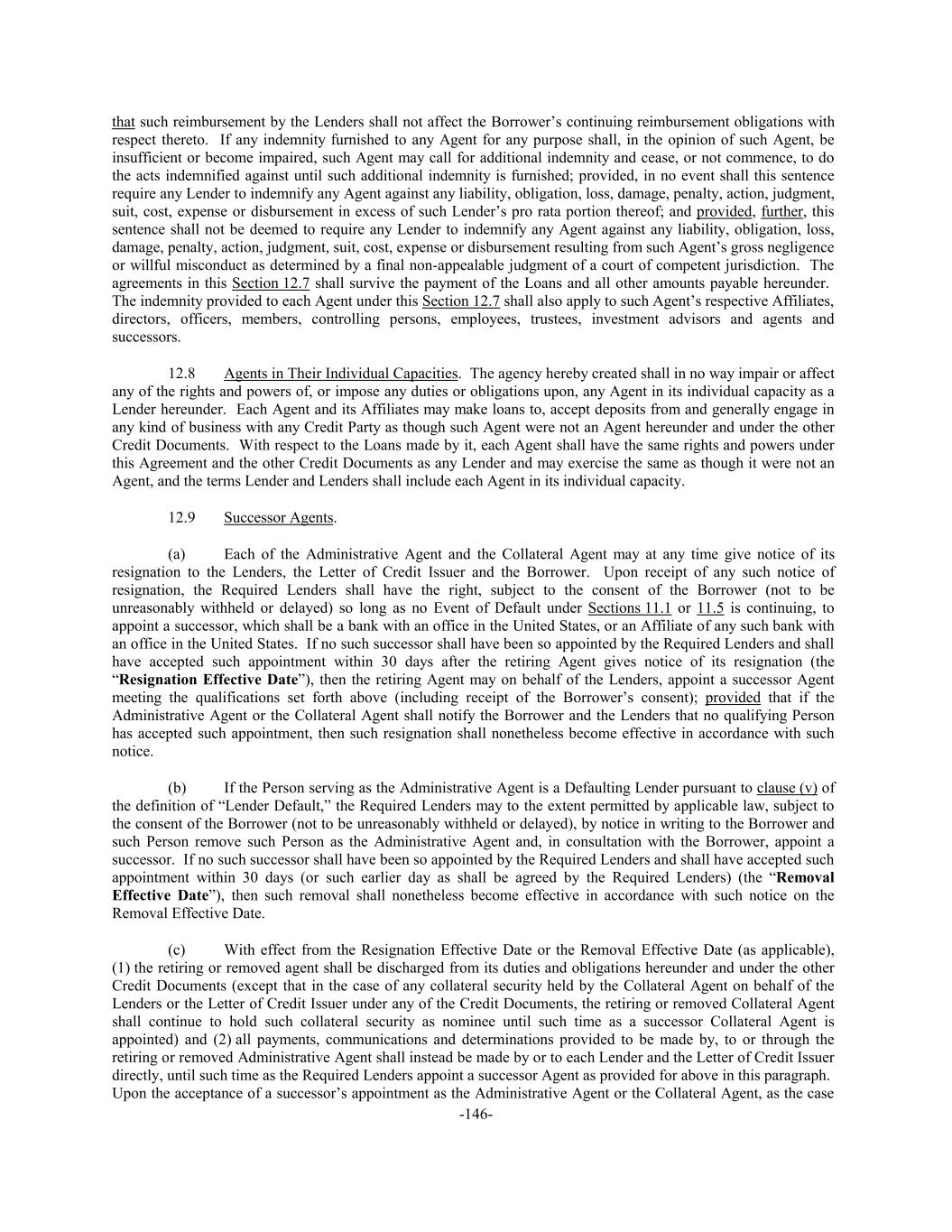 that such reimbursement by the Lenders shall not affect the Borrower’s continuing reimbursement obligations with respect thereto. If any indemnity furnished to any Agent for any purpose shall, in the opinion of such Agent, be insufficient or become impaired, such Agent may call for additional indemnity and cease, or not commence, to do the acts indemnified against until such additional indemnity is furnished; provided, in no event shall this sentence require any Lender to indemnify any Agent against any liability, obligation, loss, damage, penalty, action, judgment, suit, cost, expense or disbursement in excess of such Lender’s pro rata portion thereof; and provided, further, this sentence shall not be deemed to require any Lender to indemnify any Agent against any liability, obligation, loss, damage, penalty, action, judgment, suit, cost, expense or disbursement resulting from such Agent’s gross negligence or willful misconduct as determined by a final non-appealable judgment of a court of competent jurisdiction. The agreements in this Section 12.7 shall survive the payment of the Loans and all other amounts payable hereunder. The indemnity provided to each Agent under this Section 12.7 shall also apply to such Agent’s respective Affiliates, directors, officers, members, controlling persons, employees, trustees, investment advisors and agents and successors. 12.8 Agents in Their Individual Capacities. The agency hereby created shall in no way impair or affect any of the rights and powers of, or impose any duties or obligations upon, any Agent in its individual capacity as a Lender hereunder. Each Agent and its Affiliates may make loans to, accept deposits from and generally engage in any kind of business with any Credit Party as though such Agent were not an Agent hereunder and under the other Credit Documents. With respect to the Loans made by it, each Agent shall have the same rights and powers under this Agreement and the other Credit Documents as any Lender and may exercise the same as though it were not an Agent, and the terms Lender and Lenders shall include each Agent in its individual capacity. 12.9 Successor Agents. (a) Each of the Administrative Agent and the Collateral Agent may at any time give notice of its resignation to the Lenders, the Letter of Credit Issuer and the Borrower. Upon receipt of any such notice of resignation, the Required Lenders shall have the right, subject to the consent of the Borrower (not to be unreasonably withheld or delayed) so long as no Event of Default under Sections 11.1 or 11.5 is continuing, to appoint a successor, which shall be a bank with an office in the United States, or an Affiliate of any such bank with an office in the United States. If no such successor shall have been so appointed by the Required Lenders and shall have accepted such appointment within 30 days after the retiring Agent gives notice of its resignation (the “Resignation Effective Date”), then the retiring Agent may on behalf of the Lenders, appoint a successor Agent meeting the qualifications set forth above (including receipt of the Borrower’s consent); provided that if the Administrative Agent or the Collateral Agent shall notify the Borrower and the Lenders that no qualifying Person has accepted such appointment, then such resignation shall nonetheless become effective in accordance with such notice. (b) If the Person serving as the Administrative Agent is a Defaulting Lender pursuant to clause (v) of the definition of “Lender Default,” the Required Lenders may to the extent permitted by applicable law, subject to the consent of the Borrower (not to be unreasonably withheld or delayed), by notice in writing to the Borrower and such Person remove such Person as the Administrative Agent and, in consultation with the Borrower, appoint a successor. If no such successor shall have been so appointed by the Required Lenders and shall have accepted such appointment within 30 days (or such earlier day as shall be agreed by the Required Lenders) (the “Removal Effective Date”), then such removal shall nonetheless become effective in accordance with such notice on the Removal Effective Date. (c) With effect from the Resignation Effective Date or the Removal Effective Date (as applicable), (1) the retiring or removed agent shall be discharged from its duties and obligations hereunder and under the other Credit Documents (except that in the case of any collateral security held by the Collateral Agent on behalf of the Lenders or the Letter of Credit Issuer under any of the Credit Documents, the retiring or removed Collateral Agent shall continue to hold such collateral security as nominee until such time as a successor Collateral Agent is appointed) and (2) all payments, communications and determinations provided to be made by, to or through the retiring or removed Administrative Agent shall instead be made by or to each Lender and the Letter of Credit Issuer directly, until such time as the Required Lenders appoint a successor Agent as provided for above in this paragraph. Upon the acceptance of a successor’s appointment as the Administrative Agent or the Collateral Agent, as the case -146-