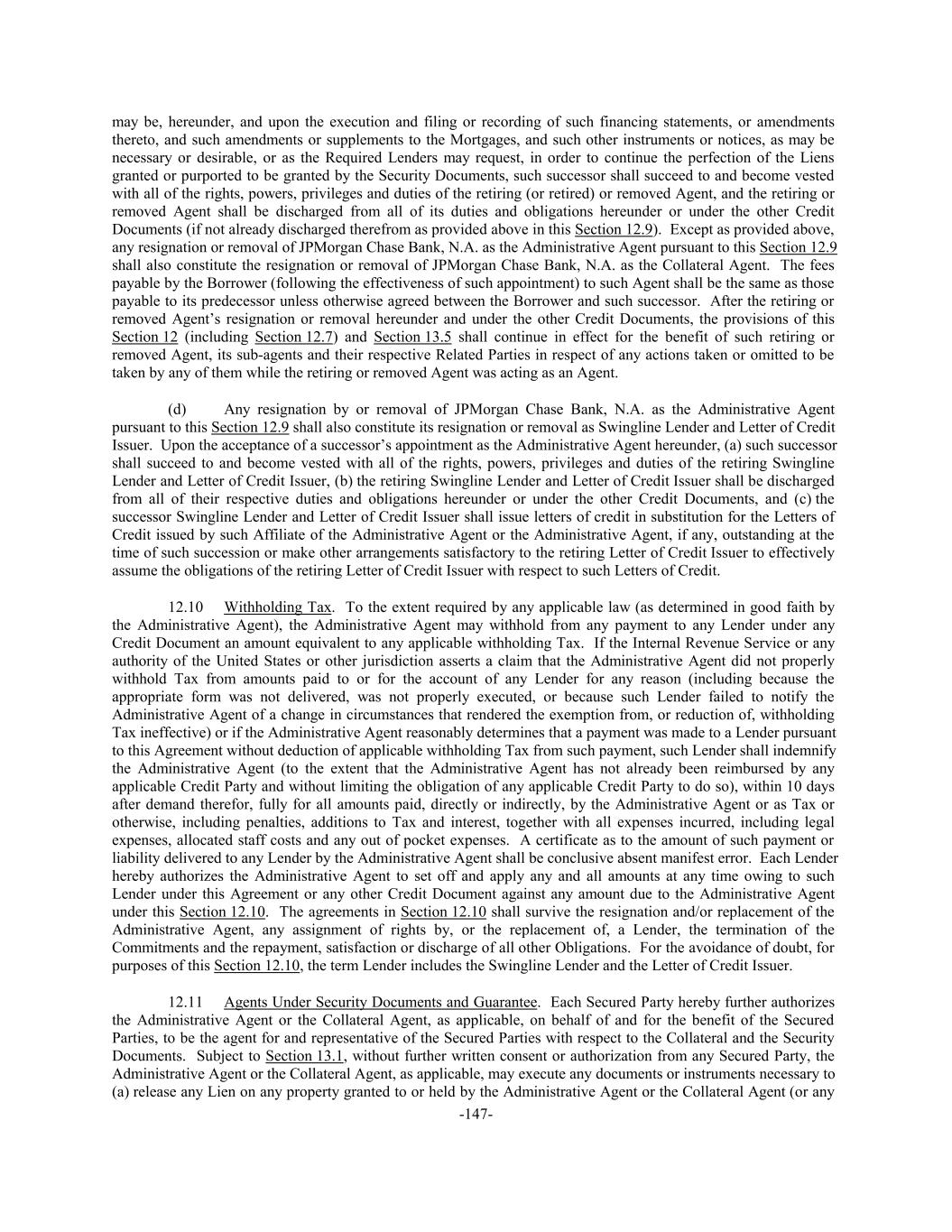 may be, hereunder, and upon the execution and filing or recording of such financing statements, or amendments thereto, and such amendments or supplements to the Mortgages, and such other instruments or notices, as may be necessary or desirable, or as the Required Lenders may request, in order to continue the perfection of the Liens granted or purported to be granted by the Security Documents, such successor shall succeed to and become vested with all of the rights, powers, privileges and duties of the retiring (or retired) or removed Agent, and the retiring or removed Agent shall be discharged from all of its duties and obligations hereunder or under the other Credit Documents (if not already discharged therefrom as provided above in this Section 12.9). Except as provided above, any resignation or removal of JPMorgan Chase Bank, N.A. as the Administrative Agent pursuant to this Section 12.9 shall also constitute the resignation or removal of JPMorgan Chase Bank, N.A. as the Collateral Agent. The fees payable by the Borrower (following the effectiveness of such appointment) to such Agent shall be the same as those payable to its predecessor unless otherwise agreed between the Borrower and such successor. After the retiring or removed Agent’s resignation or removal hereunder and under the other Credit Documents, the provisions of this Section 12 (including Section 12.7) and Section 13.5 shall continue in effect for the benefit of such retiring or removed Agent, its sub-agents and their respective Related Parties in respect of any actions taken or omitted to be taken by any of them while the retiring or removed Agent was acting as an Agent. (d) Any resignation by or removal of JPMorgan Chase Bank, N.A. as the Administrative Agent pursuant to this Section 12.9 shall also constitute its resignation or removal as Swingline Lender and Letter of Credit Issuer. Upon the acceptance of a successor’s appointment as the Administrative Agent hereunder, (a) such successor shall succeed to and become vested with all of the rights, powers, privileges and duties of the retiring Swingline Lender and Letter of Credit Issuer, (b) the retiring Swingline Lender and Letter of Credit Issuer shall be discharged from all of their respective duties and obligations hereunder or under the other Credit Documents, and (c) the successor Swingline Lender and Letter of Credit Issuer shall issue letters of credit in substitution for the Letters of Credit issued by such Affiliate of the Administrative Agent or the Administrative Agent, if any, outstanding at the time of such succession or make other arrangements satisfactory to the retiring Letter of Credit Issuer to effectively assume the obligations of the retiring Letter of Credit Issuer with respect to such Letters of Credit. 12.10 Withholding Tax. To the extent required by any applicable law (as determined in good faith by the Administrative Agent), the Administrative Agent may withhold from any payment to any Lender under any Credit Document an amount equivalent to any applicable withholding Tax. If the Internal Revenue Service or any authority of the United States or other jurisdiction asserts a claim that the Administrative Agent did not properly withhold Tax from amounts paid to or for the account of any Lender for any reason (including because the appropriate form was not delivered, was not properly executed, or because such Lender failed to notify the Administrative Agent of a change in circumstances that rendered the exemption from, or reduction of, withholding Tax ineffective) or if the Administrative Agent reasonably determines that a payment was made to a Lender pursuant to this Agreement without deduction of applicable withholding Tax from such payment, such Lender shall indemnify the Administrative Agent (to the extent that the Administrative Agent has not already been reimbursed by any applicable Credit Party and without limiting the obligation of any applicable Credit Party to do so), within 10 days after demand therefor, fully for all amounts paid, directly or indirectly, by the Administrative Agent or as Tax or otherwise, including penalties, additions to Tax and interest, together with all expenses incurred, including legal expenses, allocated staff costs and any out of pocket expenses. A certificate as to the amount of such payment or liability delivered to any Lender by the Administrative Agent shall be conclusive absent manifest error. Each Lender hereby authorizes the Administrative Agent to set off and apply any and all amounts at any time owing to such Lender under this Agreement or any other Credit Document against any amount due to the Administrative Agent under this Section 12.10. The agreements in Section 12.10 shall survive the resignation and/or replacement of the Administrative Agent, any assignment of rights by, or the replacement of, a Lender, the termination of the Commitments and the repayment, satisfaction or discharge of all other Obligations. For the avoidance of doubt, for purposes of this Section 12.10, the term Lender includes the Swingline Lender and the Letter of Credit Issuer. 12.11 Agents Under Security Documents and Guarantee. Each Secured Party hereby further authorizes the Administrative Agent or the Collateral Agent, as applicable, on behalf of and for the benefit of the Secured Parties, to be the agent for and representative of the Secured Parties with respect to the Collateral and the Security Documents. Subject to Section 13.1, without further written consent or authorization from any Secured Party, the Administrative Agent or the Collateral Agent, as applicable, may execute any documents or instruments necessary to (a) release any Lien on any property granted to or held by the Administrative Agent or the Collateral Agent (or any -147-