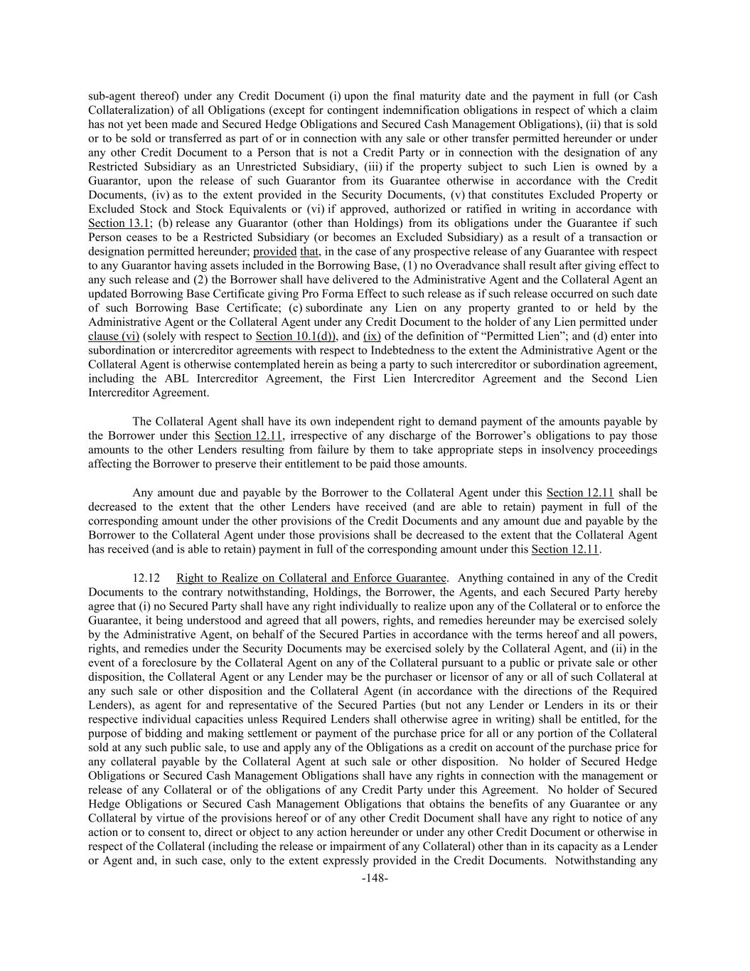 sub-agent thereof) under any Credit Document (i) upon the final maturity date and the payment in full (or Cash Collateralization) of all Obligations (except for contingent indemnification obligations in respect of which a claim has not yet been made and Secured Hedge Obligations and Secured Cash Management Obligations), (ii) that is sold or to be sold or transferred as part of or in connection with any sale or other transfer permitted hereunder or under any other Credit Document to a Person that is not a Credit Party or in connection with the designation of any Restricted Subsidiary as an Unrestricted Subsidiary, (iii) if the property subject to such Lien is owned by a Guarantor, upon the release of such Guarantor from its Guarantee otherwise in accordance with the Credit Documents, (iv) as to the extent provided in the Security Documents, (v) that constitutes Excluded Property or Excluded Stock and Stock Equivalents or (vi) if approved, authorized or ratified in writing in accordance with Section 13.1; (b) release any Guarantor (other than Holdings) from its obligations under the Guarantee if such Person ceases to be a Restricted Subsidiary (or becomes an Excluded Subsidiary) as a result of a transaction or designation permitted hereunder; provided that, in the case of any prospective release of any Guarantee with respect to any Guarantor having assets included in the Borrowing Base, (1) no Overadvance shall result after giving effect to any such release and (2) the Borrower shall have delivered to the Administrative Agent and the Collateral Agent an updated Borrowing Base Certificate giving Pro Forma Effect to such release as if such release occurred on such date of such Borrowing Base Certificate; (c) subordinate any Lien on any property granted to or held by the Administrative Agent or the Collateral Agent under any Credit Document to the holder of any Lien permitted under clause (vi) (solely with respect to Section 10.1(d)), and (ix) of the definition of “Permitted Lien”; and (d) enter into subordination or intercreditor agreements with respect to Indebtedness to the extent the Administrative Agent or the Collateral Agent is otherwise contemplated herein as being a party to such intercreditor or subordination agreement, including the ABL Intercreditor Agreement, the First Lien Intercreditor Agreement and the Second Lien Intercreditor Agreement. The Collateral Agent shall have its own independent right to demand payment of the amounts payable by the Borrower under this Section 12.11, irrespective of any discharge of the Borrower’s obligations to pay those amounts to the other Lenders resulting from failure by them to take appropriate steps in insolvency proceedings affecting the Borrower to preserve their entitlement to be paid those amounts. Any amount due and payable by the Borrower to the Collateral Agent under this Section 12.11 shall be decreased to the extent that the other Lenders have received (and are able to retain) payment in full of the corresponding amount under the other provisions of the Credit Documents and any amount due and payable by the Borrower to the Collateral Agent under those provisions shall be decreased to the extent that the Collateral Agent has received (and is able to retain) payment in full of the corresponding amount under this Section 12.11. 12.12 Right to Realize on Collateral and Enforce Guarantee. Anything contained in any of the Credit Documents to the contrary notwithstanding, Holdings, the Borrower, the Agents, and each Secured Party hereby agree that (i) no Secured Party shall have any right individually to realize upon any of the Collateral or to enforce the Guarantee, it being understood and agreed that all powers, rights, and remedies hereunder may be exercised solely by the Administrative Agent, on behalf of the Secured Parties in accordance with the terms hereof and all powers, rights, and remedies under the Security Documents may be exercised solely by the Collateral Agent, and (ii) in the event of a foreclosure by the Collateral Agent on any of the Collateral pursuant to a public or private sale or other disposition, the Collateral Agent or any Lender may be the purchaser or licensor of any or all of such Collateral at any such sale or other disposition and the Collateral Agent (in accordance with the directions of the Required Lenders), as agent for and representative of the Secured Parties (but not any Lender or Lenders in its or their respective individual capacities unless Required Lenders shall otherwise agree in writing) shall be entitled, for the purpose of bidding and making settlement or payment of the purchase price for all or any portion of the Collateral sold at any such public sale, to use and apply any of the Obligations as a credit on account of the purchase price for any collateral payable by the Collateral Agent at such sale or other disposition. No holder of Secured Hedge Obligations or Secured Cash Management Obligations shall have any rights in connection with the management or release of any Collateral or of the obligations of any Credit Party under this Agreement. No holder of Secured Hedge Obligations or Secured Cash Management Obligations that obtains the benefits of any Guarantee or any Collateral by virtue of the provisions hereof or of any other Credit Document shall have any right to notice of any action or to consent to, direct or object to any action hereunder or under any other Credit Document or otherwise in respect of the Collateral (including the release or impairment of any Collateral) other than in its capacity as a Lender or Agent and, in such case, only to the extent expressly provided in the Credit Documents. Notwithstanding any -148-