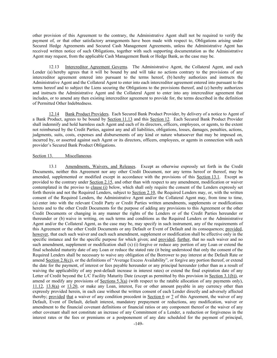 other provision of this Agreement to the contrary, the Administrative Agent shall not be required to verify the payment of, or that other satisfactory arrangements have been made with respect to, Obligations arising under Secured Hedge Agreements and Secured Cash Management Agreements, unless the Administrative Agent has received written notice of such Obligations, together with such supporting documentation as the Administrative Agent may request, from the applicable Cash Management Bank or Hedge Bank, as the case may be. 12.13 Intercreditor Agreement Governs. The Administrative Agent, the Collateral Agent, and each Lender (a) hereby agrees that it will be bound by and will take no actions contrary to the provisions of any intercreditor agreement entered into pursuant to the terms hereof, (b) hereby authorizes and instructs the Administrative Agent and the Collateral Agent to enter into each intercreditor agreement entered into pursuant to the terms hereof and to subject the Liens securing the Obligations to the provisions thereof, and (c) hereby authorizes and instructs the Administrative Agent and the Collateral Agent to enter into any intercreditor agreement that includes, or to amend any then existing intercreditor agreement to provide for, the terms described in the definition of Permitted Other Indebtedness. 12.14 Bank Product Providers. Each Secured Bank Product Provider, by delivery of a notice to Agent of a Bank Product, agrees to be bound by Section 11.13 and this Section 12. Each Secured Bank Product Provider shall indemnify and hold harmless each Agent and each of its directors, officers, employees, or agents, to the extent not reimbursed by the Credit Parties, against any and all liabilities, obligations, losses, damages, penalties, actions, judgments, suits, costs, expenses and disbursements of any kind or nature whatsoever that may be imposed on, incurred by, or asserted against such Agent or its directors, officers, employees, or agents in connection with such provider’s Secured Bank Product Obligations. Section 13. Miscellaneous. 13.1 Amendments, Waivers, and Releases. Except as otherwise expressly set forth in the Credit Documents, neither this Agreement nor any other Credit Document, nor any terms hereof or thereof, may be amended, supplemented or modified except in accordance with the provisions of this Section 13.1. Except as provided to the contrary under Section 2.15, and other than with respect to any amendment, modification or waiver contemplated in the proviso to clause (i) below, which shall only require the consent of the Lenders expressly set forth therein and not the Required Lenders, subject to Section 2.10, the Required Lenders may, or, with the written consent of the Required Lenders, the Administrative Agent and/or the Collateral Agent may, from time to time, (a) enter into with the relevant Credit Party or Credit Parties written amendments, supplements or modifications hereto and to the other Credit Documents for the purpose of adding any provisions to this Agreement or the other Credit Documents or changing in any manner the rights of the Lenders or of the Credit Parties hereunder or thereunder or (b) waive in writing, on such terms and conditions as the Required Lenders or the Administrative Agent and/or the Collateral Agent, as the case may be, may specify in such instrument, any of the requirements of this Agreement or the other Credit Documents or any Default or Event of Default and its consequences; provided, however, that each such waiver and each such amendment, supplement or modification shall be effective only in the specific instance and for the specific purpose for which given; and provided, further, that no such waiver and no such amendment, supplement or modification shall (x) (i) forgive or reduce any portion of any Loan or extend the final scheduled maturity date of any Loan or reduce the stated rate (it being understood that only the consent of the Required Lenders shall be necessary to waive any obligation of the Borrower to pay interest at the Default Rate or amend Section 2.8(c)), or the definitions of “Average Excess Availability”, or forgive any portion thereof, or extend the date for the payment, of interest or fees payable hereunder or any principal hereunder (other than as a result of waiving the applicability of any post-default increase in interest rates) or extend the final expiration date of any Letter of Credit beyond the L/C Facility Maturity Date (except as permitted by this provision in Section 3.1(b)), or amend or modify any provisions of Sections 5.3(a) (with respect to the ratable allocation of any payments only), 11.12, 13.8(a) or 13.20, or make any Loan, interest, Fee or other amount payable in any currency other than expressly provided herein, in each case without the written consent of each Lender directly and adversely affected thereby; provided that a waiver of any condition precedent in Section 6 or 7 of this Agreement, the waiver of any Default, Event of Default, default interest, mandatory prepayment or reductions, any modification, waiver or amendment to the financial covenant definitions or financial ratios or any component thereof or the waiver of any other covenant shall not constitute an increase of any Commitment of a Lender, a reduction or forgiveness in the interest rates or the fees or premiums or a postponement of any date scheduled for the payment of principal, -149-