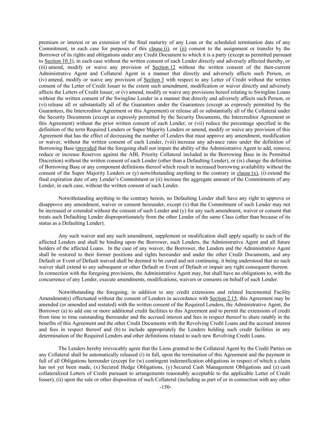 premium or interest or an extension of the final maturity of any Loan or the scheduled termination date of any Commitment, in each case for purposes of this clause (i), or (ii) consent to the assignment or transfer by the Borrower of its rights and obligations under any Credit Document to which it is a party (except as permitted pursuant to Section 10.3), in each case without the written consent of each Lender directly and adversely affected thereby, or (iii) amend, modify or waive any provision of Section 12 without the written consent of the then-current Administrative Agent and Collateral Agent in a manner that directly and adversely affects such Person, or (iv) amend, modify or waive any provision of Section 3 with respect to any Letter of Credit without the written consent of the Letter of Credit Issuer to the extent such amendment, modification or waiver directly and adversely affects the Letters of Credit Issuer, or (v) amend, modify or waive any provisions hereof relating to Swingline Loans without the written consent of the Swingline Lender in a manner that directly and adversely affects such Person, or (vi) release all or substantially all of the Guarantors under the Guarantees (except as expressly permitted by the Guarantees, the Intercreditor Agreement or this Agreement) or release all or substantially all of the Collateral under the Security Documents (except as expressly permitted by the Security Documents, the Intercreditor Agreement or this Agreement) without the prior written consent of each Lender, or (vii) reduce the percentage specified in the definition of the term Required Lenders or Super Majority Lenders or amend, modify or waive any provision of this Agreement that has the effect of decreasing the number of Lenders that must approve any amendment, modification or waiver, without the written consent of each Lender, (viii) increase any advance rates under the definition of Borrowing Base (provided that the foregoing shall not impair the ability of the Administrative Agent to add, remove, reduce or increase Reserves against the ABL Priority Collateral included in the Borrowing Base in its Permitted Discretion) without the written consent of each Lender (other than a Defaulting Lender), or (ix) change the definition of Borrowing Base or any component definitions thereof which result in increased borrowing availability without the consent of the Super Majority Lenders or (y) notwithstanding anything to the contrary in clause (x), (i) extend the final expiration date of any Lender’s Commitment or (ii) increase the aggregate amount of the Commitments of any Lender, in each case, without the written consent of such Lender. Notwithstanding anything to the contrary herein, no Defaulting Lender shall have any right to approve or disapprove any amendment, waiver or consent hereunder, except (x) that the Commitment of such Lender may not be increased or extended without the consent of such Lender and (y) for any such amendment, waiver or consent that treats such Defaulting Lender disproportionately from the other Lender of the same Class (other than because of its status as a Defaulting Lender). Any such waiver and any such amendment, supplement or modification shall apply equally to each of the affected Lenders and shall be binding upon the Borrower, such Lenders, the Administrative Agent and all future holders of the affected Loans. In the case of any waiver, the Borrower, the Lenders and the Administrative Agent shall be restored to their former positions and rights hereunder and under the other Credit Documents, and any Default or Event of Default waived shall be deemed to be cured and not continuing, it being understood that no such waiver shall extend to any subsequent or other Default or Event of Default or impair any right consequent thereon. In connection with the foregoing provisions, the Administrative Agent may, but shall have no obligations to, with the concurrence of any Lender, execute amendments, modifications, waivers or consents on behalf of such Lender. Notwithstanding the foregoing, in addition to any credit extensions and related Incremental Facility Amendment(s) effectuated without the consent of Lenders in accordance with Section 2.15, this Agreement may be amended (or amended and restated) with the written consent of the Required Lenders, the Administrative Agent, the Borrower (a) to add one or more additional credit facilities to this Agreement and to permit the extensions of credit from time to time outstanding thereunder and the accrued interest and fees in respect thereof to share ratably in the benefits of this Agreement and the other Credit Documents with the Revolving Credit Loans and the accrued interest and fees in respect thereof and (b) to include appropriately the Lenders holding such credit facilities in any determination of the Required Lenders and other definitions related to such new Revolving Credit Loans. The Lenders hereby irrevocably agree that the Liens granted to the Collateral Agent by the Credit Parties on any Collateral shall be automatically released (i) in full, upon the termination of this Agreement and the payment in full of all Obligations hereunder (except for (w) contingent indemnification obligations in respect of which a claim has not yet been made, (x) Secured Hedge Obligations, (y) Secured Cash Management Obligations and (z) cash collateralized Letters of Credit pursuant to arrangements reasonably acceptable to the applicable Letter of Credit Issuer), (ii) upon the sale or other disposition of such Collateral (including as part of or in connection with any other -150-