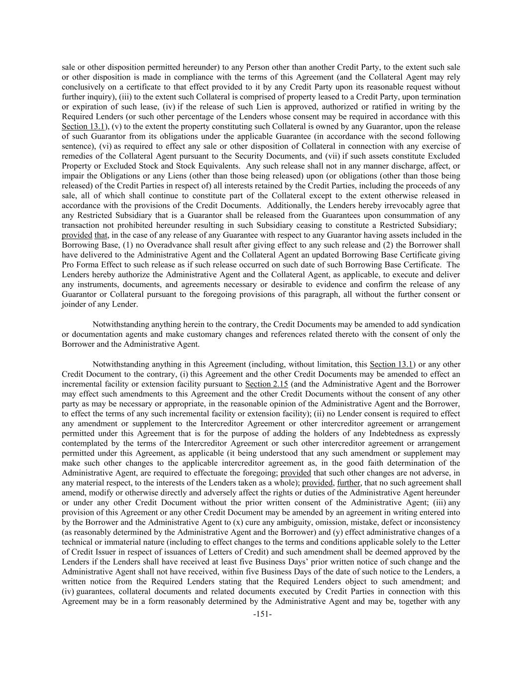 sale or other disposition permitted hereunder) to any Person other than another Credit Party, to the extent such sale or other disposition is made in compliance with the terms of this Agreement (and the Collateral Agent may rely conclusively on a certificate to that effect provided to it by any Credit Party upon its reasonable request without further inquiry), (iii) to the extent such Collateral is comprised of property leased to a Credit Party, upon termination or expiration of such lease, (iv) if the release of such Lien is approved, authorized or ratified in writing by the Required Lenders (or such other percentage of the Lenders whose consent may be required in accordance with this Section 13.1), (v) to the extent the property constituting such Collateral is owned by any Guarantor, upon the release of such Guarantor from its obligations under the applicable Guarantee (in accordance with the second following sentence), (vi) as required to effect any sale or other disposition of Collateral in connection with any exercise of remedies of the Collateral Agent pursuant to the Security Documents, and (vii) if such assets constitute Excluded Property or Excluded Stock and Stock Equivalents. Any such release shall not in any manner discharge, affect, or impair the Obligations or any Liens (other than those being released) upon (or obligations (other than those being released) of the Credit Parties in respect of) all interests retained by the Credit Parties, including the proceeds of any sale, all of which shall continue to constitute part of the Collateral except to the extent otherwise released in accordance with the provisions of the Credit Documents. Additionally, the Lenders hereby irrevocably agree that any Restricted Subsidiary that is a Guarantor shall be released from the Guarantees upon consummation of any transaction not prohibited hereunder resulting in such Subsidiary ceasing to constitute a Restricted Subsidiary; provided that, in the case of any release of any Guarantee with respect to any Guarantor having assets included in the Borrowing Base, (1) no Overadvance shall result after giving effect to any such release and (2) the Borrower shall have delivered to the Administrative Agent and the Collateral Agent an updated Borrowing Base Certificate giving Pro Forma Effect to such release as if such release occurred on such date of such Borrowing Base Certificate. The Lenders hereby authorize the Administrative Agent and the Collateral Agent, as applicable, to execute and deliver any instruments, documents, and agreements necessary or desirable to evidence and confirm the release of any Guarantor or Collateral pursuant to the foregoing provisions of this paragraph, all without the further consent or joinder of any Lender. Notwithstanding anything herein to the contrary, the Credit Documents may be amended to add syndication or documentation agents and make customary changes and references related thereto with the consent of only the Borrower and the Administrative Agent. Notwithstanding anything in this Agreement (including, without limitation, this Section 13.1) or any other Credit Document to the contrary, (i) this Agreement and the other Credit Documents may be amended to effect an incremental facility or extension facility pursuant to Section 2.15 (and the Administrative Agent and the Borrower may effect such amendments to this Agreement and the other Credit Documents without the consent of any other party as may be necessary or appropriate, in the reasonable opinion of the Administrative Agent and the Borrower, to effect the terms of any such incremental facility or extension facility); (ii) no Lender consent is required to effect any amendment or supplement to the Intercreditor Agreement or other intercreditor agreement or arrangement permitted under this Agreement that is for the purpose of adding the holders of any Indebtedness as expressly contemplated by the terms of the Intercreditor Agreement or such other intercreditor agreement or arrangement permitted under this Agreement, as applicable (it being understood that any such amendment or supplement may make such other changes to the applicable intercreditor agreement as, in the good faith determination of the Administrative Agent, are required to effectuate the foregoing; provided that such other changes are not adverse, in any material respect, to the interests of the Lenders taken as a whole); provided, further, that no such agreement shall amend, modify or otherwise directly and adversely affect the rights or duties of the Administrative Agent hereunder or under any other Credit Document without the prior written consent of the Administrative Agent; (iii) any provision of this Agreement or any other Credit Document may be amended by an agreement in writing entered into by the Borrower and the Administrative Agent to (x) cure any ambiguity, omission, mistake, defect or inconsistency (as reasonably determined by the Administrative Agent and the Borrower) and (y) effect administrative changes of a technical or immaterial nature (including to effect changes to the terms and conditions applicable solely to the Letter of Credit Issuer in respect of issuances of Letters of Credit) and such amendment shall be deemed approved by the Lenders if the Lenders shall have received at least five Business Days’ prior written notice of such change and the Administrative Agent shall not have received, within five Business Days of the date of such notice to the Lenders, a written notice from the Required Lenders stating that the Required Lenders object to such amendment; and (iv) guarantees, collateral documents and related documents executed by Credit Parties in connection with this Agreement may be in a form reasonably determined by the Administrative Agent and may be, together with any -151-