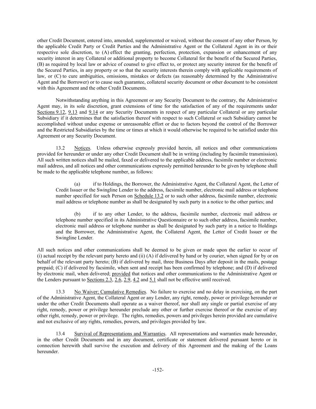 other Credit Document, entered into, amended, supplemented or waived, without the consent of any other Person, by the applicable Credit Party or Credit Parties and the Administrative Agent or the Collateral Agent in its or their respective sole discretion, to (A) effect the granting, perfection, protection, expansion or enhancement of any security interest in any Collateral or additional property to become Collateral for the benefit of the Secured Parties, (B) as required by local law or advice of counsel to give effect to, or protect any security interest for the benefit of the Secured Parties, in any property or so that the security interests therein comply with applicable requirements of law, or (C) to cure ambiguities, omissions, mistakes or defects (as reasonably determined by the Administrative Agent and the Borrower) or to cause such guarantee, collateral security document or other document to be consistent with this Agreement and the other Credit Documents. Notwithstanding anything in this Agreement or any Security Document to the contrary, the Administrative Agent may, in its sole discretion, grant extensions of time for the satisfaction of any of the requirements under Sections 9.12, 9.13 and 9.14 or any Security Documents in respect of any particular Collateral or any particular Subsidiary if it determines that the satisfaction thereof with respect to such Collateral or such Subsidiary cannot be accomplished without undue expense or unreasonable effort or due to factors beyond the control of the Borrower and the Restricted Subsidiaries by the time or times at which it would otherwise be required to be satisfied under this Agreement or any Security Document. 13.2 Notices. Unless otherwise expressly provided herein, all notices and other communications provided for hereunder or under any other Credit Document shall be in writing (including by facsimile transmission). All such written notices shall be mailed, faxed or delivered to the applicable address, facsimile number or electronic mail address, and all notices and other communications expressly permitted hereunder to be given by telephone shall be made to the applicable telephone number, as follows: (a) if to Holdings, the Borrower, the Administrative Agent, the Collateral Agent, the Letter of Credit Issuer or the Swingline Lender to the address, facsimile number, electronic mail address or telephone number specified for such Person on Schedule 13.2 or to such other address, facsimile number, electronic mail address or telephone number as shall be designated by such party in a notice to the other parties; and (b) if to any other Lender, to the address, facsimile number, electronic mail address or telephone number specified in its Administrative Questionnaire or to such other address, facsimile number, electronic mail address or telephone number as shall be designated by such party in a notice to Holdings and the Borrower, the Administrative Agent, the Collateral Agent, the Letter of Credit Issuer or the Swingline Lender. All such notices and other communications shall be deemed to be given or made upon the earlier to occur of (i) actual receipt by the relevant party hereto and (ii) (A) if delivered by hand or by courier, when signed for by or on behalf of the relevant party hereto; (B) if delivered by mail, three Business Days after deposit in the mails, postage prepaid; (C) if delivered by facsimile, when sent and receipt has been confirmed by telephone; and (D) if delivered by electronic mail, when delivered; provided that notices and other communications to the Administrative Agent or the Lenders pursuant to Sections 2.3, 2.6, 2.9, 4.2 and 5.1 shall not be effective until received. 13.3 No Waiver; Cumulative Remedies. No failure to exercise and no delay in exercising, on the part of the Administrative Agent, the Collateral Agent or any Lender, any right, remedy, power or privilege hereunder or under the other Credit Documents shall operate as a waiver thereof, nor shall any single or partial exercise of any right, remedy, power or privilege hereunder preclude any other or further exercise thereof or the exercise of any other right, remedy, power or privilege. The rights, remedies, powers and privileges herein provided are cumulative and not exclusive of any rights, remedies, powers, and privileges provided by law. 13.4 Survival of Representations and Warranties. All representations and warranties made hereunder, in the other Credit Documents and in any document, certificate or statement delivered pursuant hereto or in connection herewith shall survive the execution and delivery of this Agreement and the making of the Loans hereunder. -152-