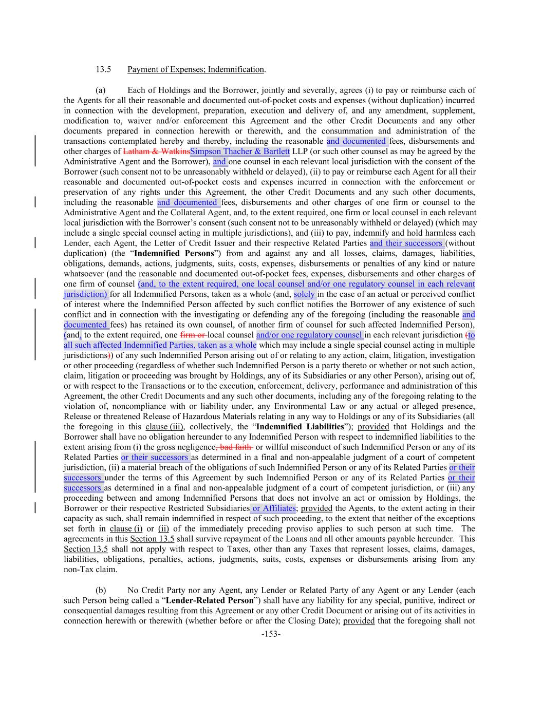 13.5 Payment of Expenses; Indemnification. (a) Each of Holdings and the Borrower, jointly and severally, agrees (i) to pay or reimburse each of the Agents for all their reasonable and documented out-of-pocket costs and expenses (without duplication) incurred in connection with the development, preparation, execution and delivery of, and any amendment, supplement, modification to, waiver and/or enforcement this Agreement and the other Credit Documents and any other documents prepared in connection herewith or therewith, and the consummation and administration of the transactions contemplated hereby and thereby, including the reasonable and documented fees, disbursements and other charges of Latham & WatkinsSimpson Thacher & Bartlett LLP (or such other counsel as may be agreed by the Administrative Agent and the Borrower), and one counsel in each relevant local jurisdiction with the consent of the Borrower (such consent not to be unreasonably withheld or delayed), (ii) to pay or reimburse each Agent for all their reasonable and documented out-of-pocket costs and expenses incurred in connection with the enforcement or preservation of any rights under this Agreement, the other Credit Documents and any such other documents, including the reasonable and documented fees, disbursements and other charges of one firm or counsel to the Administrative Agent and the Collateral Agent, and, to the extent required, one firm or local counsel in each relevant local jurisdiction with the Borrower’s consent (such consent not to be unreasonably withheld or delayed) (which may include a single special counsel acting in multiple jurisdictions), and (iii) to pay, indemnify and hold harmless each Lender, each Agent, the Letter of Credit Issuer and their respective Related Parties and their successors (without duplication) (the “Indemnified Persons”) from and against any and all losses, claims, damages, liabilities, obligations, demands, actions, judgments, suits, costs, expenses, disbursements or penalties of any kind or nature whatsoever (and the reasonable and documented out-of-pocket fees, expenses, disbursements and other charges of one firm of counsel (and, to the extent required, one local counsel and/or one regulatory counsel in each relevant jurisdiction) for all Indemnified Persons, taken as a whole (and, solely in the case of an actual or perceived conflict of interest where the Indemnified Person affected by such conflict notifies the Borrower of any existence of such conflict and in connection with the investigating or defending any of the foregoing (including the reasonable and documented fees) has retained its own counsel, of another firm of counsel for such affected Indemnified Person), (and, to the extent required, one firm or local counsel and/or one regulatory counsel in each relevant jurisdiction (to all such affected Indemnified Parties, taken as a whole which may include a single special counsel acting in multiple jurisdictions)) of any such Indemnified Person arising out of or relating to any action, claim, litigation, investigation or other proceeding (regardless of whether such Indemnified Person is a party thereto or whether or not such action, claim, litigation or proceeding was brought by Holdings, any of its Subsidiaries or any other Person), arising out of, or with respect to the Transactions or to the execution, enforcement, delivery, performance and administration of this Agreement, the other Credit Documents and any such other documents, including any of the foregoing relating to the violation of, noncompliance with or liability under, any Environmental Law or any actual or alleged presence, Release or threatened Release of Hazardous Materials relating in any way to Holdings or any of its Subsidiaries (all the foregoing in this clause (iii), collectively, the “Indemnified Liabilities”); provided that Holdings and the Borrower shall have no obligation hereunder to any Indemnified Person with respect to indemnified liabilities to the extent arising from (i) the gross negligence, bad faith or willful misconduct of such Indemnified Person or any of its Related Parties or their successors as determined in a final and non-appealable judgment of a court of competent jurisdiction, (ii) a material breach of the obligations of such Indemnified Person or any of its Related Parties or their successors under the terms of this Agreement by such Indemnified Person or any of its Related Parties or their successors as determined in a final and non-appealable judgment of a court of competent jurisdiction, or (iii) any proceeding between and among Indemnified Persons that does not involve an act or omission by Holdings, the Borrower or their respective Restricted Subsidiaries or Affiliates; provided the Agents, to the extent acting in their capacity as such, shall remain indemnified in respect of such proceeding, to the extent that neither of the exceptions set forth in clause (i) or (ii) of the immediately preceding proviso applies to such person at such time. The agreements in this Section 13.5 shall survive repayment of the Loans and all other amounts payable hereunder. This Section 13.5 shall not apply with respect to Taxes, other than any Taxes that represent losses, claims, damages, liabilities, obligations, penalties, actions, judgments, suits, costs, expenses or disbursements arising from any non-Tax claim. (b) No Credit Party nor any Agent, any Lender or Related Party of any Agent or any Lender (each such Person being called a “Lender-Related Person”) shall have any liability for any special, punitive, indirect or consequential damages resulting from this Agreement or any other Credit Document or arising out of its activities in connection herewith or therewith (whether before or after the Closing Date); provided that the foregoing shall not -153-
