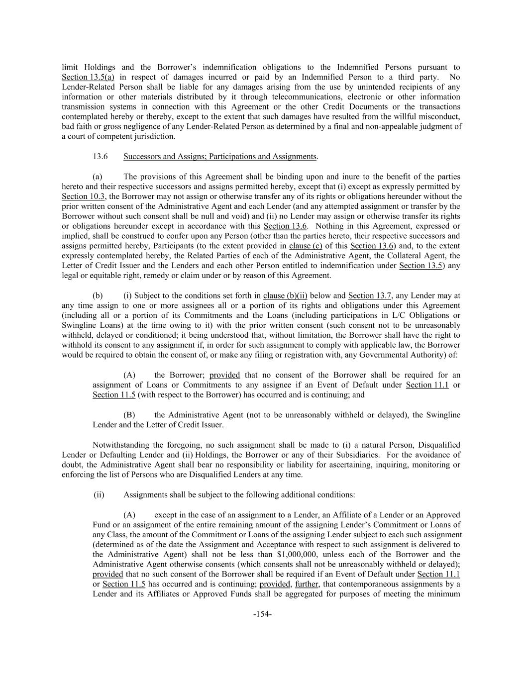 limit Holdings and the Borrower’s indemnification obligations to the Indemnified Persons pursuant to Section 13.5(a) in respect of damages incurred or paid by an Indemnified Person to a third party. No Lender-Related Person shall be liable for any damages arising from the use by unintended recipients of any information or other materials distributed by it through telecommunications, electronic or other information transmission systems in connection with this Agreement or the other Credit Documents or the transactions contemplated hereby or thereby, except to the extent that such damages have resulted from the willful misconduct, bad faith or gross negligence of any Lender-Related Person as determined by a final and non-appealable judgment of a court of competent jurisdiction. 13.6 Successors and Assigns; Participations and Assignments. (a) The provisions of this Agreement shall be binding upon and inure to the benefit of the parties hereto and their respective successors and assigns permitted hereby, except that (i) except as expressly permitted by Section 10.3, the Borrower may not assign or otherwise transfer any of its rights or obligations hereunder without the prior written consent of the Administrative Agent and each Lender (and any attempted assignment or transfer by the Borrower without such consent shall be null and void) and (ii) no Lender may assign or otherwise transfer its rights or obligations hereunder except in accordance with this Section 13.6. Nothing in this Agreement, expressed or implied, shall be construed to confer upon any Person (other than the parties hereto, their respective successors and assigns permitted hereby, Participants (to the extent provided in clause (c) of this Section 13.6) and, to the extent expressly contemplated hereby, the Related Parties of each of the Administrative Agent, the Collateral Agent, the Letter of Credit Issuer and the Lenders and each other Person entitled to indemnification under Section 13.5) any legal or equitable right, remedy or claim under or by reason of this Agreement. (b) (i) Subject to the conditions set forth in clause (b)(ii) below and Section 13.7, any Lender may at any time assign to one or more assignees all or a portion of its rights and obligations under this Agreement (including all or a portion of its Commitments and the Loans (including participations in L/C Obligations or Swingline Loans) at the time owing to it) with the prior written consent (such consent not to be unreasonably withheld, delayed or conditioned; it being understood that, without limitation, the Borrower shall have the right to withhold its consent to any assignment if, in order for such assignment to comply with applicable law, the Borrower would be required to obtain the consent of, or make any filing or registration with, any Governmental Authority) of: (A) the Borrower; provided that no consent of the Borrower shall be required for an assignment of Loans or Commitments to any assignee if an Event of Default under Section 11.1 or Section 11.5 (with respect to the Borrower) has occurred and is continuing; and (B) the Administrative Agent (not to be unreasonably withheld or delayed), the Swingline Lender and the Letter of Credit Issuer. Notwithstanding the foregoing, no such assignment shall be made to (i) a natural Person, Disqualified Lender or Defaulting Lender and (ii) Holdings, the Borrower or any of their Subsidiaries. For the avoidance of doubt, the Administrative Agent shall bear no responsibility or liability for ascertaining, inquiring, monitoring or enforcing the list of Persons who are Disqualified Lenders at any time. (ii) Assignments shall be subject to the following additional conditions: (A) except in the case of an assignment to a Lender, an Affiliate of a Lender or an Approved Fund or an assignment of the entire remaining amount of the assigning Lender’s Commitment or Loans of any Class, the amount of the Commitment or Loans of the assigning Lender subject to each such assignment (determined as of the date the Assignment and Acceptance with respect to such assignment is delivered to the Administrative Agent) shall not be less than $1,000,000, unless each of the Borrower and the Administrative Agent otherwise consents (which consents shall not be unreasonably withheld or delayed); provided that no such consent of the Borrower shall be required if an Event of Default under Section 11.1 or Section 11.5 has occurred and is continuing; provided, further, that contemporaneous assignments by a Lender and its Affiliates or Approved Funds shall be aggregated for purposes of meeting the minimum -154-