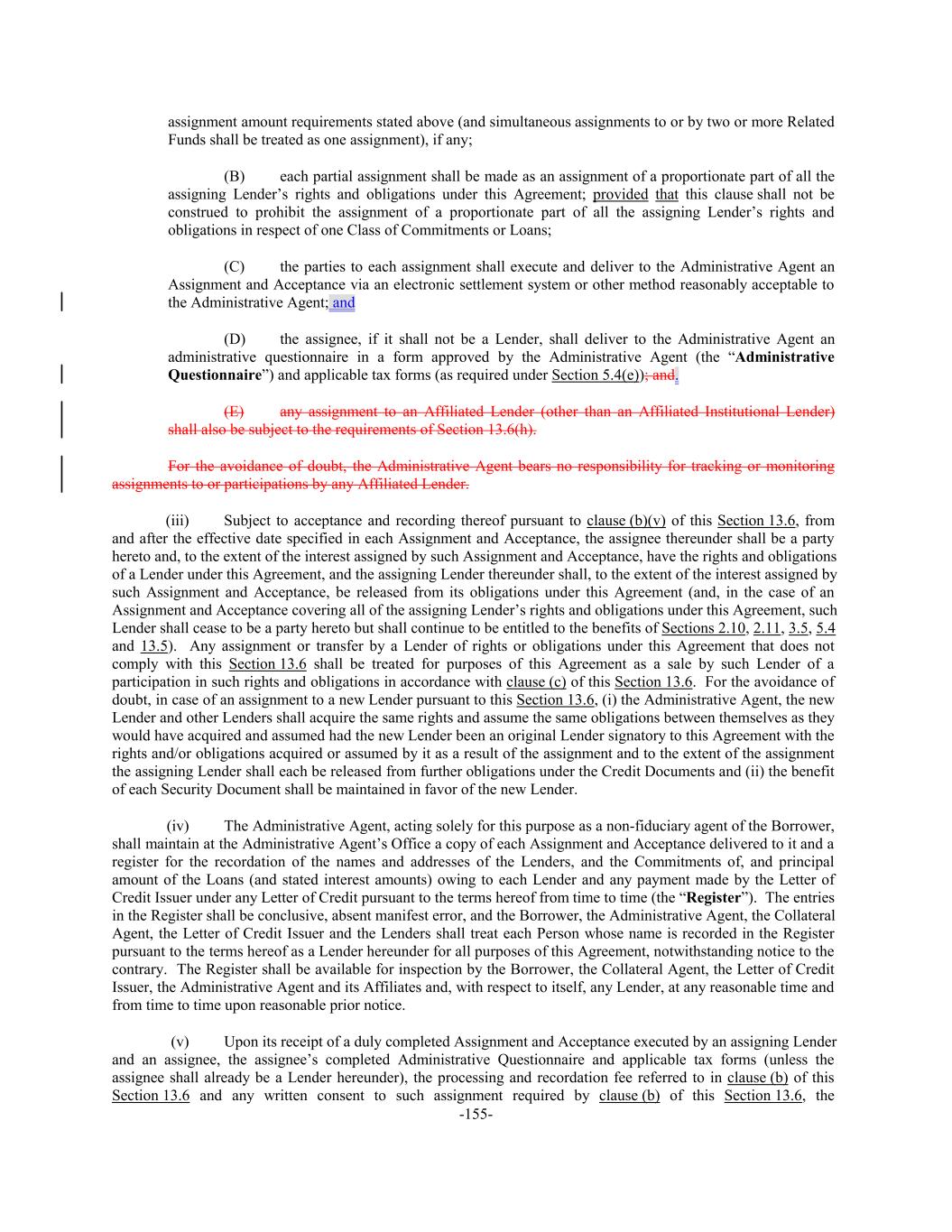 assignment amount requirements stated above (and simultaneous assignments to or by two or more Related Funds shall be treated as one assignment), if any; (B) each partial assignment shall be made as an assignment of a proportionate part of all the assigning Lender’s rights and obligations under this Agreement; provided that this clause shall not be construed to prohibit the assignment of a proportionate part of all the assigning Lender’s rights and obligations in respect of one Class of Commitments or Loans; (C) the parties to each assignment shall execute and deliver to the Administrative Agent an Assignment and Acceptance via an electronic settlement system or other method reasonably acceptable to the Administrative Agent; and (D) the assignee, if it shall not be a Lender, shall deliver to the Administrative Agent an administrative questionnaire in a form approved by the Administrative Agent (the “Administrative Questionnaire”) and applicable tax forms (as required under Section 5.4(e)); and. (E) any assignment to an Affiliated Lender (other than an Affiliated Institutional Lender) shall also be subject to the requirements of Section 13.6(h). For the avoidance of doubt, the Administrative Agent bears no responsibility for tracking or monitoring assignments to or participations by any Affiliated Lender. (iii) Subject to acceptance and recording thereof pursuant to clause (b)(v) of this Section 13.6, from and after the effective date specified in each Assignment and Acceptance, the assignee thereunder shall be a party hereto and, to the extent of the interest assigned by such Assignment and Acceptance, have the rights and obligations of a Lender under this Agreement, and the assigning Lender thereunder shall, to the extent of the interest assigned by such Assignment and Acceptance, be released from its obligations under this Agreement (and, in the case of an Assignment and Acceptance covering all of the assigning Lender’s rights and obligations under this Agreement, such Lender shall cease to be a party hereto but shall continue to be entitled to the benefits of Sections 2.10, 2.11, 3.5, 5.4 and 13.5). Any assignment or transfer by a Lender of rights or obligations under this Agreement that does not comply with this Section 13.6 shall be treated for purposes of this Agreement as a sale by such Lender of a participation in such rights and obligations in accordance with clause (c) of this Section 13.6. For the avoidance of doubt, in case of an assignment to a new Lender pursuant to this Section 13.6, (i) the Administrative Agent, the new Lender and other Lenders shall acquire the same rights and assume the same obligations between themselves as they would have acquired and assumed had the new Lender been an original Lender signatory to this Agreement with the rights and/or obligations acquired or assumed by it as a result of the assignment and to the extent of the assignment the assigning Lender shall each be released from further obligations under the Credit Documents and (ii) the benefit of each Security Document shall be maintained in favor of the new Lender. (iv) The Administrative Agent, acting solely for this purpose as a non-fiduciary agent of the Borrower, shall maintain at the Administrative Agent’s Office a copy of each Assignment and Acceptance delivered to it and a register for the recordation of the names and addresses of the Lenders, and the Commitments of, and principal amount of the Loans (and stated interest amounts) owing to each Lender and any payment made by the Letter of Credit Issuer under any Letter of Credit pursuant to the terms hereof from time to time (the “Register”). The entries in the Register shall be conclusive, absent manifest error, and the Borrower, the Administrative Agent, the Collateral Agent, the Letter of Credit Issuer and the Lenders shall treat each Person whose name is recorded in the Register pursuant to the terms hereof as a Lender hereunder for all purposes of this Agreement, notwithstanding notice to the contrary. The Register shall be available for inspection by the Borrower, the Collateral Agent, the Letter of Credit Issuer, the Administrative Agent and its Affiliates and, with respect to itself, any Lender, at any reasonable time and from time to time upon reasonable prior notice. (v) Upon its receipt of a duly completed Assignment and Acceptance executed by an assigning Lender and an assignee, the assignee’s completed Administrative Questionnaire and applicable tax forms (unless the assignee shall already be a Lender hereunder), the processing and recordation fee referred to in clause (b) of this Section 13.6 and any written consent to such assignment required by clause (b) of this Section 13.6, the -155-