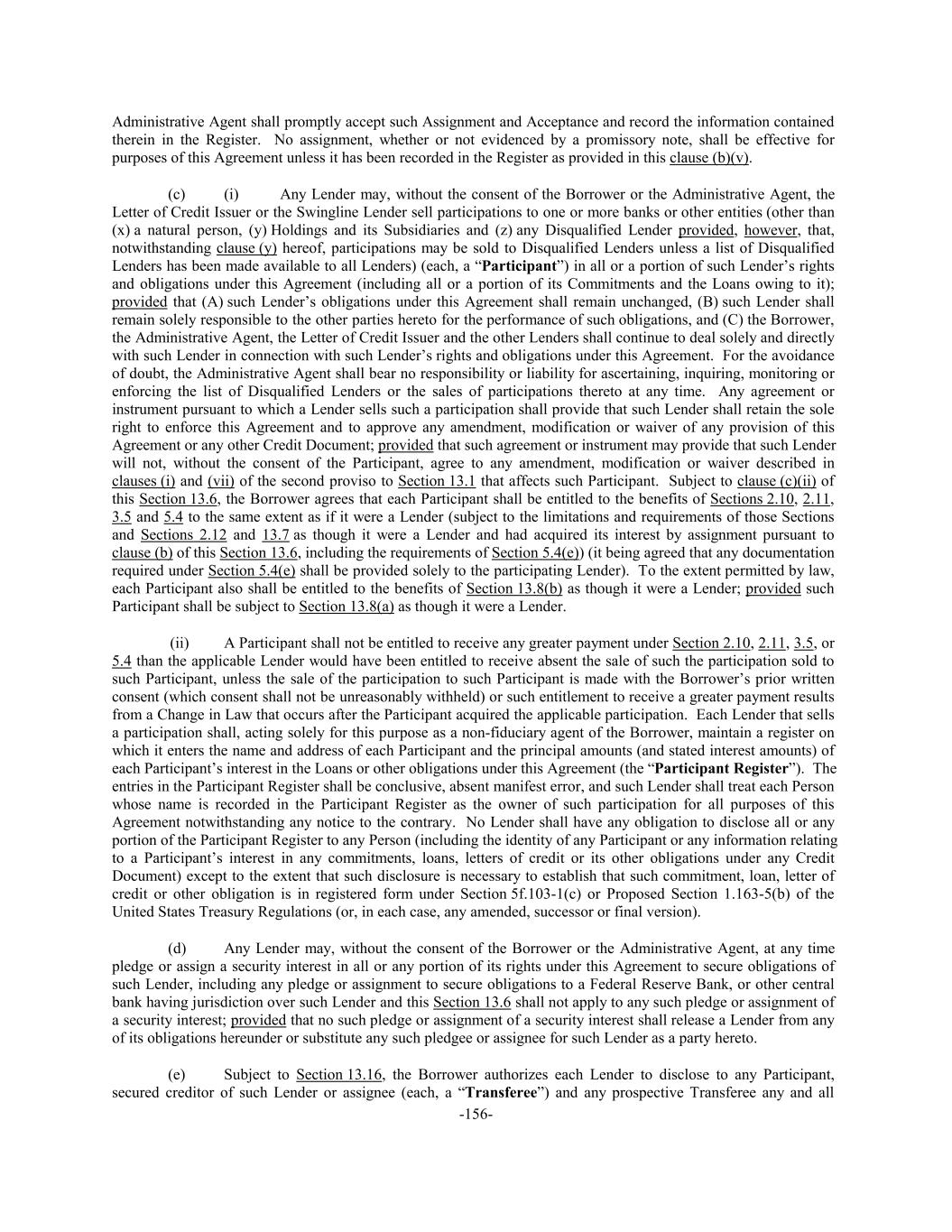Administrative Agent shall promptly accept such Assignment and Acceptance and record the information contained therein in the Register. No assignment, whether or not evidenced by a promissory note, shall be effective for purposes of this Agreement unless it has been recorded in the Register as provided in this clause (b)(v). (c) (i) Any Lender may, without the consent of the Borrower or the Administrative Agent, the Letter of Credit Issuer or the Swingline Lender sell participations to one or more banks or other entities (other than (x) a natural person, (y) Holdings and its Subsidiaries and (z) any Disqualified Lender provided, however, that, notwithstanding clause (y) hereof, participations may be sold to Disqualified Lenders unless a list of Disqualified Lenders has been made available to all Lenders) (each, a “Participant”) in all or a portion of such Lender’s rights and obligations under this Agreement (including all or a portion of its Commitments and the Loans owing to it); provided that (A) such Lender’s obligations under this Agreement shall remain unchanged, (B) such Lender shall remain solely responsible to the other parties hereto for the performance of such obligations, and (C) the Borrower, the Administrative Agent, the Letter of Credit Issuer and the other Lenders shall continue to deal solely and directly with such Lender in connection with such Lender’s rights and obligations under this Agreement. For the avoidance of doubt, the Administrative Agent shall bear no responsibility or liability for ascertaining, inquiring, monitoring or enforcing the list of Disqualified Lenders or the sales of participations thereto at any time. Any agreement or instrument pursuant to which a Lender sells such a participation shall provide that such Lender shall retain the sole right to enforce this Agreement and to approve any amendment, modification or waiver of any provision of this Agreement or any other Credit Document; provided that such agreement or instrument may provide that such Lender will not, without the consent of the Participant, agree to any amendment, modification or waiver described in clauses (i) and (vii) of the second proviso to Section 13.1 that affects such Participant. Subject to clause (c)(ii) of this Section 13.6, the Borrower agrees that each Participant shall be entitled to the benefits of Sections 2.10, 2.11, 3.5 and 5.4 to the same extent as if it were a Lender (subject to the limitations and requirements of those Sections and Sections 2.12 and 13.7 as though it were a Lender and had acquired its interest by assignment pursuant to clause (b) of this Section 13.6, including the requirements of Section 5.4(e)) (it being agreed that any documentation required under Section 5.4(e) shall be provided solely to the participating Lender). To the extent permitted by law, each Participant also shall be entitled to the benefits of Section 13.8(b) as though it were a Lender; provided such Participant shall be subject to Section 13.8(a) as though it were a Lender. (ii) A Participant shall not be entitled to receive any greater payment under Section 2.10, 2.11, 3.5, or 5.4 than the applicable Lender would have been entitled to receive absent the sale of such the participation sold to such Participant, unless the sale of the participation to such Participant is made with the Borrower’s prior written consent (which consent shall not be unreasonably withheld) or such entitlement to receive a greater payment results from a Change in Law that occurs after the Participant acquired the applicable participation. Each Lender that sells a participation shall, acting solely for this purpose as a non-fiduciary agent of the Borrower, maintain a register on which it enters the name and address of each Participant and the principal amounts (and stated interest amounts) of each Participant’s interest in the Loans or other obligations under this Agreement (the “Participant Register”). The entries in the Participant Register shall be conclusive, absent manifest error, and such Lender shall treat each Person whose name is recorded in the Participant Register as the owner of such participation for all purposes of this Agreement notwithstanding any notice to the contrary. No Lender shall have any obligation to disclose all or any portion of the Participant Register to any Person (including the identity of any Participant or any information relating to a Participant’s interest in any commitments, loans, letters of credit or its other obligations under any Credit Document) except to the extent that such disclosure is necessary to establish that such commitment, loan, letter of credit or other obligation is in registered form under Section 5f.103-1(c) or Proposed Section 1.163-5(b) of the United States Treasury Regulations (or, in each case, any amended, successor or final version). (d) Any Lender may, without the consent of the Borrower or the Administrative Agent, at any time pledge or assign a security interest in all or any portion of its rights under this Agreement to secure obligations of such Lender, including any pledge or assignment to secure obligations to a Federal Reserve Bank, or other central bank having jurisdiction over such Lender and this Section 13.6 shall not apply to any such pledge or assignment of a security interest; provided that no such pledge or assignment of a security interest shall release a Lender from any of its obligations hereunder or substitute any such pledgee or assignee for such Lender as a party hereto. (e) Subject to Section 13.16, the Borrower authorizes each Lender to disclose to any Participant, secured creditor of such Lender or assignee (each, a “Transferee”) and any prospective Transferee any and all -156-