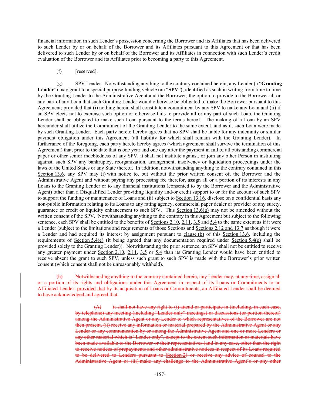 financial information in such Lender’s possession concerning the Borrower and its Affiliates that has been delivered to such Lender by or on behalf of the Borrower and its Affiliates pursuant to this Agreement or that has been delivered to such Lender by or on behalf of the Borrower and its Affiliates in connection with such Lender’s credit evaluation of the Borrower and its Affiliates prior to becoming a party to this Agreement. (f) [reserved]. (g) SPV Lender. Notwithstanding anything to the contrary contained herein, any Lender (a “Granting Lender”) may grant to a special purpose funding vehicle (an “SPV”), identified as such in writing from time to time by the Granting Lender to the Administrative Agent and the Borrower, the option to provide to the Borrower all or any part of any Loan that such Granting Lender would otherwise be obligated to make the Borrower pursuant to this Agreement; provided that (i) nothing herein shall constitute a commitment by any SPV to make any Loan and (ii) if an SPV elects not to exercise such option or otherwise fails to provide all or any part of such Loan, the Granting Lender shall be obligated to make such Loan pursuant to the terms hereof. The making of a Loan by an SPV hereunder shall utilize the Commitment of the Granting Lender to the same extent, and as if, such Loan were made by such Granting Lender. Each party hereto hereby agrees that no SPV shall be liable for any indemnity or similar payment obligation under this Agreement (all liability for which shall remain with the Granting Lender). In furtherance of the foregoing, each party hereto hereby agrees (which agreement shall survive the termination of this Agreement) that, prior to the date that is one year and one day after the payment in full of all outstanding commercial paper or other senior indebtedness of any SPV, it shall not institute against, or join any other Person in instituting against, such SPV any bankruptcy, reorganization, arrangement, insolvency or liquidation proceedings under the laws of the United States or any State thereof. In addition, notwithstanding anything to the contrary contained in this Section 13.6, any SPV may (i) with notice to, but without the prior written consent of, the Borrower and the Administrative Agent and without paying any processing fee therefor, assign all or a portion of its interests in any Loans to the Granting Lender or to any financial institutions (consented to by the Borrower and the Administrative Agent) other than a Disqualified Lender providing liquidity and/or credit support to or for the account of such SPV to support the funding or maintenance of Loans and (ii) subject to Section 13.16, disclose on a confidential basis any non-public information relating to its Loans to any rating agency, commercial paper dealer or provider of any surety, guarantee or credit or liquidity enhancement to such SPV. This Section 13.6(g) may not be amended without the written consent of the SPV. Notwithstanding anything to the contrary in this Agreement but subject to the following sentence, each SPV shall be entitled to the benefits of Sections 2.10, 2.11, 3.5 and 5.4 to the same extent as if it were a Lender (subject to the limitations and requirements of those Sections and Sections 2.12 and 13.7 as though it were a Lender and had acquired its interest by assignment pursuant to clause (b) of this Section 13.6, including the requirements of Section 5.4(e) (it being agreed that any documentation required under Section 5.4(e) shall be provided solely to the Granting Lender)). Notwithstanding the prior sentence, an SPV shall not be entitled to receive any greater payment under Section 2.10, 2.11, 3.5 or 5.4 than its Granting Lender would have been entitled to receive absent the grant to such SPV, unless such grant to such SPV is made with the Borrower’s prior written consent (which consent shall not be unreasonably withheld). (h) Notwithstanding anything to the contrary contained herein, any Lender may, at any time, assign all or a portion of its rights and obligations under this Agreement in respect of its Loans or Commitments to an Affiliated Lender; provided that by its acquisition of Loans or Commitments, an Affiliated Lender shall be deemed to have acknowledged and agreed that: (A) it shall not have any right to (i) attend or participate in (including, in each case, by telephone) any meeting (including “Lender only” meetings) or discussions (or portion thereof) among the Administrative Agent or any Lender to which representatives of the Borrower are not then present, (ii) receive any information or material prepared by the Administrative Agent or any Lender or any communication by or among the Administrative Agent and one or more Lenders or any other material which is “Lender only”, except to the extent such information or materials have been made available to the Borrower or their representatives (and in any case, other than the right to receive notices of prepayments and other administrative notices in respect of its Loans required to be delivered to Lenders pursuant to Section 2) or receive any advice of counsel to the Administrative Agent or (iii) make any challenge to the Administrative Agent’s or any other -157-