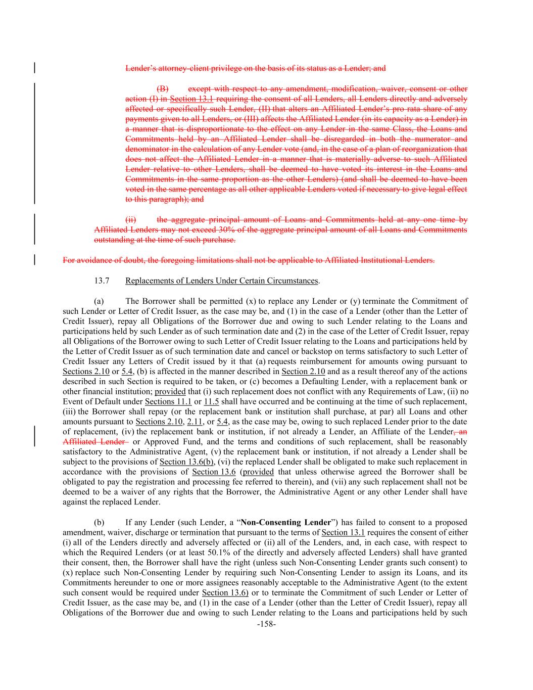 Lender’s attorney-client privilege on the basis of its status as a Lender; and (B) except with respect to any amendment, modification, waiver, consent or other action (I) in Section 13.1 requiring the consent of all Lenders, all Lenders directly and adversely affected or specifically such Lender, (II) that alters an Affiliated Lender’s pro rata share of any payments given to all Lenders, or (III) affects the Affiliated Lender (in its capacity as a Lender) in a manner that is disproportionate to the effect on any Lender in the same Class, the Loans and Commitments held by an Affiliated Lender shall be disregarded in both the numerator and denominator in the calculation of any Lender vote (and, in the case of a plan of reorganization that does not affect the Affiliated Lender in a manner that is materially adverse to such Affiliated Lender relative to other Lenders, shall be deemed to have voted its interest in the Loans and Commitments in the same proportion as the other Lenders) (and shall be deemed to have been voted in the same percentage as all other applicable Lenders voted if necessary to give legal effect to this paragraph); and (ii) the aggregate principal amount of Loans and Commitments held at any one time by Affiliated Lenders may not exceed 30% of the aggregate principal amount of all Loans and Commitments outstanding at the time of such purchase. For avoidance of doubt, the foregoing limitations shall not be applicable to Affiliated Institutional Lenders. 13.7 Replacements of Lenders Under Certain Circumstances. (a) The Borrower shall be permitted (x) to replace any Lender or (y) terminate the Commitment of such Lender or Letter of Credit Issuer, as the case may be, and (1) in the case of a Lender (other than the Letter of Credit Issuer), repay all Obligations of the Borrower due and owing to such Lender relating to the Loans and participations held by such Lender as of such termination date and (2) in the case of the Letter of Credit Issuer, repay all Obligations of the Borrower owing to such Letter of Credit Issuer relating to the Loans and participations held by the Letter of Credit Issuer as of such termination date and cancel or backstop on terms satisfactory to such Letter of Credit Issuer any Letters of Credit issued by it that (a) requests reimbursement for amounts owing pursuant to Sections 2.10 or 5.4, (b) is affected in the manner described in Section 2.10 and as a result thereof any of the actions described in such Section is required to be taken, or (c) becomes a Defaulting Lender, with a replacement bank or other financial institution; provided that (i) such replacement does not conflict with any Requirements of Law, (ii) no Event of Default under Sections 11.1 or 11.5 shall have occurred and be continuing at the time of such replacement, (iii) the Borrower shall repay (or the replacement bank or institution shall purchase, at par) all Loans and other amounts pursuant to Sections 2.10, 2.11, or 5.4, as the case may be, owing to such replaced Lender prior to the date of replacement, (iv) the replacement bank or institution, if not already a Lender, an Affiliate of the Lender, an Affiliated Lender or Approved Fund, and the terms and conditions of such replacement, shall be reasonably satisfactory to the Administrative Agent, (v) the replacement bank or institution, if not already a Lender shall be subject to the provisions of Section 13.6(b), (vi) the replaced Lender shall be obligated to make such replacement in accordance with the provisions of Section 13.6 (provided that unless otherwise agreed the Borrower shall be obligated to pay the registration and processing fee referred to therein), and (vii) any such replacement shall not be deemed to be a waiver of any rights that the Borrower, the Administrative Agent or any other Lender shall have against the replaced Lender. (b) If any Lender (such Lender, a “Non-Consenting Lender”) has failed to consent to a proposed amendment, waiver, discharge or termination that pursuant to the terms of Section 13.1 requires the consent of either (i) all of the Lenders directly and adversely affected or (ii) all of the Lenders, and, in each case, with respect to which the Required Lenders (or at least 50.1% of the directly and adversely affected Lenders) shall have granted their consent, then, the Borrower shall have the right (unless such Non-Consenting Lender grants such consent) to (x) replace such Non-Consenting Lender by requiring such Non-Consenting Lender to assign its Loans, and its Commitments hereunder to one or more assignees reasonably acceptable to the Administrative Agent (to the extent such consent would be required under Section 13.6) or to terminate the Commitment of such Lender or Letter of Credit Issuer, as the case may be, and (1) in the case of a Lender (other than the Letter of Credit Issuer), repay all Obligations of the Borrower due and owing to such Lender relating to the Loans and participations held by such -158-