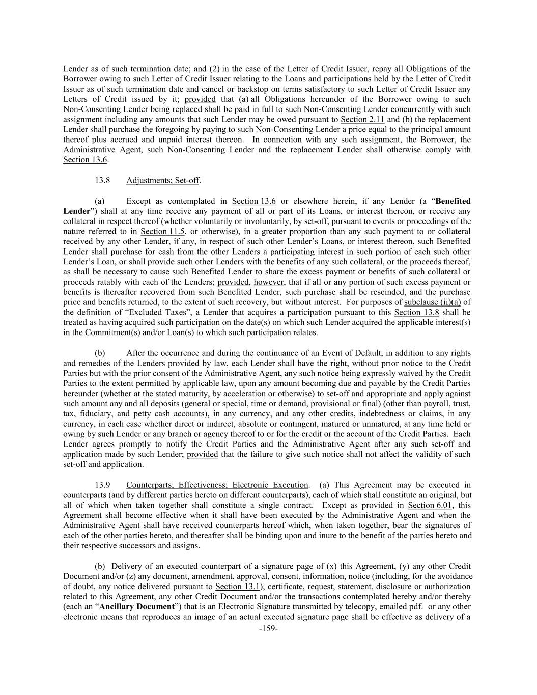Lender as of such termination date; and (2) in the case of the Letter of Credit Issuer, repay all Obligations of the Borrower owing to such Letter of Credit Issuer relating to the Loans and participations held by the Letter of Credit Issuer as of such termination date and cancel or backstop on terms satisfactory to such Letter of Credit Issuer any Letters of Credit issued by it; provided that (a) all Obligations hereunder of the Borrower owing to such Non-Consenting Lender being replaced shall be paid in full to such Non-Consenting Lender concurrently with such assignment including any amounts that such Lender may be owed pursuant to Section 2.11 and (b) the replacement Lender shall purchase the foregoing by paying to such Non-Consenting Lender a price equal to the principal amount thereof plus accrued and unpaid interest thereon. In connection with any such assignment, the Borrower, the Administrative Agent, such Non-Consenting Lender and the replacement Lender shall otherwise comply with Section 13.6. 13.8 Adjustments; Set-off. (a) Except as contemplated in Section 13.6 or elsewhere herein, if any Lender (a “Benefited Lender”) shall at any time receive any payment of all or part of its Loans, or interest thereon, or receive any collateral in respect thereof (whether voluntarily or involuntarily, by set-off, pursuant to events or proceedings of the nature referred to in Section 11.5, or otherwise), in a greater proportion than any such payment to or collateral received by any other Lender, if any, in respect of such other Lender’s Loans, or interest thereon, such Benefited Lender shall purchase for cash from the other Lenders a participating interest in such portion of each such other Lender’s Loan, or shall provide such other Lenders with the benefits of any such collateral, or the proceeds thereof, as shall be necessary to cause such Benefited Lender to share the excess payment or benefits of such collateral or proceeds ratably with each of the Lenders; provided, however, that if all or any portion of such excess payment or benefits is thereafter recovered from such Benefited Lender, such purchase shall be rescinded, and the purchase price and benefits returned, to the extent of such recovery, but without interest. For purposes of subclause (ii)(a) of the definition of “Excluded Taxes”, a Lender that acquires a participation pursuant to this Section 13.8 shall be treated as having acquired such participation on the date(s) on which such Lender acquired the applicable interest(s) in the Commitment(s) and/or Loan(s) to which such participation relates. (b) After the occurrence and during the continuance of an Event of Default, in addition to any rights and remedies of the Lenders provided by law, each Lender shall have the right, without prior notice to the Credit Parties but with the prior consent of the Administrative Agent, any such notice being expressly waived by the Credit Parties to the extent permitted by applicable law, upon any amount becoming due and payable by the Credit Parties hereunder (whether at the stated maturity, by acceleration or otherwise) to set-off and appropriate and apply against such amount any and all deposits (general or special, time or demand, provisional or final) (other than payroll, trust, tax, fiduciary, and petty cash accounts), in any currency, and any other credits, indebtedness or claims, in any currency, in each case whether direct or indirect, absolute or contingent, matured or unmatured, at any time held or owing by such Lender or any branch or agency thereof to or for the credit or the account of the Credit Parties. Each Lender agrees promptly to notify the Credit Parties and the Administrative Agent after any such set-off and application made by such Lender; provided that the failure to give such notice shall not affect the validity of such set-off and application. 13.9 Counterparts; Effectiveness; Electronic Execution. (a) This Agreement may be executed in counterparts (and by different parties hereto on different counterparts), each of which shall constitute an original, but all of which when taken together shall constitute a single contract. Except as provided in Section 6.01, this Agreement shall become effective when it shall have been executed by the Administrative Agent and when the Administrative Agent shall have received counterparts hereof which, when taken together, bear the signatures of each of the other parties hereto, and thereafter shall be binding upon and inure to the benefit of the parties hereto and their respective successors and assigns. (b) Delivery of an executed counterpart of a signature page of (x) this Agreement, (y) any other Credit Document and/or (z) any document, amendment, approval, consent, information, notice (including, for the avoidance of doubt, any notice delivered pursuant to Section 13.1), certificate, request, statement, disclosure or authorization related to this Agreement, any other Credit Document and/or the transactions contemplated hereby and/or thereby (each an “Ancillary Document”) that is an Electronic Signature transmitted by telecopy, emailed pdf. or any other electronic means that reproduces an image of an actual executed signature page shall be effective as delivery of a -159-