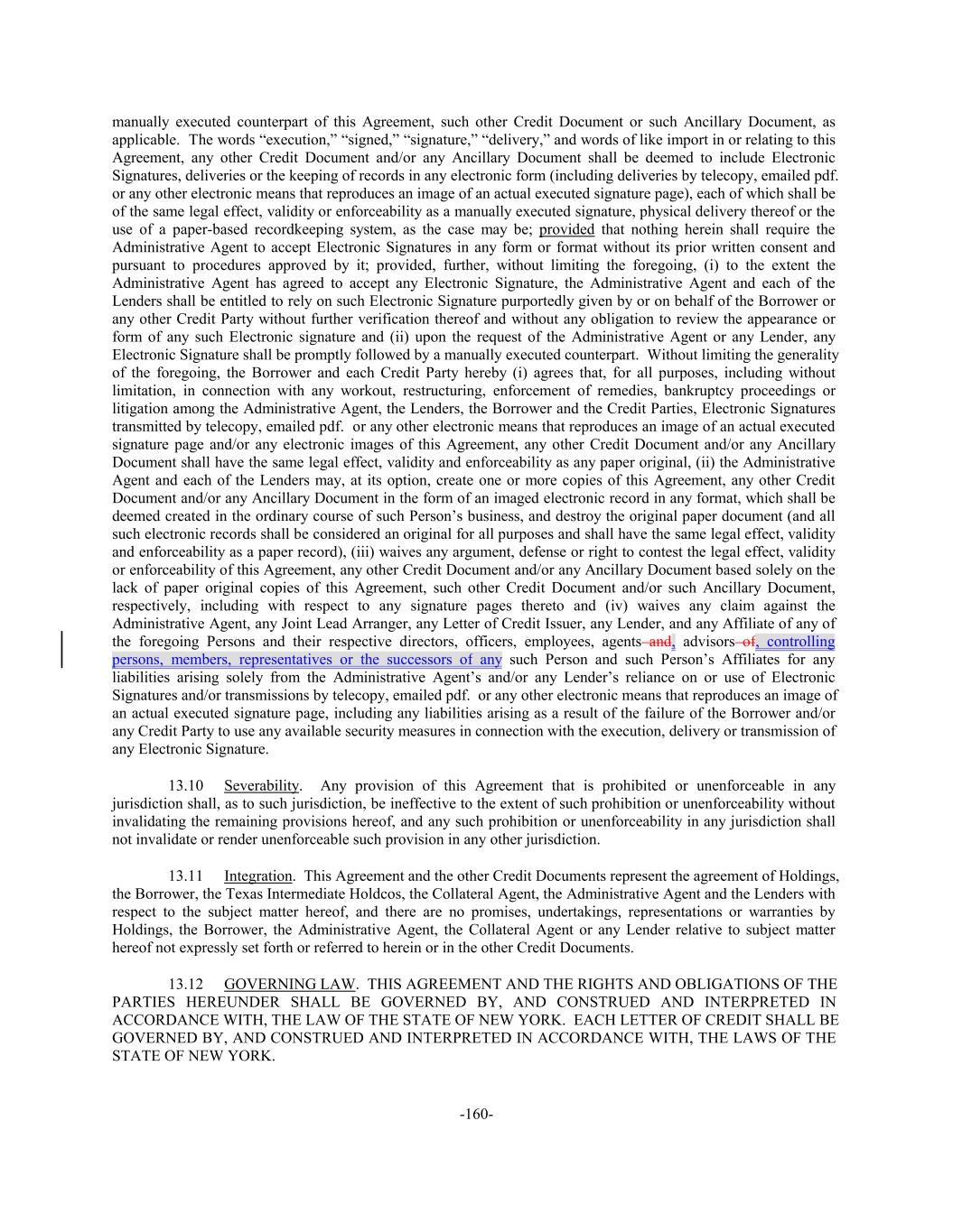 manually executed counterpart of this Agreement, such other Credit Document or such Ancillary Document, as applicable. The words “execution,” “signed,” “signature,” “delivery,” and words of like import in or relating to this Agreement, any other Credit Document and/or any Ancillary Document shall be deemed to include Electronic Signatures, deliveries or the keeping of records in any electronic form (including deliveries by telecopy, emailed pdf. or any other electronic means that reproduces an image of an actual executed signature page), each of which shall be of the same legal effect, validity or enforceability as a manually executed signature, physical delivery thereof or the use of a paper-based recordkeeping system, as the case may be; provided that nothing herein shall require the Administrative Agent to accept Electronic Signatures in any form or format without its prior written consent and pursuant to procedures approved by it; provided, further, without limiting the foregoing, (i) to the extent the Administrative Agent has agreed to accept any Electronic Signature, the Administrative Agent and each of the Lenders shall be entitled to rely on such Electronic Signature purportedly given by or on behalf of the Borrower or any other Credit Party without further verification thereof and without any obligation to review the appearance or form of any such Electronic signature and (ii) upon the request of the Administrative Agent or any Lender, any Electronic Signature shall be promptly followed by a manually executed counterpart. Without limiting the generality of the foregoing, the Borrower and each Credit Party hereby (i) agrees that, for all purposes, including without limitation, in connection with any workout, restructuring, enforcement of remedies, bankruptcy proceedings or litigation among the Administrative Agent, the Lenders, the Borrower and the Credit Parties, Electronic Signatures transmitted by telecopy, emailed pdf. or any other electronic means that reproduces an image of an actual executed signature page and/or any electronic images of this Agreement, any other Credit Document and/or any Ancillary Document shall have the same legal effect, validity and enforceability as any paper original, (ii) the Administrative Agent and each of the Lenders may, at its option, create one or more copies of this Agreement, any other Credit Document and/or any Ancillary Document in the form of an imaged electronic record in any format, which shall be deemed created in the ordinary course of such Person’s business, and destroy the original paper document (and all such electronic records shall be considered an original for all purposes and shall have the same legal effect, validity and enforceability as a paper record), (iii) waives any argument, defense or right to contest the legal effect, validity or enforceability of this Agreement, any other Credit Document and/or any Ancillary Document based solely on the lack of paper original copies of this Agreement, such other Credit Document and/or such Ancillary Document, respectively, including with respect to any signature pages thereto and (iv) waives any claim against the Administrative Agent, any Joint Lead Arranger, any Letter of Credit Issuer, any Lender, and any Affiliate of any of the foregoing Persons and their respective directors, officers, employees, agents and, advisors of, controlling persons, members, representatives or the successors of any such Person and such Person’s Affiliates for any liabilities arising solely from the Administrative Agent’s and/or any Lender’s reliance on or use of Electronic Signatures and/or transmissions by telecopy, emailed pdf. or any other electronic means that reproduces an image of an actual executed signature page, including any liabilities arising as a result of the failure of the Borrower and/or any Credit Party to use any available security measures in connection with the execution, delivery or transmission of any Electronic Signature. 13.10 Severability. Any provision of this Agreement that is prohibited or unenforceable in any jurisdiction shall, as to such jurisdiction, be ineffective to the extent of such prohibition or unenforceability without invalidating the remaining provisions hereof, and any such prohibition or unenforceability in any jurisdiction shall not invalidate or render unenforceable such provision in any other jurisdiction. 13.11 Integration. This Agreement and the other Credit Documents represent the agreement of Holdings, the Borrower, the Texas Intermediate Holdcos, the Collateral Agent, the Administrative Agent and the Lenders with respect to the subject matter hereof, and there are no promises, undertakings, representations or warranties by Holdings, the Borrower, the Administrative Agent, the Collateral Agent or any Lender relative to subject matter hereof not expressly set forth or referred to herein or in the other Credit Documents. 13.12 GOVERNING LAW. THIS AGREEMENT AND THE RIGHTS AND OBLIGATIONS OF THE PARTIES HEREUNDER SHALL BE GOVERNED BY, AND CONSTRUED AND INTERPRETED IN ACCORDANCE WITH, THE LAW OF THE STATE OF NEW YORK. EACH LETTER OF CREDIT SHALL BE GOVERNED BY, AND CONSTRUED AND INTERPRETED IN ACCORDANCE WITH, THE LAWS OF THE STATE OF NEW YORK. -160-