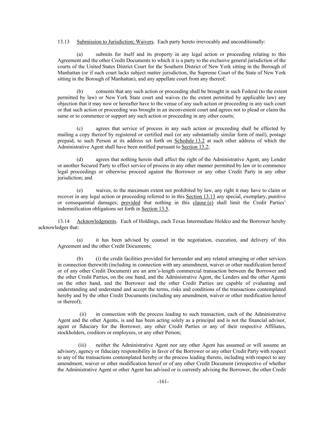 13.13 Submission to Jurisdiction; Waivers. Each party hereto irrevocably and unconditionally: (a) submits for itself and its property in any legal action or proceeding relating to this Agreement and the other Credit Documents to which it is a party to the exclusive general jurisdiction of the courts of the United States District Court for the Southern District of New York sitting in the Borough of Manhattan (or if such court lacks subject matter jurisdiction, the Supreme Court of the State of New York sitting in the Borough of Manhattan), and any appellate court from any thereof; (b) consents that any such action or proceeding shall be brought in such Federal (to the extent permitted by law) or New York State court and waives (to the extent permitted by applicable law) any objection that it may now or hereafter have to the venue of any such action or proceeding in any such court or that such action or proceeding was brought in an inconvenient court and agrees not to plead or claim the same or to commence or support any such action or proceeding in any other courts; (c) agrees that service of process in any such action or proceeding shall be effected by mailing a copy thereof by registered or certified mail (or any substantially similar form of mail), postage prepaid, to such Person at its address set forth on Schedule 13.2 at such other address of which the Administrative Agent shall have been notified pursuant to Section 13.2; (d) agrees that nothing herein shall affect the right of the Administrative Agent, any Lender or another Secured Party to effect service of process in any other manner permitted by law or to commence legal proceedings or otherwise proceed against the Borrower or any other Credit Party in any other jurisdiction; and (e) waives, to the maximum extent not prohibited by law, any right it may have to claim or recover in any legal action or proceeding referred to in this Section 13.13 any special, exemplary, punitive or consequential damages; provided that nothing in this clause (e) shall limit the Credit Parties’ indemnification obligations set forth in Section 13.5. 13.14 Acknowledgments. Each of Holdings, each Texas Intermediate Holdco and the Borrower hereby acknowledges that: (a) it has been advised by counsel in the negotiation, execution, and delivery of this Agreement and the other Credit Documents; (b) (i) the credit facilities provided for hereunder and any related arranging or other services in connection therewith (including in connection with any amendment, waiver or other modification hereof or of any other Credit Document) are an arm’s-length commercial transaction between the Borrower and the other Credit Parties, on the one hand, and the Administrative Agent, the Lenders and the other Agents on the other hand, and the Borrower and the other Credit Parties are capable of evaluating and understanding and understand and accept the terms, risks and conditions of the transactions contemplated hereby and by the other Credit Documents (including any amendment, waiver or other modification hereof or thereof); (ii) in connection with the process leading to such transaction, each of the Administrative Agent and the other Agents, is and has been acting solely as a principal and is not the financial advisor, agent or fiduciary for the Borrower, any other Credit Parties or any of their respective Affiliates, stockholders, creditors or employees, or any other Person; (iii) neither the Administrative Agent nor any other Agent has assumed or will assume an advisory, agency or fiduciary responsibility in favor of the Borrower or any other Credit Party with respect to any of the transactions contemplated hereby or the process leading thereto, including with respect to any amendment, waiver or other modification hereof or of any other Credit Document (irrespective of whether the Administrative Agent or other Agent has advised or is currently advising the Borrower, the other Credit -161-