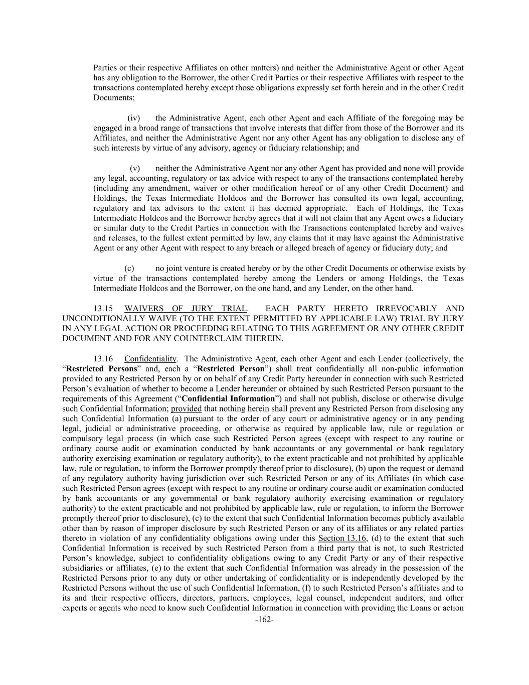 Parties or their respective Affiliates on other matters) and neither the Administrative Agent or other Agent has any obligation to the Borrower, the other Credit Parties or their respective Affiliates with respect to the transactions contemplated hereby except those obligations expressly set forth herein and in the other Credit Documents; (iv) the Administrative Agent, each other Agent and each Affiliate of the foregoing may be engaged in a broad range of transactions that involve interests that differ from those of the Borrower and its Affiliates, and neither the Administrative Agent nor any other Agent has any obligation to disclose any of such interests by virtue of any advisory, agency or fiduciary relationship; and (v) neither the Administrative Agent nor any other Agent has provided and none will provide any legal, accounting, regulatory or tax advice with respect to any of the transactions contemplated hereby (including any amendment, waiver or other modification hereof or of any other Credit Document) and Holdings, the Texas Intermediate Holdcos and the Borrower has consulted its own legal, accounting, regulatory and tax advisors to the extent it has deemed appropriate. Each of Holdings, the Texas Intermediate Holdcos and the Borrower hereby agrees that it will not claim that any Agent owes a fiduciary or similar duty to the Credit Parties in connection with the Transactions contemplated hereby and waives and releases, to the fullest extent permitted by law, any claims that it may have against the Administrative Agent or any other Agent with respect to any breach or alleged breach of agency or fiduciary duty; and (c) no joint venture is created hereby or by the other Credit Documents or otherwise exists by virtue of the transactions contemplated hereby among the Lenders or among Holdings, the Texas Intermediate Holdcos and the Borrower, on the one hand, and any Lender, on the other hand. 13.15 WAIVERS OF JURY TRIAL. EACH PARTY HERETO IRREVOCABLY AND UNCONDITIONALLY WAIVE (TO THE EXTENT PERMITTED BY APPLICABLE LAW) TRIAL BY JURY IN ANY LEGAL ACTION OR PROCEEDING RELATING TO THIS AGREEMENT OR ANY OTHER CREDIT DOCUMENT AND FOR ANY COUNTERCLAIM THEREIN. 13.16 Confidentiality. The Administrative Agent, each other Agent and each Lender (collectively, the “Restricted Persons” and, each a “Restricted Person”) shall treat confidentially all non-public information provided to any Restricted Person by or on behalf of any Credit Party hereunder in connection with such Restricted Person’s evaluation of whether to become a Lender hereunder or obtained by such Restricted Person pursuant to the requirements of this Agreement (“Confidential Information”) and shall not publish, disclose or otherwise divulge such Confidential Information; provided that nothing herein shall prevent any Restricted Person from disclosing any such Confidential Information (a) pursuant to the order of any court or administrative agency or in any pending legal, judicial or administrative proceeding, or otherwise as required by applicable law, rule or regulation or compulsory legal process (in which case such Restricted Person agrees (except with respect to any routine or ordinary course audit or examination conducted by bank accountants or any governmental or bank regulatory authority exercising examination or regulatory authority), to the extent practicable and not prohibited by applicable law, rule or regulation, to inform the Borrower promptly thereof prior to disclosure), (b) upon the request or demand of any regulatory authority having jurisdiction over such Restricted Person or any of its Affiliates (in which case such Restricted Person agrees (except with respect to any routine or ordinary course audit or examination conducted by bank accountants or any governmental or bank regulatory authority exercising examination or regulatory authority) to the extent practicable and not prohibited by applicable law, rule or regulation, to inform the Borrower promptly thereof prior to disclosure), (c) to the extent that such Confidential Information becomes publicly available other than by reason of improper disclosure by such Restricted Person or any of its affiliates or any related parties thereto in violation of any confidentiality obligations owing under this Section 13.16, (d) to the extent that such Confidential Information is received by such Restricted Person from a third party that is not, to such Restricted Person’s knowledge, subject to confidentiality obligations owing to any Credit Party or any of their respective subsidiaries or affiliates, (e) to the extent that such Confidential Information was already in the possession of the Restricted Persons prior to any duty or other undertaking of confidentiality or is independently developed by the Restricted Persons without the use of such Confidential Information, (f) to such Restricted Person’s affiliates and to its and their respective officers, directors, partners, employees, legal counsel, independent auditors, and other experts or agents who need to know such Confidential Information in connection with providing the Loans or action -162-
