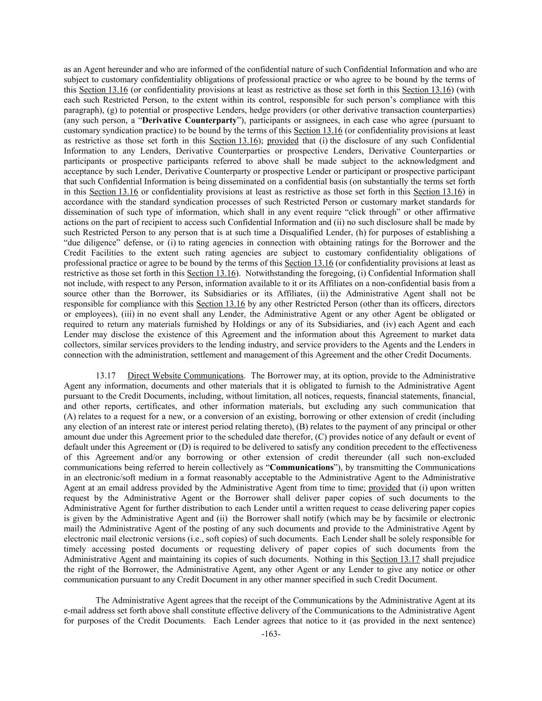 as an Agent hereunder and who are informed of the confidential nature of such Confidential Information and who are subject to customary confidentiality obligations of professional practice or who agree to be bound by the terms of this Section 13.16 (or confidentiality provisions at least as restrictive as those set forth in this Section 13.16) (with each such Restricted Person, to the extent within its control, responsible for such person’s compliance with this paragraph), (g) to potential or prospective Lenders, hedge providers (or other derivative transaction counterparties) (any such person, a “Derivative Counterparty”), participants or assignees, in each case who agree (pursuant to customary syndication practice) to be bound by the terms of this Section 13.16 (or confidentiality provisions at least as restrictive as those set forth in this Section 13.16); provided that (i) the disclosure of any such Confidential Information to any Lenders, Derivative Counterparties or prospective Lenders, Derivative Counterparties or participants or prospective participants referred to above shall be made subject to the acknowledgment and acceptance by such Lender, Derivative Counterparty or prospective Lender or participant or prospective participant that such Confidential Information is being disseminated on a confidential basis (on substantially the terms set forth in this Section 13.16 or confidentiality provisions at least as restrictive as those set forth in this Section 13.16) in accordance with the standard syndication processes of such Restricted Person or customary market standards for dissemination of such type of information, which shall in any event require “click through” or other affirmative actions on the part of recipient to access such Confidential Information and (ii) no such disclosure shall be made by such Restricted Person to any person that is at such time a Disqualified Lender, (h) for purposes of establishing a “due diligence” defense, or (i) to rating agencies in connection with obtaining ratings for the Borrower and the Credit Facilities to the extent such rating agencies are subject to customary confidentiality obligations of professional practice or agree to be bound by the terms of this Section 13.16 (or confidentiality provisions at least as restrictive as those set forth in this Section 13.16). Notwithstanding the foregoing, (i) Confidential Information shall not include, with respect to any Person, information available to it or its Affiliates on a non-confidential basis from a source other than the Borrower, its Subsidiaries or its Affiliates, (ii) the Administrative Agent shall not be responsible for compliance with this Section 13.16 by any other Restricted Person (other than its officers, directors or employees), (iii) in no event shall any Lender, the Administrative Agent or any other Agent be obligated or required to return any materials furnished by Holdings or any of its Subsidiaries, and (iv) each Agent and each Lender may disclose the existence of this Agreement and the information about this Agreement to market data collectors, similar services providers to the lending industry, and service providers to the Agents and the Lenders in connection with the administration, settlement and management of this Agreement and the other Credit Documents. 13.17 Direct Website Communications. The Borrower may, at its option, provide to the Administrative Agent any information, documents and other materials that it is obligated to furnish to the Administrative Agent pursuant to the Credit Documents, including, without limitation, all notices, requests, financial statements, financial, and other reports, certificates, and other information materials, but excluding any such communication that (A) relates to a request for a new, or a conversion of an existing, borrowing or other extension of credit (including any election of an interest rate or interest period relating thereto), (B) relates to the payment of any principal or other amount due under this Agreement prior to the scheduled date therefor, (C) provides notice of any default or event of default under this Agreement or (D) is required to be delivered to satisfy any condition precedent to the effectiveness of this Agreement and/or any borrowing or other extension of credit thereunder (all such non-excluded communications being referred to herein collectively as “Communications”), by transmitting the Communications in an electronic/soft medium in a format reasonably acceptable to the Administrative Agent to the Administrative Agent at an email address provided by the Administrative Agent from time to time; provided that (i) upon written request by the Administrative Agent or the Borrower shall deliver paper copies of such documents to the Administrative Agent for further distribution to each Lender until a written request to cease delivering paper copies is given by the Administrative Agent and (ii) the Borrower shall notify (which may be by facsimile or electronic mail) the Administrative Agent of the posting of any such documents and provide to the Administrative Agent by electronic mail electronic versions (i.e., soft copies) of such documents. Each Lender shall be solely responsible for timely accessing posted documents or requesting delivery of paper copies of such documents from the Administrative Agent and maintaining its copies of such documents. Nothing in this Section 13.17 shall prejudice the right of the Borrower, the Administrative Agent, any other Agent or any Lender to give any notice or other communication pursuant to any Credit Document in any other manner specified in such Credit Document. The Administrative Agent agrees that the receipt of the Communications by the Administrative Agent at its e-mail address set forth above shall constitute effective delivery of the Communications to the Administrative Agent for purposes of the Credit Documents. Each Lender agrees that notice to it (