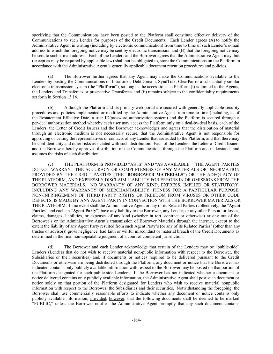specifying that the Communications have been posted to the Platform shall constitute effective delivery of the Communications to such Lender for purposes of the Credit Documents. Each Lender agrees (A) to notify the Administrative Agent in writing (including by electronic communication) from time to time of such Lender’s e-mail address to which the foregoing notice may be sent by electronic transmission and (B) that the foregoing notice may be sent to such e-mail address. Each of the Lenders and the Borrower agrees that the Administrative Agent may, but (except as may be required by applicable law) shall not be obligated to, store the Communications on the Platform in accordance with the Administrative Agent’s generally applicable document retention procedures and policies. (a) The Borrower further agrees that any Agent may make the Communications available to the Lenders by posting the Communications on IntraLinks, DebtDomain, SyndTrak, ClearPar or a substantially similar electronic transmission system (the “Platform”), so long as the access to such Platform (i) is limited to the Agents, the Lenders and Transferees or prospective Transferees and (ii) remains subject to the confidentiality requirements set forth in Section 13.16. (b) Although the Platform and its primary web portal are secured with generally-applicable security procedures and policies implemented or modified by the Administrative Agent from time to time (including, as of the Restatement Effective Date, a user ID/password authorization system) and the Platform is secured through a per-deal authorization method whereby each user may access the Platform only on a deal-by-deal basis, each of the Lenders, the Letter of Credit Issuers and the Borrower acknowledges and agrees that the distribution of material through an electronic medium is not necessarily secure, that the Administrative Agent is not responsible for approving or vetting the representatives or contacts of any Lender that are added to the Platform, and that there may be confidentiality and other risks associated with such distribution. Each of the Lenders, the Letter of Credit Issuers and the Borrower hereby approves distribution of the Communications through the Platform and understands and assumes the risks of such distribution. (c) THE PLATFORM IS PROVIDED “AS IS” AND “AS AVAILABLE.” THE AGENT PARTIES DO NOT WARRANT THE ACCURACY OR COMPLETENESS OF ANY MATERIALS OR INFORMATION PROVIDED BY THE CREDIT PARTIES (THE “BORROWER MATERIALS”) OR THE ADEQUACY OF THE PLATFORM, AND EXPRESSLY DISCLAIM LIABILITY FOR ERRORS IN OR OMISSIONS FROM THE BORROWER MATERIALS. NO WARRANTY OF ANY KIND, EXPRESS, IMPLIED OR STATUTORY, INCLUDING ANY WARRANTY OF MERCHANTABILITY, FITNESS FOR A PARTICULAR PURPOSE, NON-INFRINGEMENT OF THIRD PARTY RIGHTS OR FREEDOM FROM VIRUSES OR OTHER CODE DEFECTS, IS MADE BY ANY AGENT PARTY IN CONNECTION WITH THE BORROWER MATERIALS OR THE PLATFORM. In no event shall the Administrative Agent or any of its Related Parties (collectively, the “Agent Parties” and each an “Agent Party”) have any liability to the Borrower, any Lender, or any other Person for losses, claims, damages, liabilities, or expenses of any kind (whether in tort, contract or otherwise) arising out of the Borrower’s or the Administrative Agent’s transmission of Borrower Materials through the internet, except to the extent the liability of any Agent Party resulted from such Agent Party’s (or any of its Related Parties’ (other than any trustee or advisor)) gross negligence, bad faith or willful misconduct or material breach of the Credit Documents as determined in the final non-appealable judgment of a court of competent jurisdiction. (d) The Borrower and each Lender acknowledge that certain of the Lenders may be “public-side” Lenders (Lenders that do not wish to receive material non-public information with respect to the Borrower, the Subsidiaries or their securities) and, if documents or notices required to be delivered pursuant to the Credit Documents or otherwise are being distributed through the Platform, any document or notice that the Borrower has indicated contains only publicly available information with respect to the Borrower may be posted on that portion of the Platform designated for such public-side Lenders. If the Borrower has not indicated whether a document or notice delivered contains only publicly available information, the Administrative Agent shall post such document or notice solely on that portion of the Platform designated for Lenders who wish to receive material nonpublic information with respect to the Borrower, the Subsidiaries and their securities. Notwithstanding the foregoing, the Borrower shall use commercially reasonable efforts to indicate whether any document or notice contains only publicly available information; provided, however, that the following documents shall be deemed to be marked “PUBLIC,” unless the Borrower notifies the Administrative Agent promptly that any such document contains -164-
