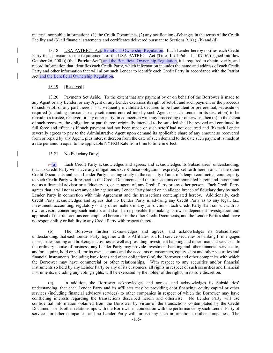 material nonpublic information: (1) the Credit Documents, (2) any notification of changes in the terms of the Credit Facility and (3) all financial statements and certificates delivered pursuant to Sections 9.1(a), (b) and (d). 13.18 USA PATRIOT Act; Beneficial Ownership Regulation. Each Lender hereby notifies each Credit Party that, pursuant to the requirements of the USA PATRIOT Act (Title III of Pub. L. 107-56 (signed into law October 26, 2001)) (the “Patriot Act”) and the Beneficial Ownership Regulation, it is required to obtain, verify, and record information that identifies each Credit Party, which information includes the name and address of each Credit Party and other information that will allow such Lender to identify each Credit Party in accordance with the Patriot Act and the Beneficial Ownership Regulation. 13.19 [Reserved]. 13.20 Payments Set Aside. To the extent that any payment by or on behalf of the Borrower is made to any Agent or any Lender, or any Agent or any Lender exercises its right of setoff, and such payment or the proceeds of such setoff or any part thereof is subsequently invalidated, declared to be fraudulent or preferential, set aside or required (including pursuant to any settlement entered into by such Agent or such Lender in its discretion) to be repaid to a trustee, receiver, or any other party, in connection with any proceeding or otherwise, then (a) to the extent of such recovery, the obligation or part thereof originally intended to be satisfied shall be revived and continued in full force and effect as if such payment had not been made or such setoff had not occurred and (b) each Lender severally agrees to pay to the Administrative Agent upon demand its applicable share of any amount so recovered from or repaid by any Agent, plus interest thereon from the date of such demand to the date such payment is made at a rate per annum equal to the applicable NYFRB Rate from time to time in effect. 13.21 No Fiduciary Duty. . (a) Each Credit Party acknowledges and agrees, and acknowledges its Subsidiaries’ understanding, that no Credit Party will have any obligations except those obligations expressly set forth herein and in the other Credit Documents and each Lender Party is acting solely in the capacity of an arm’s length contractual counterparty to such Credit Party with respect to the Credit Documents and the transactions contemplated herein and therein and not as a financial advisor or a fiduciary to, or an agent of, any Credit Party or any other person. Each Credit Party agrees that it will not assert any claim against any Lender Party based on an alleged breach of fiduciary duty by such Lender Party in connection with this Agreement and the transactions contemplated hereby. Additionally, each Credit Party acknowledges and agrees that no Lender Party is advising any Credit Party as to any legal, tax, investment, accounting, regulatory or any other matters in any jurisdiction. Each Credit Party shall consult with its own advisors concerning such matters and shall be responsible for making its own independent investigation and appraisal of the transactions contemplated herein or in the other Credit Documents, and the Lender Parties shall have no responsibility or liability to any Credit Party with respect thereto. (b) The Borrower further acknowledges and agrees, and acknowledges its Subsidiaries’ understanding, that each Lender Party, together with its Affiliates, is a full service securities or banking firm engaged in securities trading and brokerage activities as well as providing investment banking and other financial services. In the ordinary course of business, any Lender Party may provide investment banking and other financial services to, and/or acquire, hold or sell, for its own accounts and the accounts of customers, equity, debt and other securities and financial instruments (including bank loans and other obligations) of, the Borrower and other companies with which the Borrower may have commercial or other relationships. With respect to any securities and/or financial instruments so held by any Lender Party or any of its customers, all rights in respect of such securities and financial instruments, including any voting rights, will be exercised by the holder of the rights, in its sole discretion. (c) In addition, the Borrower acknowledges and agrees, and acknowledges its Subsidiaries’ understanding, that each Lender Party and its affiliates may be providing debt financing, equity capital or other services (including financial advisory services) to other companies in respect of which the Borrower may have conflicting interests regarding the transactions described herein and otherwise. No Lender Party will use confidential information obtained from the Borrower by virtue of the transactions contemplated by the Credit Documents or its other relationships with the Borrower in connection with the performance by such Lender Party of services for other companies, and no Lender Party will furnish any such information to other companies. The -165-