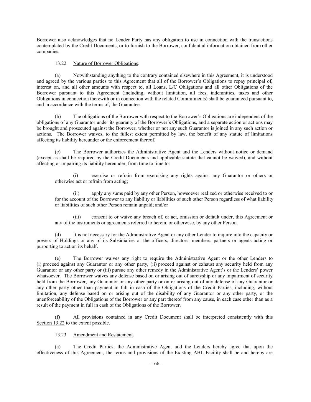 Borrower also acknowledges that no Lender Party has any obligation to use in connection with the transactions contemplated by the Credit Documents, or to furnish to the Borrower, confidential information obtained from other companies. 13.22 Nature of Borrower Obligations. (a) Notwithstanding anything to the contrary contained elsewhere in this Agreement, it is understood and agreed by the various parties to this Agreement that all of the Borrower’s Obligations to repay principal of, interest on, and all other amounts with respect to, all Loans, L/C Obligations and all other Obligations of the Borrower pursuant to this Agreement (including, without limitation, all fees, indemnities, taxes and other Obligations in connection therewith or in connection with the related Commitments) shall be guaranteed pursuant to, and in accordance with the terms of, the Guarantee. (b) The obligations of the Borrower with respect to the Borrower’s Obligations are independent of the obligations of any Guarantor under its guaranty of the Borrower’s Obligations, and a separate action or actions may be brought and prosecuted against the Borrower, whether or not any such Guarantor is joined in any such action or actions. The Borrower waives, to the fullest extent permitted by law, the benefit of any statute of limitations affecting its liability hereunder or the enforcement thereof. (c) The Borrower authorizes the Administrative Agent and the Lenders without notice or demand (except as shall be required by the Credit Documents and applicable statute that cannot be waived), and without affecting or impairing its liability hereunder, from time to time to: (i) exercise or refrain from exercising any rights against any Guarantor or others or otherwise act or refrain from acting; (ii) apply any sums paid by any other Person, howsoever realized or otherwise received to or for the account of the Borrower to any liability or liabilities of such other Person regardless of what liability or liabilities of such other Person remain unpaid; and/or (iii) consent to or waive any breach of, or act, omission or default under, this Agreement or any of the instruments or agreements referred to herein, or otherwise, by any other Person. (d) It is not necessary for the Administrative Agent or any other Lender to inquire into the capacity or powers of Holdings or any of its Subsidiaries or the officers, directors, members, partners or agents acting or purporting to act on its behalf. (e) The Borrower waives any right to require the Administrative Agent or the other Lenders to (i) proceed against any Guarantor or any other party, (ii) proceed against or exhaust any security held from any Guarantor or any other party or (iii) pursue any other remedy in the Administrative Agent’s or the Lenders’ power whatsoever. The Borrower waives any defense based on or arising out of suretyship or any impairment of security held from the Borrower, any Guarantor or any other party or on or arising out of any defense of any Guarantor or any other party other than payment in full in cash of the Obligations of the Credit Parties, including, without limitation, any defense based on or arising out of the disability of any Guarantor or any other party, or the unenforceability of the Obligations of the Borrower or any part thereof from any cause, in each case other than as a result of the payment in full in cash of the Obligations of the Borrower. (f) All provisions contained in any Credit Document shall be interpreted consistently with this Section 13.22 to the extent possible. 13.23 Amendment and Restatement. (a) The Credit Parties, the Administrative Agent and the Lenders hereby agree that upon the effectiveness of this Agreement, the terms and provisions of the Existing ABL Facility shall be and hereby are -166-