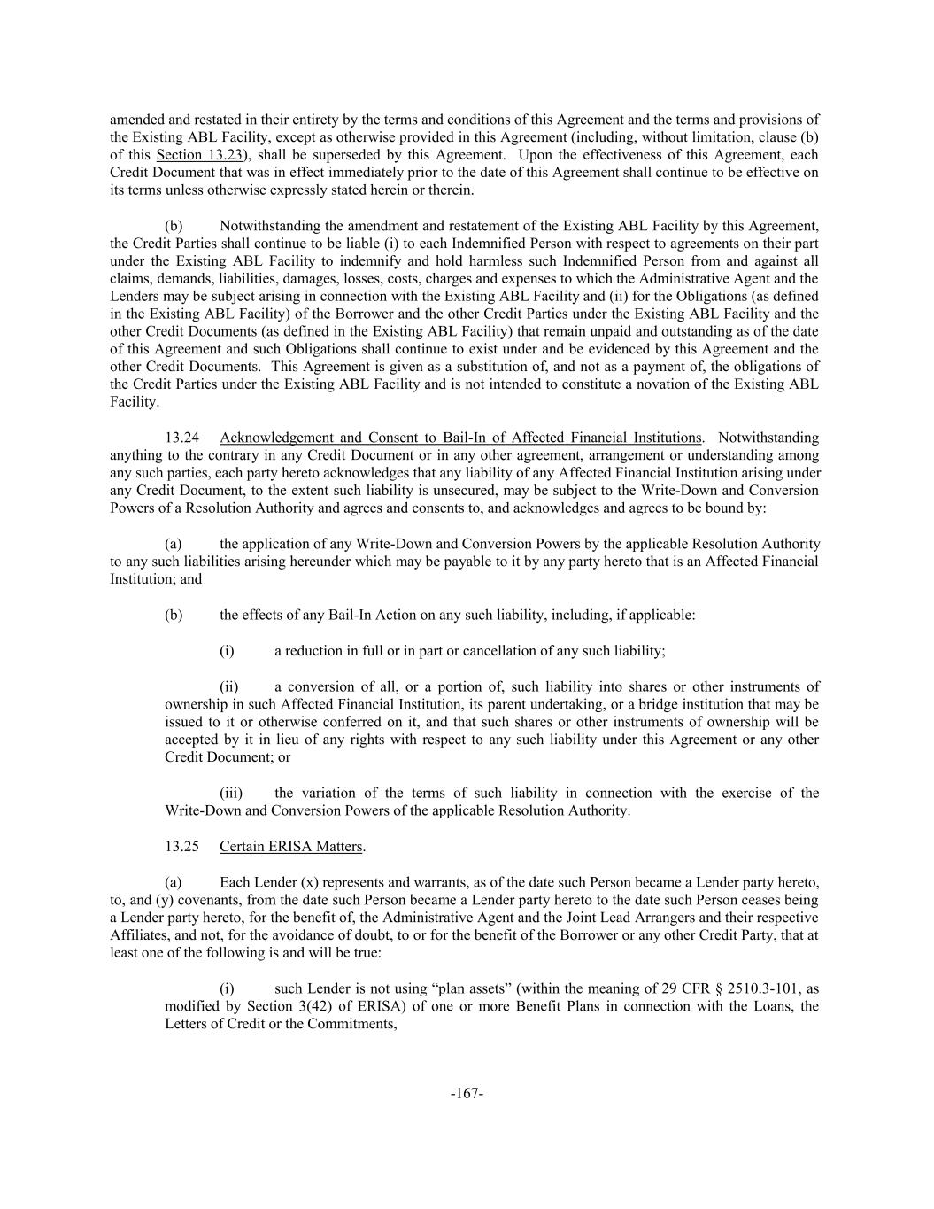 amended and restated in their entirety by the terms and conditions of this Agreement and the terms and provisions of the Existing ABL Facility, except as otherwise provided in this Agreement (including, without limitation, clause (b) of this Section 13.23), shall be superseded by this Agreement. Upon the effectiveness of this Agreement, each Credit Document that was in effect immediately prior to the date of this Agreement shall continue to be effective on its terms unless otherwise expressly stated herein or therein. (b) Notwithstanding the amendment and restatement of the Existing ABL Facility by this Agreement, the Credit Parties shall continue to be liable (i) to each Indemnified Person with respect to agreements on their part under the Existing ABL Facility to indemnify and hold harmless such Indemnified Person from and against all claims, demands, liabilities, damages, losses, costs, charges and expenses to which the Administrative Agent and the Lenders may be subject arising in connection with the Existing ABL Facility and (ii) for the Obligations (as defined in the Existing ABL Facility) of the Borrower and the other Credit Parties under the Existing ABL Facility and the other Credit Documents (as defined in the Existing ABL Facility) that remain unpaid and outstanding as of the date of this Agreement and such Obligations shall continue to exist under and be evidenced by this Agreement and the other Credit Documents. This Agreement is given as a substitution of, and not as a payment of, the obligations of the Credit Parties under the Existing ABL Facility and is not intended to constitute a novation of the Existing ABL Facility. 13.24 Acknowledgement and Consent to Bail-In of Affected Financial Institutions. Notwithstanding anything to the contrary in any Credit Document or in any other agreement, arrangement or understanding among any such parties, each party hereto acknowledges that any liability of any Affected Financial Institution arising under any Credit Document, to the extent such liability is unsecured, may be subject to the Write-Down and Conversion Powers of a Resolution Authority and agrees and consents to, and acknowledges and agrees to be bound by: (a) the application of any Write-Down and Conversion Powers by the applicable Resolution Authority to any such liabilities arising hereunder which may be payable to it by any party hereto that is an Affected Financial Institution; and (b) the effects of any Bail-In Action on any such liability, including, if applicable: (i) a reduction in full or in part or cancellation of any such liability; (ii) a conversion of all, or a portion of, such liability into shares or other instruments of ownership in such Affected Financial Institution, its parent undertaking, or a bridge institution that may be issued to it or otherwise conferred on it, and that such shares or other instruments of ownership will be accepted by it in lieu of any rights with respect to any such liability under this Agreement or any other Credit Document; or (iii) the variation of the terms of such liability in connection with the exercise of the Write-Down and Conversion Powers of the applicable Resolution Authority. 13.25 Certain ERISA Matters. (a) Each Lender (x) represents and warrants, as of the date such Person became a Lender party hereto, to, and (y) covenants, from the date such Person became a Lender party hereto to the date such Person ceases being a Lender party hereto, for the benefit of, the Administrative Agent and the Joint Lead Arrangers and their respective Affiliates, and not, for the avoidance of doubt, to or for the benefit of the Borrower or any other Credit Party, that at least one of the following is and will be true: (i) such Lender is not using “plan assets” (within the meaning of 29 CFR § 2510.3-101, as modified by Section 3(42) of ERISA) of one or more Benefit Plans in connection with the Loans, the Letters of Credit or the Commitments, -167-