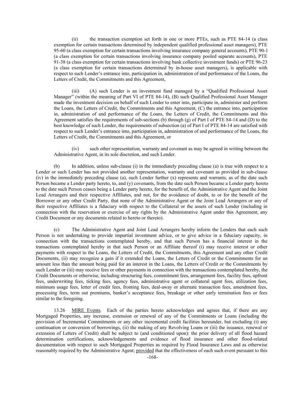 (ii) the transaction exemption set forth in one or more PTEs, such as PTE 84-14 (a class exemption for certain transactions determined by independent qualified professional asset managers), PTE 95-60 (a class exemption for certain transactions involving insurance company general accounts), PTE 90-1 (a class exemption for certain transactions involving insurance company pooled separate accounts), PTE 91-38 (a class exemption for certain transactions involving bank collective investment funds) or PTE 96-23 (a class exemption for certain transactions determined by in-house asset managers), is applicable with respect to such Lender’s entrance into, participation in, administration of and performance of the Loans, the Letters of Credit, the Commitments and this Agreement, (iii) (A) such Lender is an investment fund managed by a “Qualified Professional Asset Manager” (within the meaning of Part VI of PTE 84-14), (B) such Qualified Professional Asset Manager made the investment decision on behalf of such Lender to enter into, participate in, administer and perform the Loans, the Letters of Credit, the Commitments and this Agreement, (C) the entrance into, participation in, administration of and performance of the Loans, the Letters of Credit, the Commitments and this Agreement satisfies the requirements of sub-sections (b) through (g) of Part I of PTE 84-14 and (D) to the best knowledge of such Lender, the requirements of subsection (a) of Part I of PTE 84-14 are satisfied with respect to such Lender’s entrance into, participation in, administration of and performance of the Loans, the Letters of Credit, the Commitments and this Agreement, or (iv) such other representation, warranty and covenant as may be agreed in writing between the Administrative Agent, in its sole discretion, and such Lender. (b) In addition, unless sub-clause (i) in the immediately preceding clause (a) is true with respect to a Lender or such Lender has not provided another representation, warranty and covenant as provided in sub-clause (iv) in the immediately preceding clause (a), such Lender further (x) represents and warrants, as of the date such Person became a Lender party hereto, to, and (y) covenants, from the date such Person became a Lender party hereto to the date such Person ceases being a Lender party hereto, for the benefit of, the Administrative Agent and the Joint Lead Arrangers and their respective Affiliates, and not, for the avoidance of doubt, to or for the benefit of the Borrower or any other Credit Party, that none of the Administrative Agent or the Joint Lead Arrangers or any of their respective Affiliates is a fiduciary with respect to the Collateral or the assets of such Lender (including in connection with the reservation or exercise of any rights by the Administrative Agent under this Agreement, any Credit Document or any documents related to hereto or thereto). (c) The Administrative Agent and Joint Lead Arrangers hereby inform the Lenders that each such Person is not undertaking to provide impartial investment advice, or to give advice in a fiduciary capacity, in connection with the transactions contemplated hereby, and that such Person has a financial interest in the transactions contemplated hereby in that such Person or an Affiliate thereof (i) may receive interest or other payments with respect to the Loans, the Letters of Credit, the Commitments, this Agreement and any other Credit Documents, (ii) may recognize a gain if it extended the Loans, the Letters of Credit or the Commitments for an amount less than the amount being paid for an interest in the Loans, the Letters of Credit or the Commitments by such Lender or (iii) may receive fees or other payments in connection with the transactions contemplated hereby, the Credit Documents or otherwise, including structuring fees, commitment fees, arrangement fees, facility fees, upfront fees, underwriting fees, ticking fees, agency fees, administrative agent or collateral agent fees, utilization fees, minimum usage fees, letter of credit fees, fronting fees, deal-away or alternate transaction fees, amendment fees, processing fees, term out premiums, banker’s acceptance fees, breakage or other early termination fees or fees similar to the foregoing. 13.26 MIRE Events. Each of the parties hereto acknowledges and agrees that, if there are any Mortgaged Properties, any increase, extension or renewal of any of the Commitments or Loans (including the provision of Incremental Commitments or any other incremental credit facilities hereunder, but excluding (i) any continuation or conversion of borrowings, (ii) the making of any Revolving Loans or (iii) the issuance, renewal or extension of Letters of Credit) shall be subject to (and conditioned upon): the prior delivery of all flood hazard determination certifications, acknowledgements and evidence of flood insurance and other flood-related documentation with respect to such Mortgaged Properties as required by Flood Insurance Laws and as otherwise reasonably required by the Administrative Agent; provided that the effectiveness of each such event pursuant to this -168-