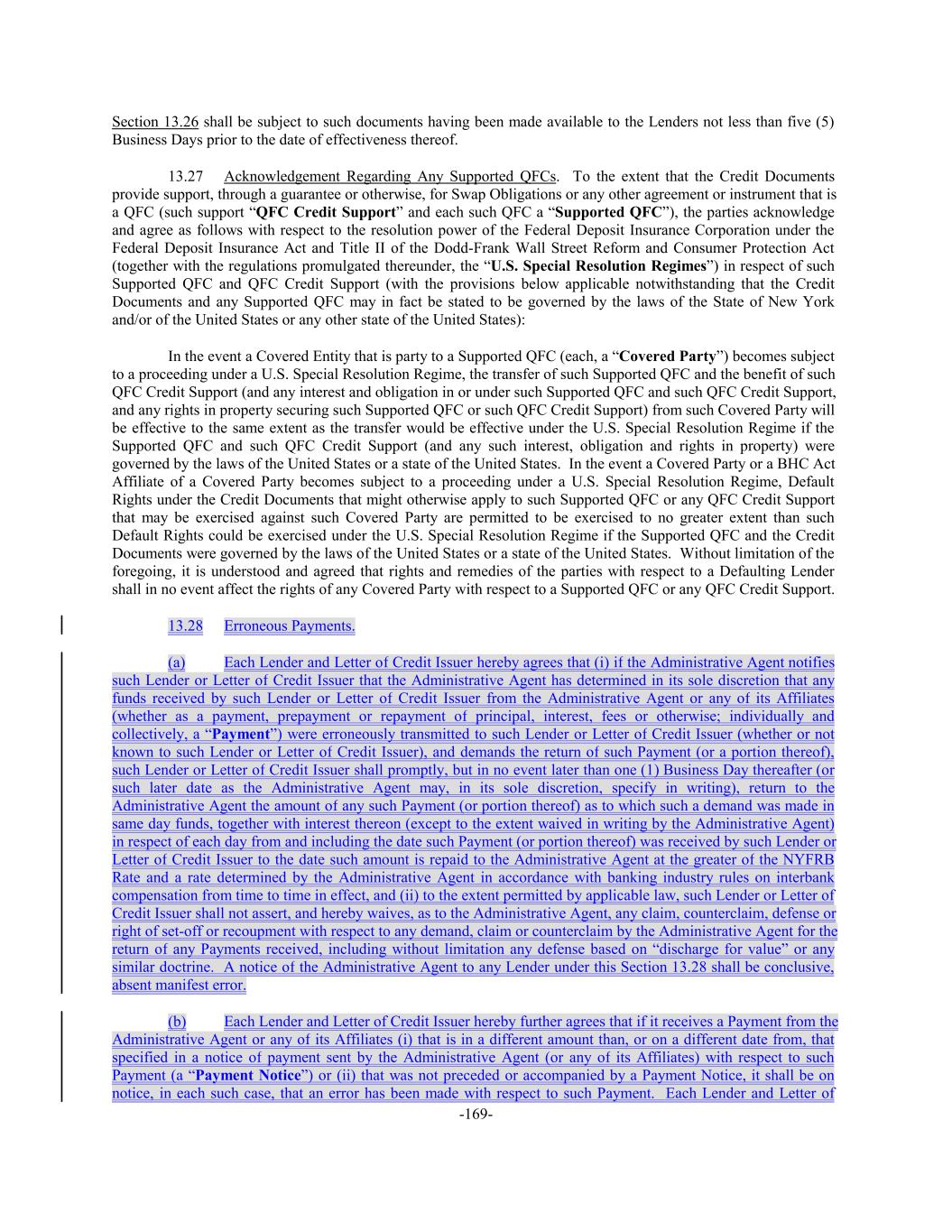 Section 13.26 shall be subject to such documents having been made available to the Lenders not less than five (5) Business Days prior to the date of effectiveness thereof. 13.27 Acknowledgement Regarding Any Supported QFCs. To the extent that the Credit Documents provide support, through a guarantee or otherwise, for Swap Obligations or any other agreement or instrument that is a QFC (such support “QFC Credit Support” and each such QFC a “Supported QFC”), the parties acknowledge and agree as follows with respect to the resolution power of the Federal Deposit Insurance Corporation under the Federal Deposit Insurance Act and Title II of the Dodd-Frank Wall Street Reform and Consumer Protection Act (together with the regulations promulgated thereunder, the “U.S. Special Resolution Regimes”) in respect of such Supported QFC and QFC Credit Support (with the provisions below applicable notwithstanding that the Credit Documents and any Supported QFC may in fact be stated to be governed by the laws of the State of New York and/or of the United States or any other state of the United States): In the event a Covered Entity that is party to a Supported QFC (each, a “Covered Party”) becomes subject to a proceeding under a U.S. Special Resolution Regime, the transfer of such Supported QFC and the benefit of such QFC Credit Support (and any interest and obligation in or under such Supported QFC and such QFC Credit Support, and any rights in property securing such Supported QFC or such QFC Credit Support) from such Covered Party will be effective to the same extent as the transfer would be effective under the U.S. Special Resolution Regime if the Supported QFC and such QFC Credit Support (and any such interest, obligation and rights in property) were governed by the laws of the United States or a state of the United States. In the event a Covered Party or a BHC Act Affiliate of a Covered Party becomes subject to a proceeding under a U.S. Special Resolution Regime, Default Rights under the Credit Documents that might otherwise apply to such Supported QFC or any QFC Credit Support that may be exercised against such Covered Party are permitted to be exercised to no greater extent than such Default Rights could be exercised under the U.S. Special Resolution Regime if the Supported QFC and the Credit Documents were governed by the laws of the United States or a state of the United States. Without limitation of the foregoing, it is understood and agreed that rights and remedies of the parties with respect to a Defaulting Lender shall in no event affect the rights of any Covered Party with respect to a Supported QFC or any QFC Credit Support. 13.28 Erroneous Payments. (a) Each Lender and Letter of Credit Issuer hereby agrees that (i) if the Administrative Agent notifies such Lender or Letter of Credit Issuer that the Administrative Agent has determined in its sole discretion that any funds received by such Lender or Letter of Credit Issuer from the Administrative Agent or any of its Affiliates (whether as a payment, prepayment or repayment of principal, interest, fees or otherwise; individually and collectively, a “Payment”) were erroneously transmitted to such Lender or Letter of Credit Issuer (whether or not known to such Lender or Letter of Credit Issuer), and demands the return of such Payment (or a portion thereof), such Lender or Letter of Credit Issuer shall promptly, but in no event later than one (1) Business Day thereafter (or such later date as the Administrative Agent may, in its sole discretion, specify in writing), return to the Administrative Agent the amount of any such Payment (or portion thereof) as to which such a demand was made in same day funds, together with interest thereon (except to the extent waived in writing by the Administrative Agent) in respect of each day from and including the date such Payment (or portion thereof) was received by such Lender or Letter of Credit Issuer to the date such amount is repaid to the Administrative Agent at the greater of the NYFRB Rate and a rate determined by the Administrative Agent in accordance with banking industry rules on interbank compensation from time to time in effect, and (ii) to the extent permitted by applicable law, such Lender or Letter of Credit Issuer shall not assert, and hereby waives, as to the Administrative Agent, any claim, counterclaim, defense or right of set-off or recoupment with respect to any demand, claim or counterclaim by the Administrative Agent for the return of any Payments received, including without limitation any defense based on “discharge for value” or any similar doctrine. A notice of the Administrative Agent to any Lender under this Section 13.28 shall be conclusive, absent manifest error. (b) Each Lender and Letter of Credit Issuer hereby further agrees that if it receives a Payment from the Administrative Agent or any of its Affiliates (i) that is in a different amount than, or on a different date from, that specified in a notice of payment sent by the Administrative Agent (or any of its Affiliates) with respect to such Payment (a “Payment Notice”) or (ii) that was not preceded or accompanied by a Payment Notice, it shall be on notice, in each such case, that an error has been made with respect to such Payment. Each Lender and Letter of -169-