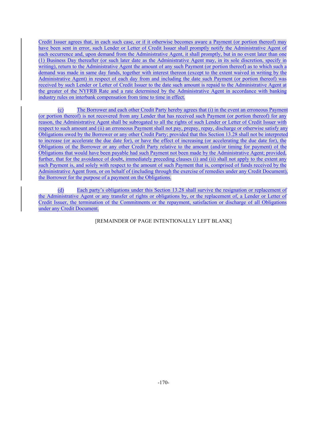 Credit Issuer agrees that, in each such case, or if it otherwise becomes aware a Payment (or portion thereof) may have been sent in error, such Lender or Letter of Credit Issuer shall promptly notify the Administrative Agent of such occurrence and, upon demand from the Administrative Agent, it shall promptly, but in no event later than one (1) Business Day thereafter (or such later date as the Administrative Agent may, in its sole discretion, specify in writing), return to the Administrative Agent the amount of any such Payment (or portion thereof) as to which such a demand was made in same day funds, together with interest thereon (except to the extent waived in writing by the Administrative Agent) in respect of each day from and including the date such Payment (or portion thereof) was received by such Lender or Letter of Credit Issuer to the date such amount is repaid to the Administrative Agent at the greater of the NYFRB Rate and a rate determined by the Administrative Agent in accordance with banking industry rules on interbank compensation from time to time in effect. (c) The Borrower and each other Credit Party hereby agrees that (i) in the event an erroneous Payment (or portion thereof) is not recovered from any Lender that has received such Payment (or portion thereof) for any reason, the Administrative Agent shall be subrogated to all the rights of such Lender or Letter of Credit Issuer with respect to such amount and (ii) an erroneous Payment shall not pay, prepay, repay, discharge or otherwise satisfy any Obligations owed by the Borrower or any other Credit Party; provided that this Section 13.28 shall not be interpreted to increase (or accelerate the due date for), or have the effect of increasing (or accelerating the due date for), the Obligations of the Borrower or any other Credit Party relative to the amount (and/or timing for payment) of the Obligations that would have been payable had such Payment not been made by the Administrative Agent; provided, further, that for the avoidance of doubt, immediately preceding clauses (i) and (ii) shall not apply to the extent any such Payment is, and solely with respect to the amount of such Payment that is, comprised of funds received by the Administrative Agent from, or on behalf of (including through the exercise of remedies under any Credit Document), the Borrower for the purpose of a payment on the Obligations. (d) Each party’s obligations under this Section 13.28 shall survive the resignation or replacement of the Administrative Agent or any transfer of rights or obligations by, or the replacement of, a Lender or Letter of Credit Issuer, the termination of the Commitments or the repayment, satisfaction or discharge of all Obligations under any Credit Document. [REMAINDER OF PAGE INTENTIONALLY LEFT BLANK] -170-