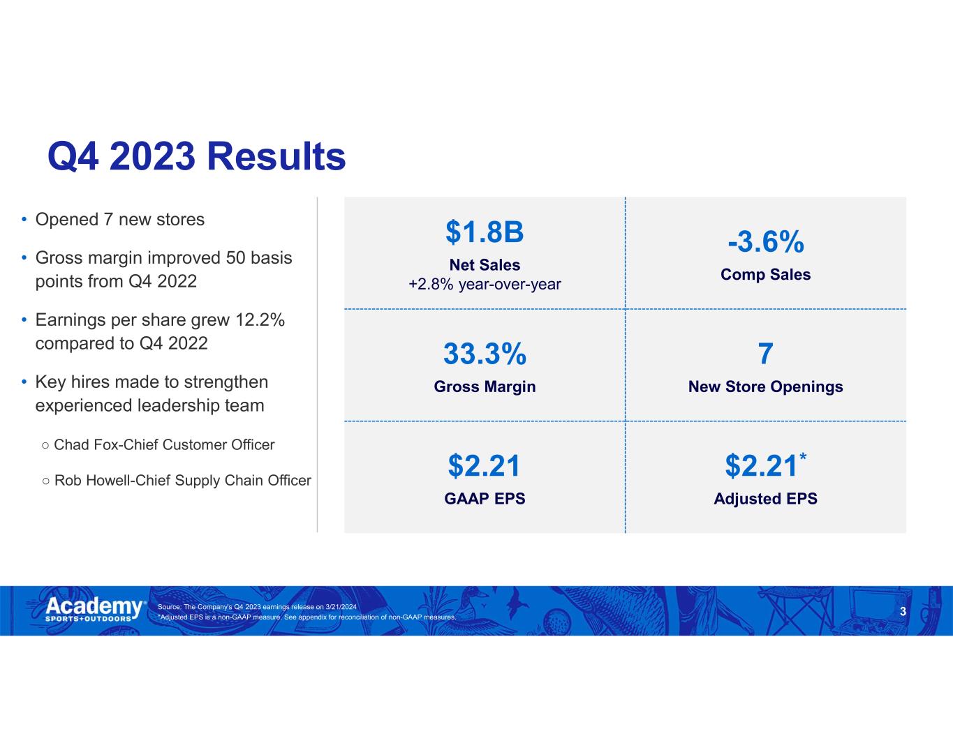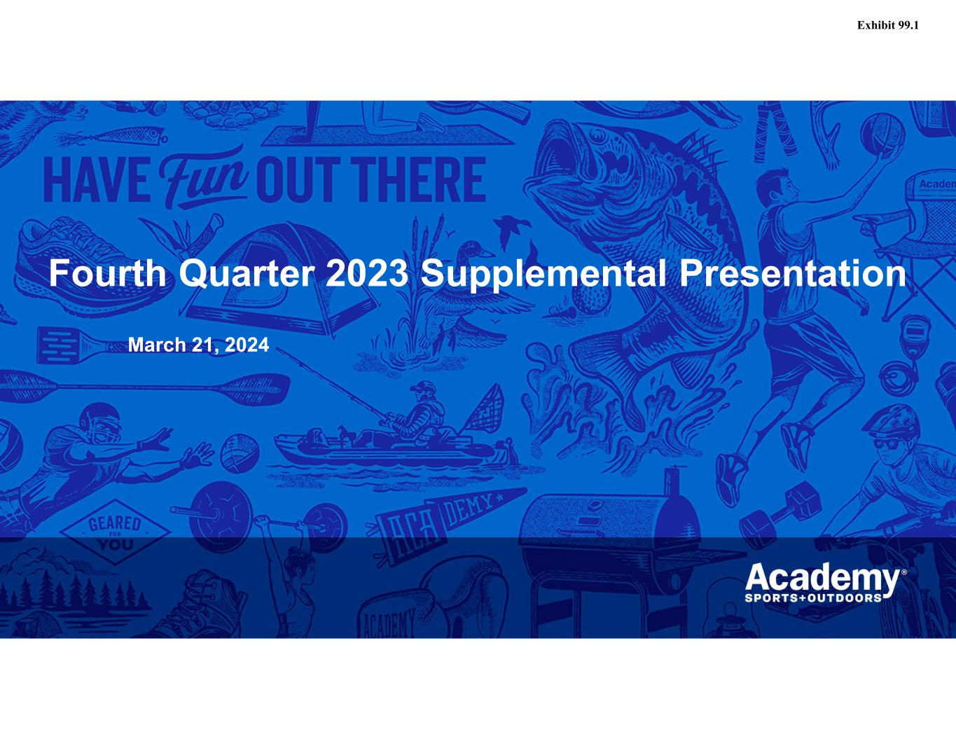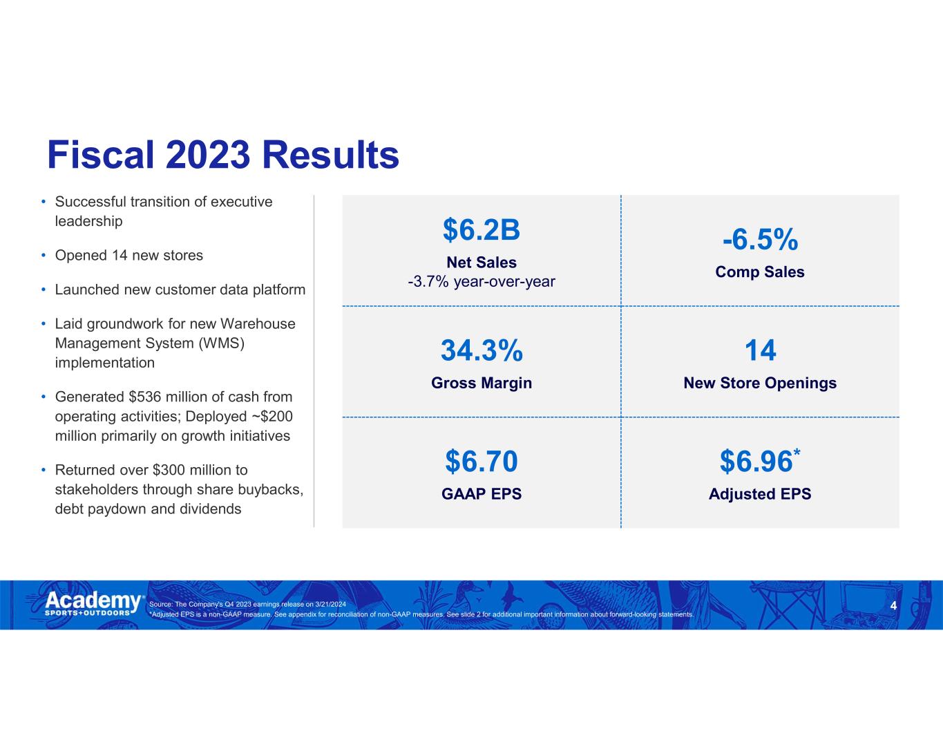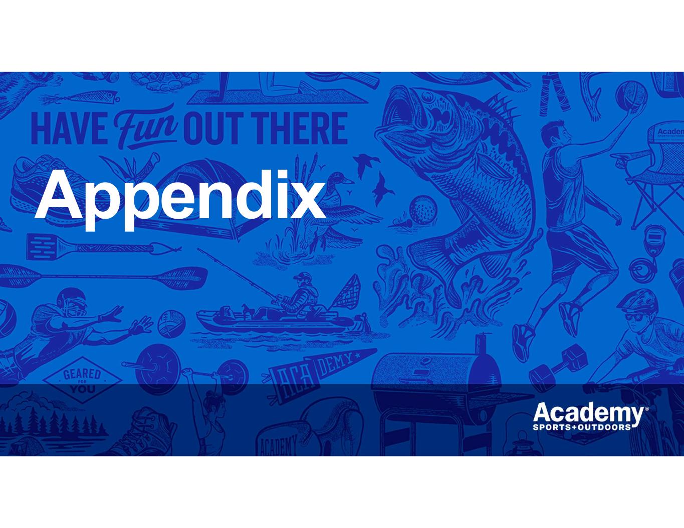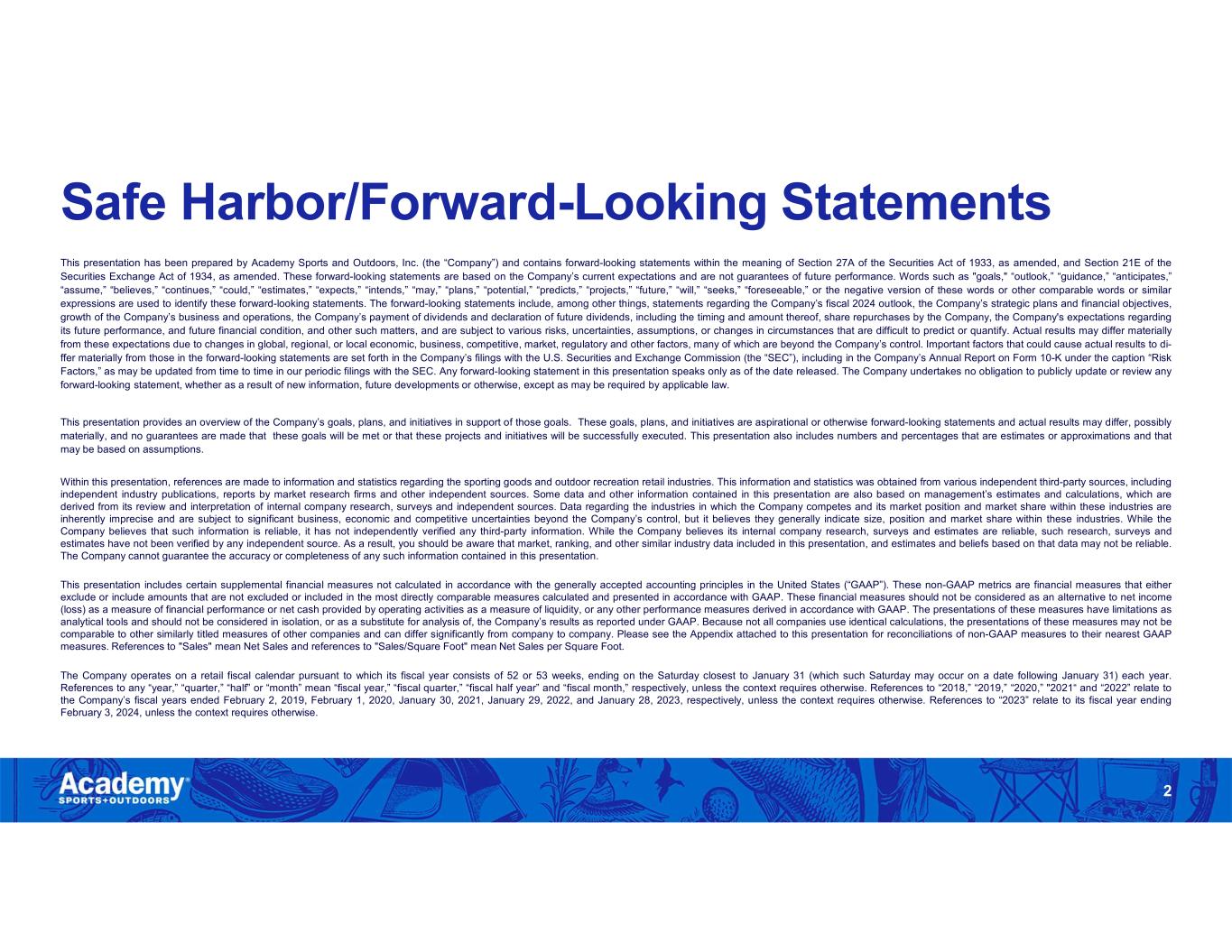 Safe Harbor/Forward-Looking Statements This presentation has been prepared by Academy Sports and Outdoors, Inc. (the “Company”) and contains forward-looking statements within the meaning of Section 27A of the Securities Act of 1933, as amended, and Section 21E of the Securities Exchange Act of 1934, as amended. These forward-looking statements are based on the Company’s current expectations and are not guarantees of future performance. Words such as "goals," “outlook,” “guidance,” “anticipates,” “assume,” “believes,” “continues,” “could,” “estimates,” “expects,” “intends,” “may,” “plans,” “potential,” “predicts,” “projects,” “future,” “will,” “seeks,” “foreseeable,” or the negative version of these words or other comparable words or similar expressions are used to identify these forward-looking statements. The forward-looking statements include, among other things, statements regarding the Company’s fiscal 2024 outlook, the Company’s strategic plans and financial objectives, growth of the Company’s business and operations, the Company’s payment of dividends and declaration of future dividends, including the timing and amount thereof, share repurchases by the Company, the Company's expectations regarding its future performance, and future financial condition, and other such matters, and are subject to various risks, uncertainties, assumptions, or changes in circumstances that are difficult to predict or quantify. Actual results may differ materially from these expectations due to changes in global, regional, or local economic, business, competitive, market, regulatory and other factors, many of which are beyond the Company’s control. Important factors that could cause actual results to di- ffer materially from those in the forward-looking statements are set forth in the Company’s filings with the U.S. Securities and Exchange Commission (the “SEC”), including in the Company’s Annual Report on Form 10-K under the caption “Risk Factors,” as may be updated from time to time in our periodic filings with the SEC. Any forward-looking statement in this presentation speaks only as of the date released. The Company undertakes no obligation to publicly update or review any forward-looking statement, whether as a result of new information, future developments or otherwise, except as may be required by applicable law. This presentation provides an overview of the Company’s goals, plans, and initiatives in support of those goals. These goals, plans, and initiatives are aspirational or otherwise forward-looking statements and actual results may differ, possibly materially, and no guarantees are made that these goals will be met or that these projects and initiatives will be successfully executed. This presentation also includes numbers and percentages that are estimates or approximations and that may be based on assumptions. Within this presentation, references are made to information and statistics regarding the sporting goods and outdoor recreation retail industries. This information and statistics was obtained from various independent third-party sources, including independent industry publications, reports by market research firms and other independent sources. Some data and other information contained in this presentation are also based on management’s estimates and calculations, which are derived from its review and interpretation of internal company research, surveys and independent sources. Data regarding the industries in which the Company competes and its market position and market share within these industries are inherently imprecise and are subject to significant business, economic and competitive uncertainties beyond the Company’s control, but it believes they generally indicate size, position and market share within these industries. While the Company believes that such information is reliable, it has not independently verified any third-party information. While the Company believes its internal company research, surveys and estimates are reliable, such research, surveys and estimates have not been verified by any independent source. As a result, you should be aware that market, ranking, and other similar industry data included in this presentation, and estimates and beliefs based on that data may not be reliable. The Company cannot guarantee the accuracy or completeness of any such information contained in this presentation. This presentation includes certain supplemental financial measures not calculated in accordance with the generally accepted accounting principles in the United States (“GAAP”). These non-GAAP metrics are financial measures that either exclude or include amounts that are not excluded or included in the most directly comparable measures calculated and presented in accordance with GAAP. These financial measures should not be considered as an alternative to net income (loss) as a measure of financial performance or net cash provided by operating activities as a measure of liquidity, or any other performance measures derived in accordance with GAAP. The presentations of these measures have limitations as analytical tools and should not be considered in isolation, or as a substitute for analysis of, the Company’s results as reported under GAAP. Because not all companies use identical calculations, the presentations of these measures may not be comparable to other similarly titled measures of other companies and can differ significantly from company to company. Please see the Appendix attached to this presentation for reconciliations of non-GAAP measures to their nearest GAAP measures. References to "Sales" mean Net Sales and references to "Sales/Square Foot" mean Net Sales per Square Foot. The Company operates on a retail fiscal calendar pursuant to which its fiscal year consists of 52 or 53 weeks, ending on the Saturday closest to January 31 (which such Satu