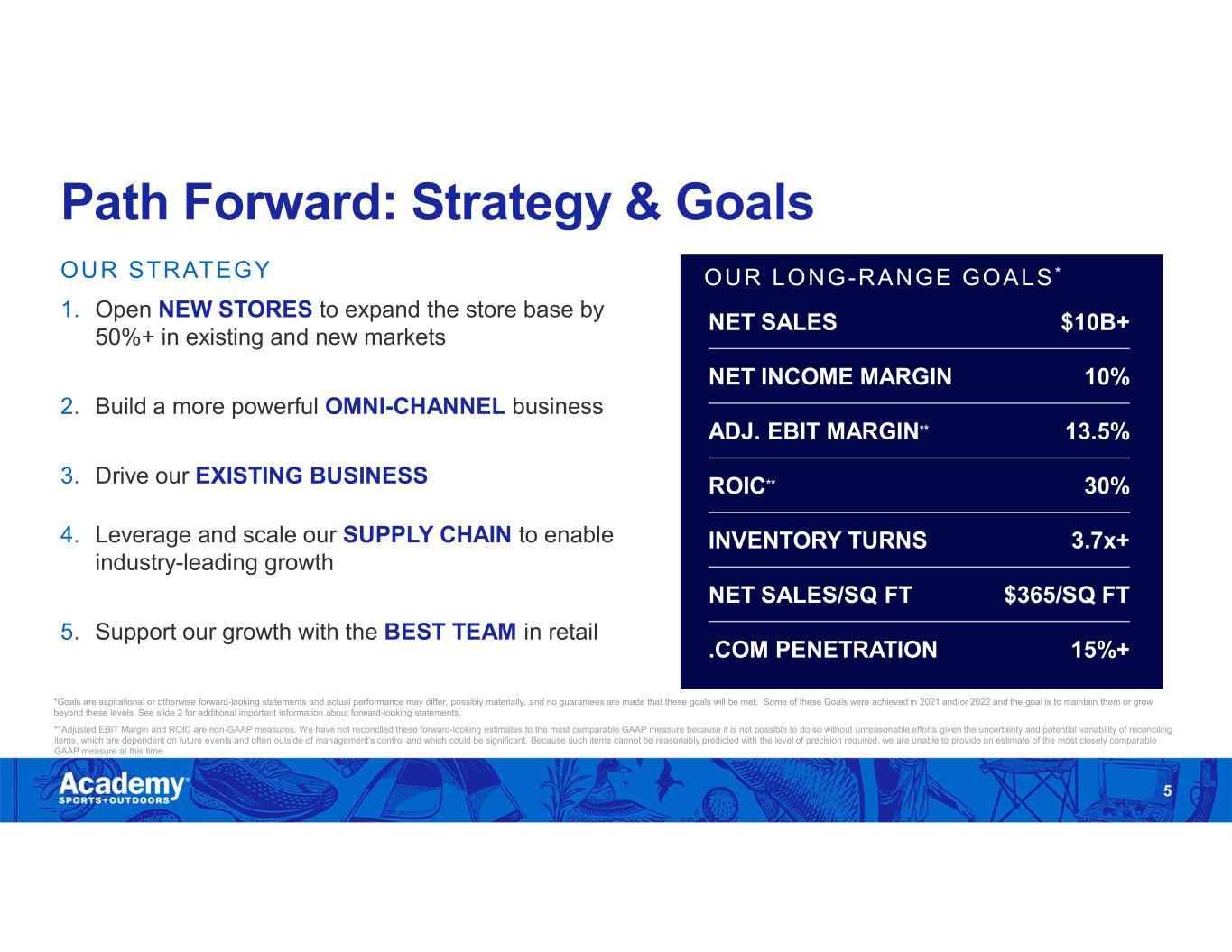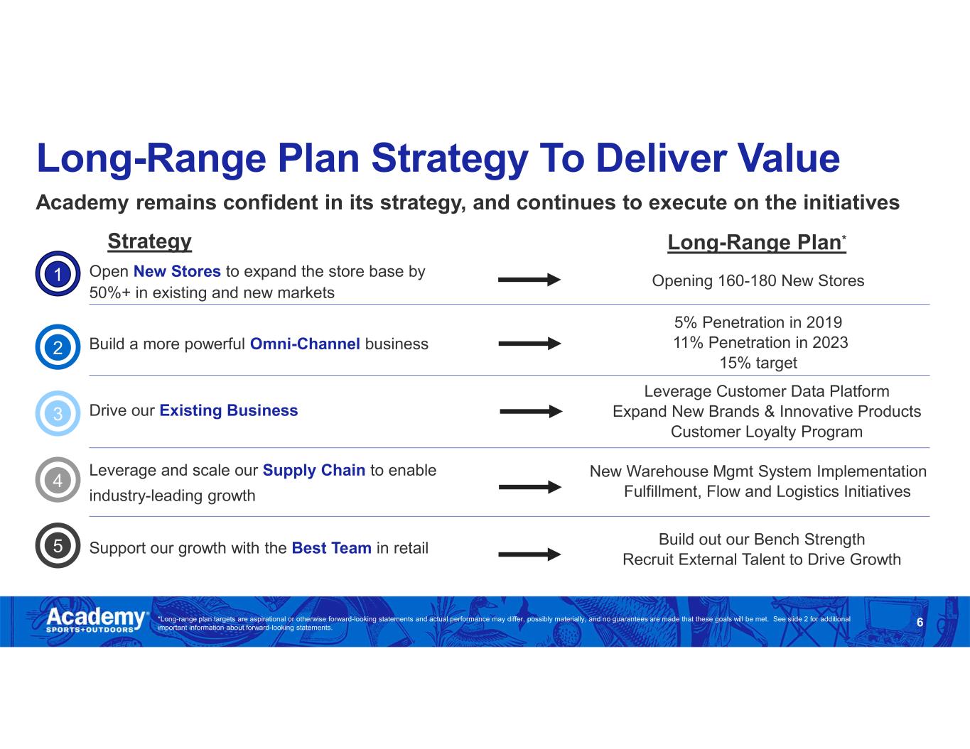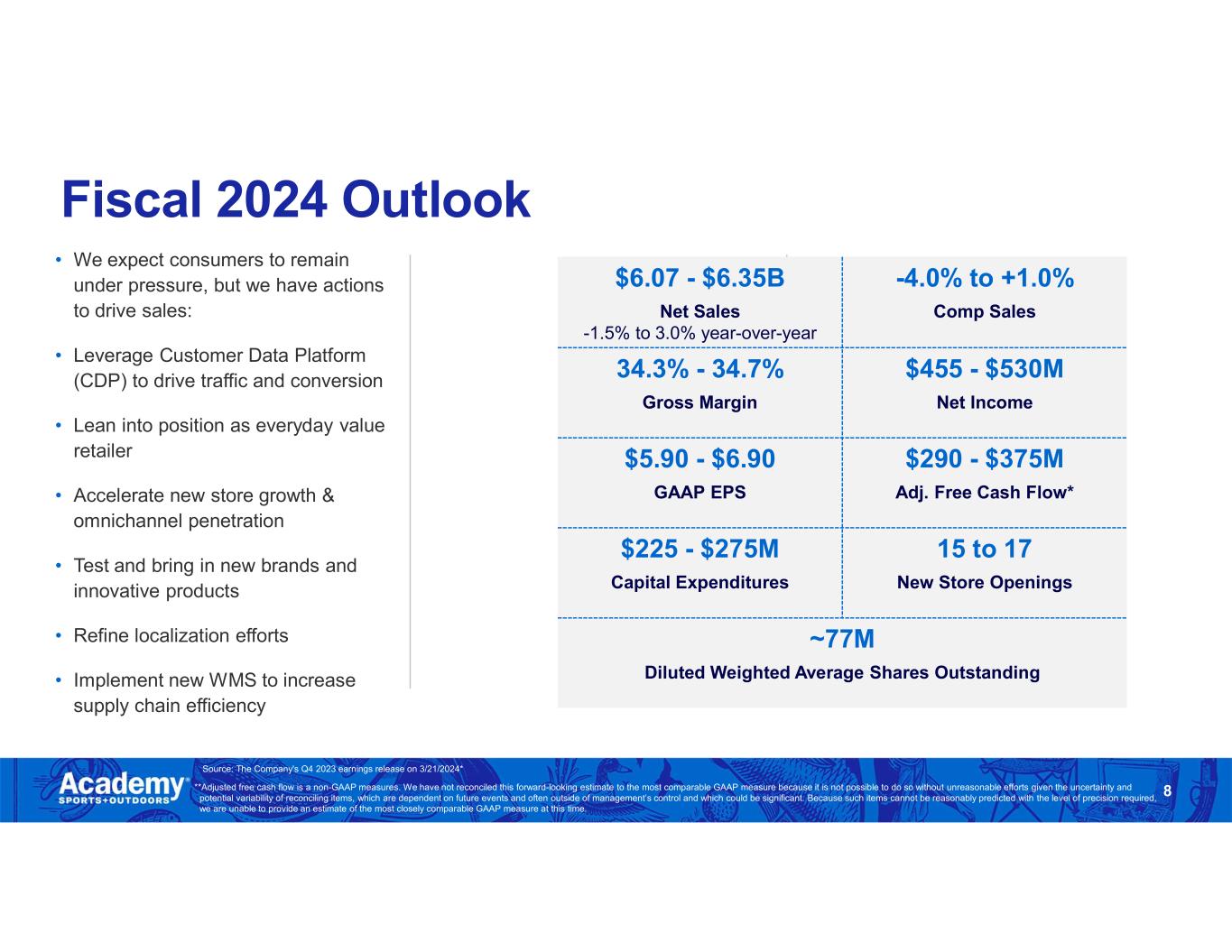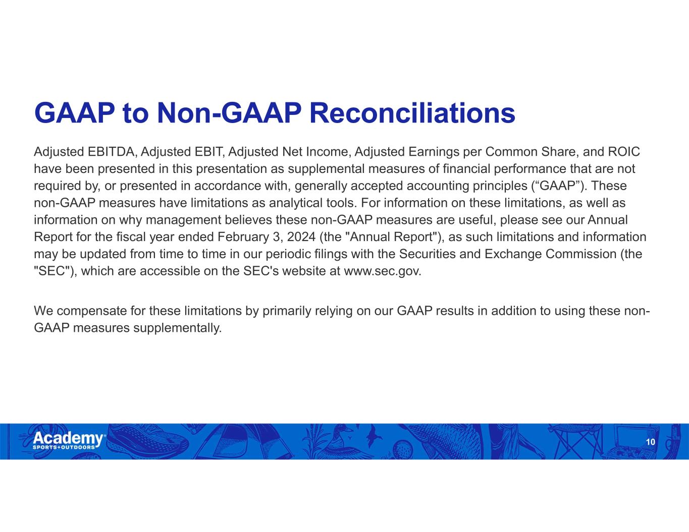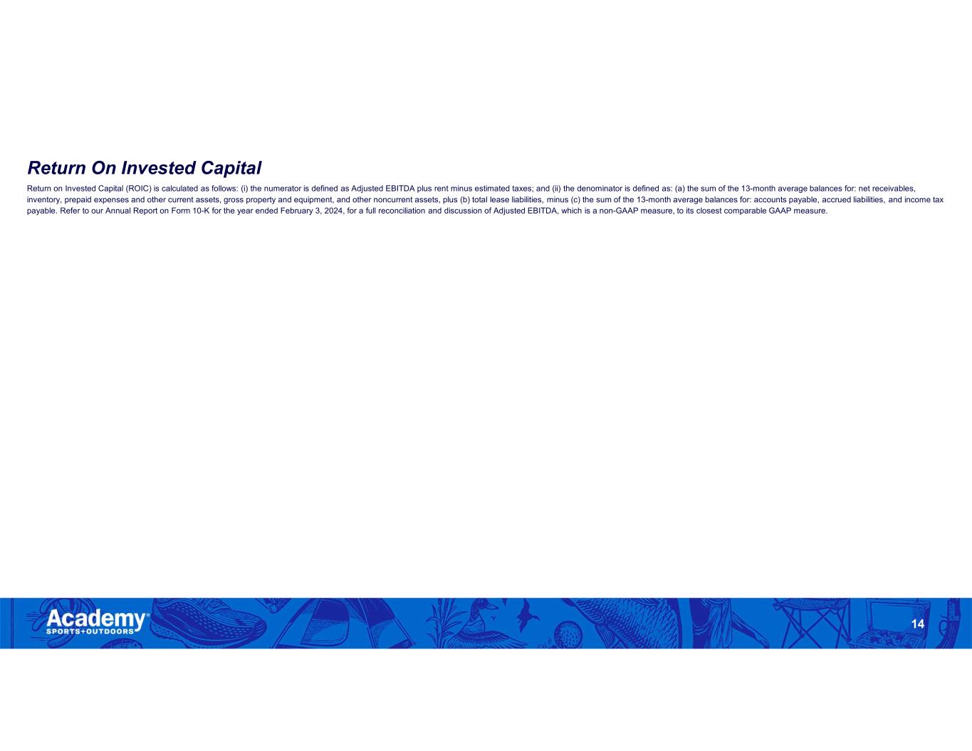 Safe Harbor/Forward-Looking Statements This presentation has been prepared by Academy Sports and Outdoors, Inc. (the “Company”) and contains forward-looking statements within the meaning of Section 27A of the Securities Act of 1933, as amended, and Section 21E of the Securities Exchange Act of 1934, as amended. These forward-looking statements are based on the Company’s current expectations and are not guarantees of future performance. Words such as "goals," “outlook,” “guidance,” “anticipates,” “assume,” “believes,” “continues,” “could,” “estimates,” “expects,” “intends,” “may,” “plans,” “potential,” “predicts,” “projects,” “future,” “will,” “seeks,” “foreseeable,” or the negative version of these words or other comparable words or similar expressions are used to identify these forward-looking statements. The forward-looking statements include, among other things, statements regarding the Company’s fiscal 2024 outlook, the Company’s strategic plans and financial objectives, growth of the Company’s business and operations, the Company’s payment of dividends and declaration of future dividends, including the timing and amount thereof, share repurchases by the Company, the Company's expectations regarding its future performance, and future financial condition, and other such matters, and are subject to various risks, uncertainties, assumptions, or changes in circumstances that are difficult to predict or quantify. Actual results may differ materially from these expectations due to changes in global, regional, or local economic, business, competitive, market, regulatory and other factors, many of which are beyond the Company’s control. Important factors that could cause actual results to di- ffer materially from those in the forward-looking statements are set forth in the Company’s filings with the U.S. Securities and Exchange Commission (the “SEC”), including in the Company’s Annual Report on Form 10-K under the caption “Risk Factors,” as may be updated from time to time in our periodic filings with the SEC. Any forward-looking statement in this presentation speaks only as of the date released. The Company undertakes no obligation to publicly update or review any forward-looking statement, whether as a result of new information, future developments or otherwise, except as may be required by applicable law. This presentation provides an overview of the Company’s goals, plans, and initiatives in support of those goals. These goals, plans, and initiatives are aspirational or otherwise forward-looking statements and actual results may differ, possibly materially, and no guarantees are made that these goals will be met or that these projects and initiatives will be successfully executed. This presentation also includes numbers and percentages that are estimates or approximations and that may be based on assumptions. Within this presentation, references are made to information and statistics regarding the sporting goods and outdoor recreation retail industries. This information and statistics was obtained from various independent third-party sources, including independent industry publications, reports by market research firms and other independent sources. Some data and other information contained in this presentation are also based on management’s estimates and calculations, which are derived from its review and interpretation of internal company research, surveys and independent sources. Data regarding the industries in which the Company competes and its market position and market share within these industries are inherently imprecise and are subject to significant business, economic and competitive uncertainties beyond the Company’s control, but it believes they generally indicate size, position and market share within these industries. While the Company believes that such information is reliable, it has not independently verified any third-party information. While the Company believes its internal company research, surveys and estimates are reliable, such research, surveys and estimates have not been verified by any independent source. As a result, you should be aware that market, ranking, and other similar industry data included in this presentation, and estimates and beliefs based on that data may not be reliable. The Company cannot guarantee the accuracy or completeness of any such information contained in this presentation. This presentation includes certain supplemental financial measures not calculated in accordance with the generally accepted accounting principles in the United States (“GAAP”). These non-GAAP metrics are financial measures that either exclude or include amounts that are not excluded or included in the most directly comparable measures calculated and presented in accordance with GAAP. These financial measures should not be considered as an alternative to net income (loss) as a measure of financial performance or net cash provided by operating activities as a measure of liquidity, or any other performance measures derived in accordance with GAAP. The presentations of these measures have limitations as analytical tools and should not be considered in isolation, or as a substitute for analysis of, the Company’s results as reported under GAAP. Because not all companies use identical calculations, the presentations of these measures may not be comparable to other similarly titled measures of other companies and can differ significantly from company to company. Please see the Appendix attached to this presentation for reconciliations of non-GAAP measures to their nearest GAAP measures. References to "Sales" mean Net Sales and references to "Sales/Square Foot" mean Net Sales per Square Foot. The Company operates on a retail fiscal calendar pursuant to which its fiscal year consists of 52 or 53 weeks, ending on the Saturday closest to January 31 (which such Satu