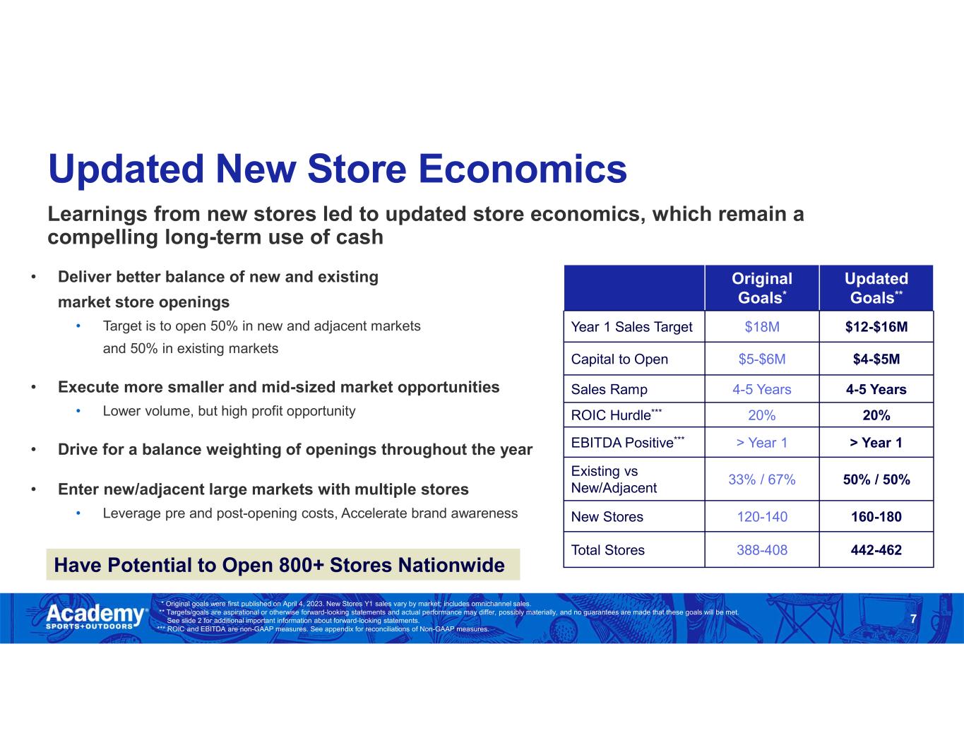 Long-Range Plan Strategy To Deliver Value Academy remains confident in its strategy, and continues to execute on the initiatives 6 1 Open New Stores to expand the store base by 50%+ in existing and new markets Build a more powerful Omni-Channel business Drive our Existing Business Leverage and scale our Supply Chain to enable industry-leading growth Support our growth with the Best Team in retail Strategy Long-Range Plan* Opening 160-180 New Stores 5% Penetration in 2019 11% Penetration in 2023 15% target Leverage Customer Data Platform Expand New Brands & Innovative Products Customer Loyalty Program New Warehouse Mgmt System Implementation Fulfillment, Flow and Logistics Initiatives Build out our Bench Strength Recruit External Talent to Drive Growth 2 3 4 5 *Long-range plan targets are aspirational or otherwise forward-looking statements and actual performance may differ, possibly materially, and no guarantees are made that these goals will be met. See slide 2 for additional important information about forward-looking statements.