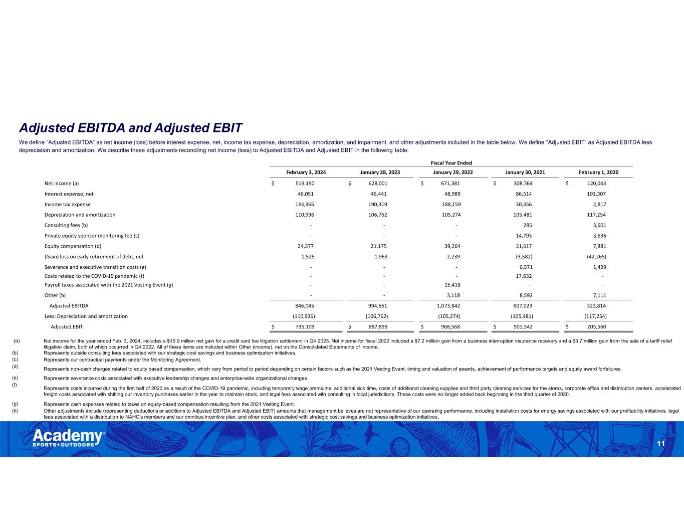 We define “Adjusted EBITDA” as net income (loss) before interest expense, net, income tax expense, depreciation, amortization, and impairment, and other adjustments included in the table below. We define “Adjusted EBIT” as Adjusted EBITDA less depreciation and amortization. We describe these adjustments reconciling net income (loss) to Adjusted EBITDA and Adjusted EBIT in the following table. 11 Adjusted EBITDA and Adjusted EBIT Net income for the year ended Feb. 3, 2024, includes a $15.9 million net gain for a credit card fee litigation settlement in Q4 2023. Net income for fiscal 2022 included a $7.2 million gain from a business interruption insurance recovery and a $3.7 million gain from the sale of a tariff relief litigation claim, both of which occurred in Q4 2022. All of these items are included within Other (income), net on the Consolidated Statements of Income. Represents outside consulting fees associated with our strategic cost savings and business optimization initiatives. (a) (b) Represents our contractual payments under the Monitoring Agreement.(c) Represents non-cash charges related to equity based compensation, which vary from period to period depending on certain factors such as the 2021 Vesting Event, timing and valuation of awards, achievement of performance targets and equity award forfeitures.(d) Represents severance costs associated with executive leadership changes and enterprise-wide organizational changes.(e) Represents costs incurred during the first half of 2020 as a result of the COVID-19 pandemic, including temporary wage premiums, additional sick time, costs of additional cleaning supplies and third party cleaning services for the stores, corporate office and distribution centers, accelerated freight costs associated with shifting our inventory purchases earlier in the year to maintain stock, and legal fees associated with consulting in local jurisdictions. These costs were no longer added back beginning in the third quarter of 2020. (f) Represents cash expenses related to taxes on equity-based compensation resulting from the 2021 Vesting Event.(g) Other adjustments include (representing deductions or additions to Adjusted EBITDA and Adjusted EBIT) amounts that management believes are not representative of our operating performance, including installation costs for energy savings associated with our profitability initiatives, legal fees associated with a distribution to NAHC's members and our omnibus incentive plan, and other costs associated with strategic cost savings and business optimization initiatives. (h) Fiscal Year Ended February 1, 2020January 30, 2021January 29, 2022January 28, 2023February 3, 2024 $ 120,043 $ 308,764 $ 671,381 $ 628,001 $ 519,190 Net income (a) 101,307 86,514 48,989 46,441 46,051 Interest expense, net 2,817 30,356 188,159 190,319 143,966 Income tax expense 117,254 105,481 105,274 106,762 110,936 Depreciation and amortization 3,601 285 ---Consulting fees (b) 3,636 14,793 ---Private equity sponsor monitoring fee (c) 7,881 31,617 39,264 21,175 24,377 Equity compensation (d) (42,265)(3,582)2,239 1,963 1,525 (Gain) loss on early retirement of debt, net 1,429 6,571 ---Severance and executive transition costs (e) -17,632 ---Costs related to the COVID-19 pandemic (f) --15,418 --Payroll taxes associated with the 2021 Vesting Event (g) 7,111 8,592 3,118 --Other (h) 322,814 607,023 1,073,842 994,661 846,045 Adjusted EBITDA (117,254)(105,481)(105,274)(106,762)(110,936)Less: Depreciation and amortization $ 205,560 $ 501,542 $ 968,568 $ 887,899 $ 735,109 Adjusted EBIT