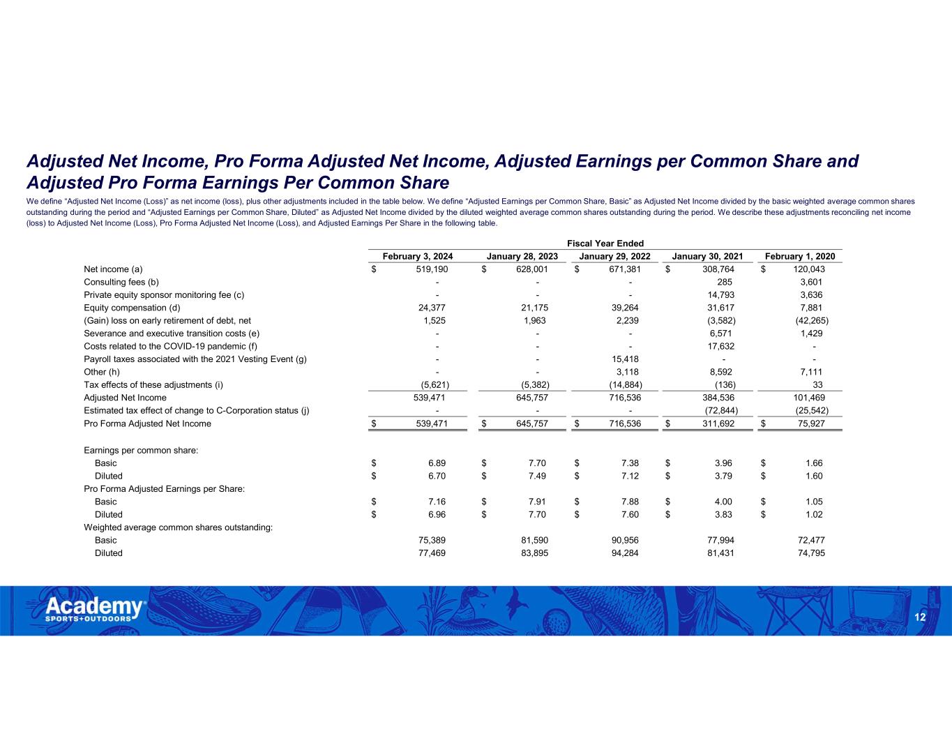We define “Adjusted Net Income (Loss)” as net income (loss), plus other adjustments included in the table below. We define “Adjusted Earnings per Common Share, Basic” as Adjusted Net Income divided by the basic weighted average common shares outstanding during the period and “Adjusted Earnings per Common Share, Diluted” as Adjusted Net Income divided by the diluted weighted average common shares outstanding during the period. We describe these adjustments reconciling net income (loss) to Adjusted Net Income (Loss), Pro Forma Adjusted Net Income (Loss), and Adjusted Earnings Per Share in the following table. 12 Adjusted Net Income, Pro Forma Adjusted Net Income, Adjusted Earnings per Common Share and Adjusted Pro Forma Earnings Per Common Share Fiscal Year Ended February 1, 2020January 30, 2021January 29, 2022January 28, 2023February 3, 2024 $ 120,043 $ 308,764 $ 671,381 $ 628,001 $ 519,190 Net income (a) 3,601 285 ---Consulting fees (b) 3,636 14,793 ---Private equity sponsor monitoring fee (c) 7,881 31,617 39,264 21,175 24,377 Equity compensation (d) (42,265)(3,582)2,239 1,963 1,525 (Gain) loss on early retirement of debt, net 1,429 6,571 ---Severance and executive transition costs (e) -17,632 ---Costs related to the COVID-19 pandemic (f) --15,418 --Payroll taxes associated with the 2021 Vesting Event (g) 7,111 8,592 3,118 --Other (h) 33 (136)(14,884)(5,382)(5,621)Tax effects of these adjustments (i) 101,469 384,536 716,536 645,757 539,471 Adjusted Net Income (25,542)(72,844)---Estimated tax effect of change to C-Corporation status (j) $ 75,927 $ 311,692 $ 716,536 $ 645,757 $ 539,471 Pro Forma Adjusted Net Income Earnings per common share: $ 1.66 $ 3.96 $ 7.38 $ 7.70 $ 6.89 Basic $ 1.60 $ 3.79 $ 7.12 $ 7.49 $ 6.70 Diluted Pro Forma Adjusted Earnings per Share: $ 1.05 $ 4.00 $ 7.88 $ 7.91 $ 7.16 Basic $ 1.02 $ 3.83 $ 7.60 $ 7.70 $ 6.96 Diluted Weighted average common shares outstanding: 72,477 77,994 90,956 81,590 75,389 Basic 74,795 81,431 94,284 83,895 77,469 Diluted